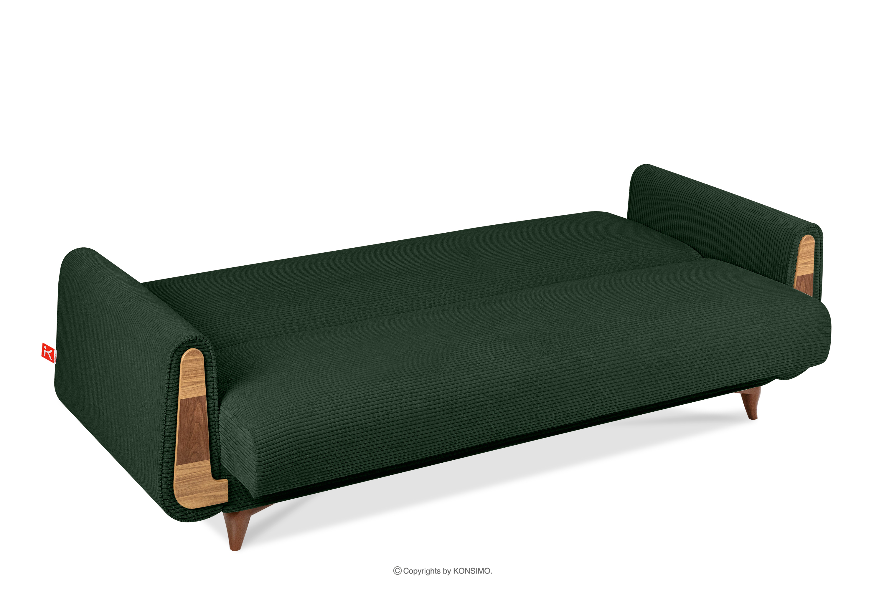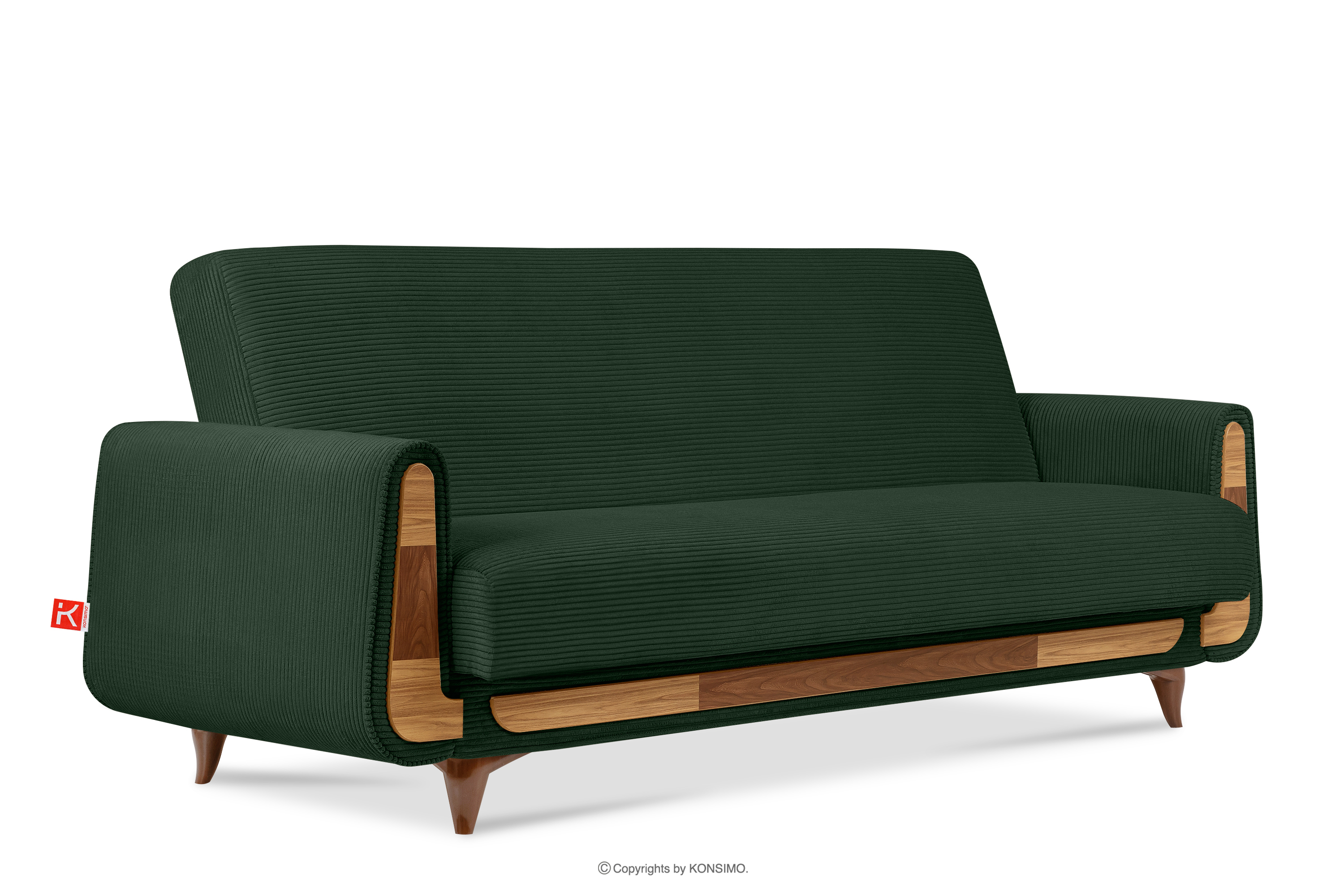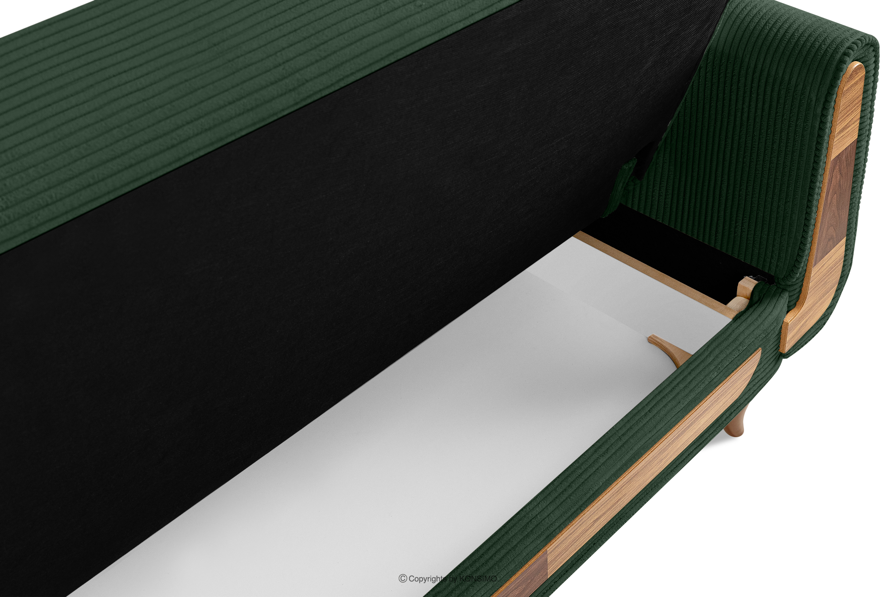 Das dreisitzige ausziehbare Sofa aus dunkelgrünem Kordstoff ist ein Möbelstück im Vintage-Stil. Es wurde für höchste Ansprüche gefertigt. Es findet auch in eleganten und loftartigen Räumen seinen perfekten Platz. Der Stoff, mit dem das Sofa gepolstert ist, fühlt sich sehr angenehm an und ist leicht zu reinigen. Ein weiterer großer Vorteil ist die Schlaffunktion und ein Behälter für die Aufbewahrung von Bettzeug, was die Ordnung definitiv erleichtert.