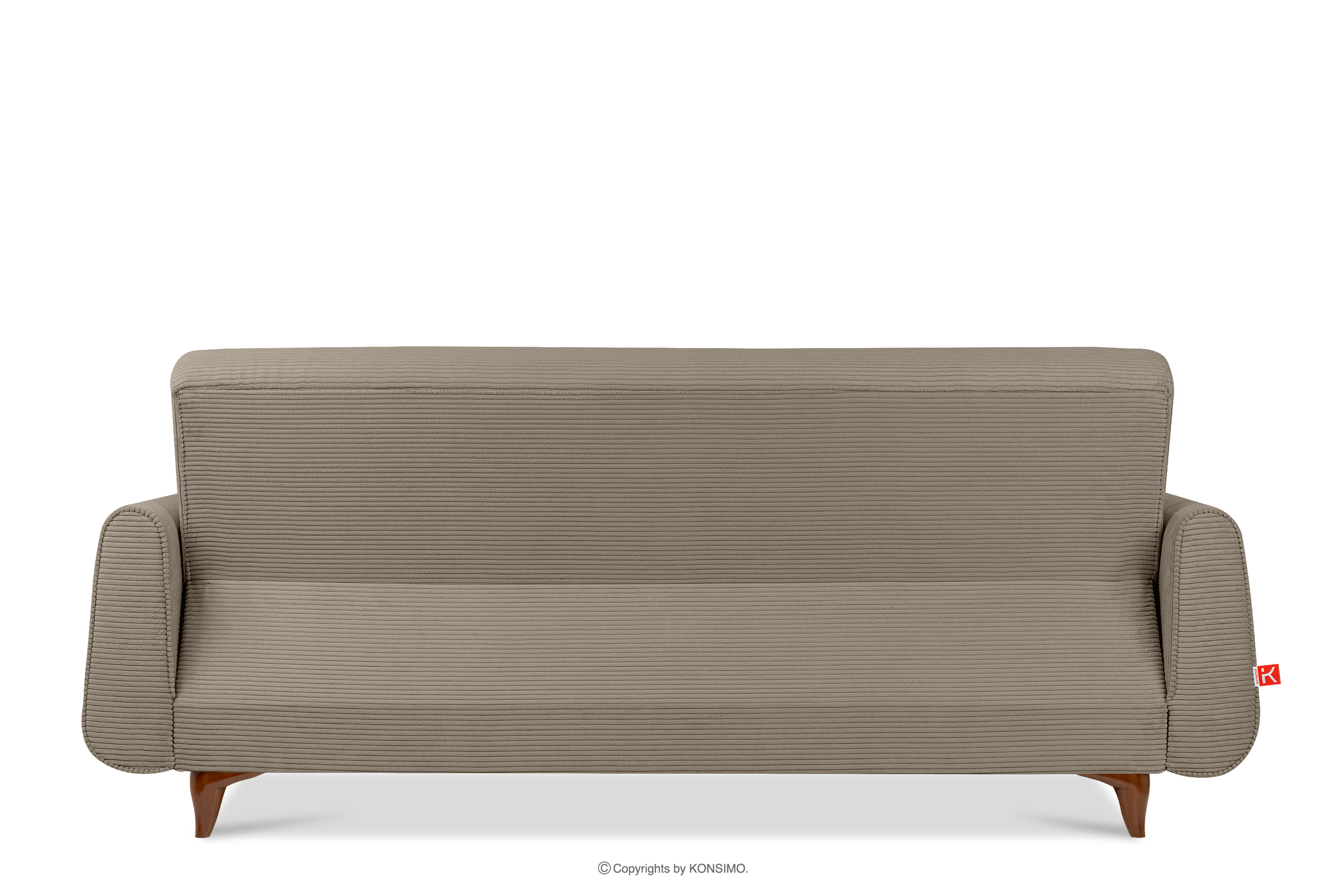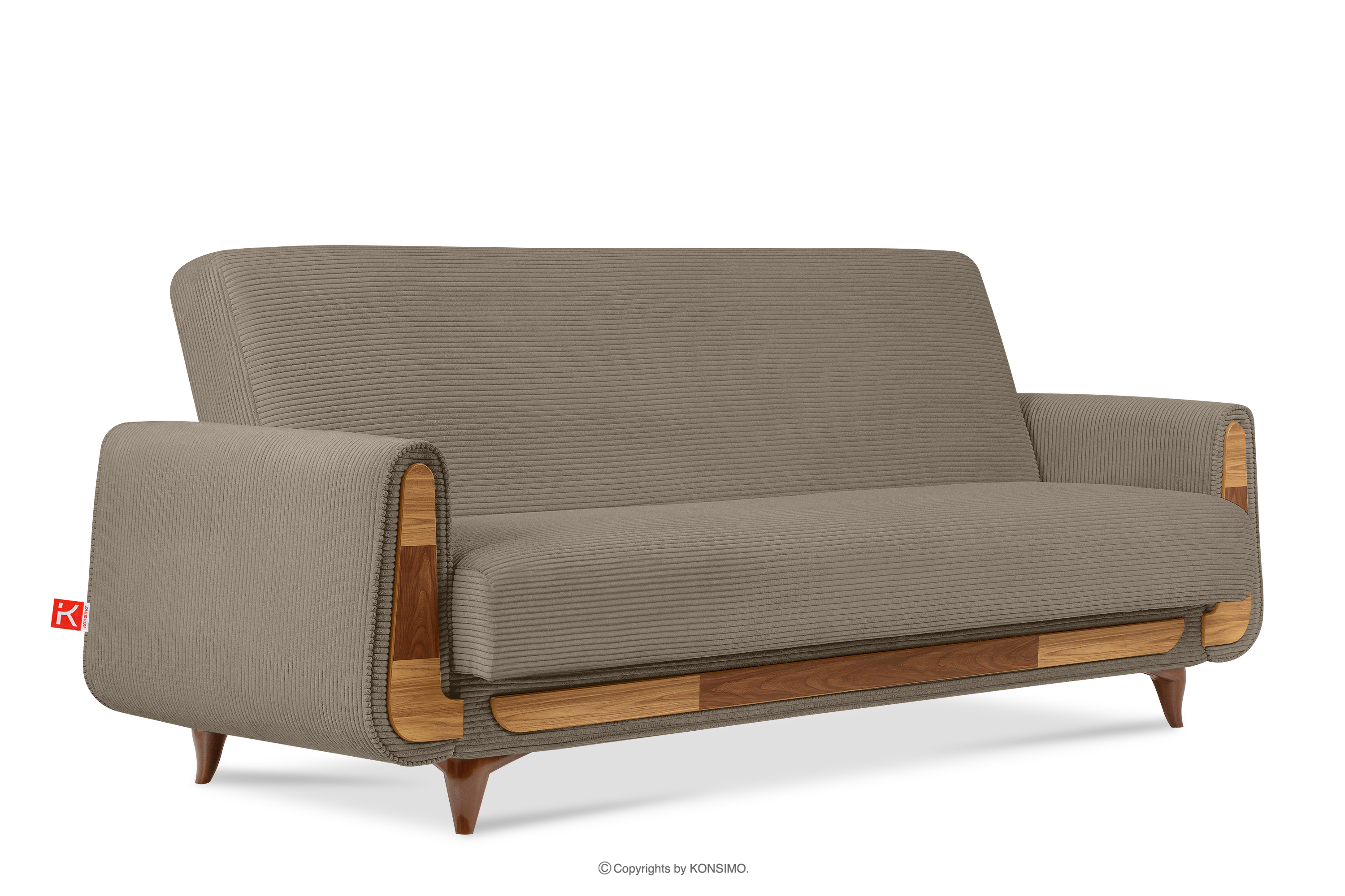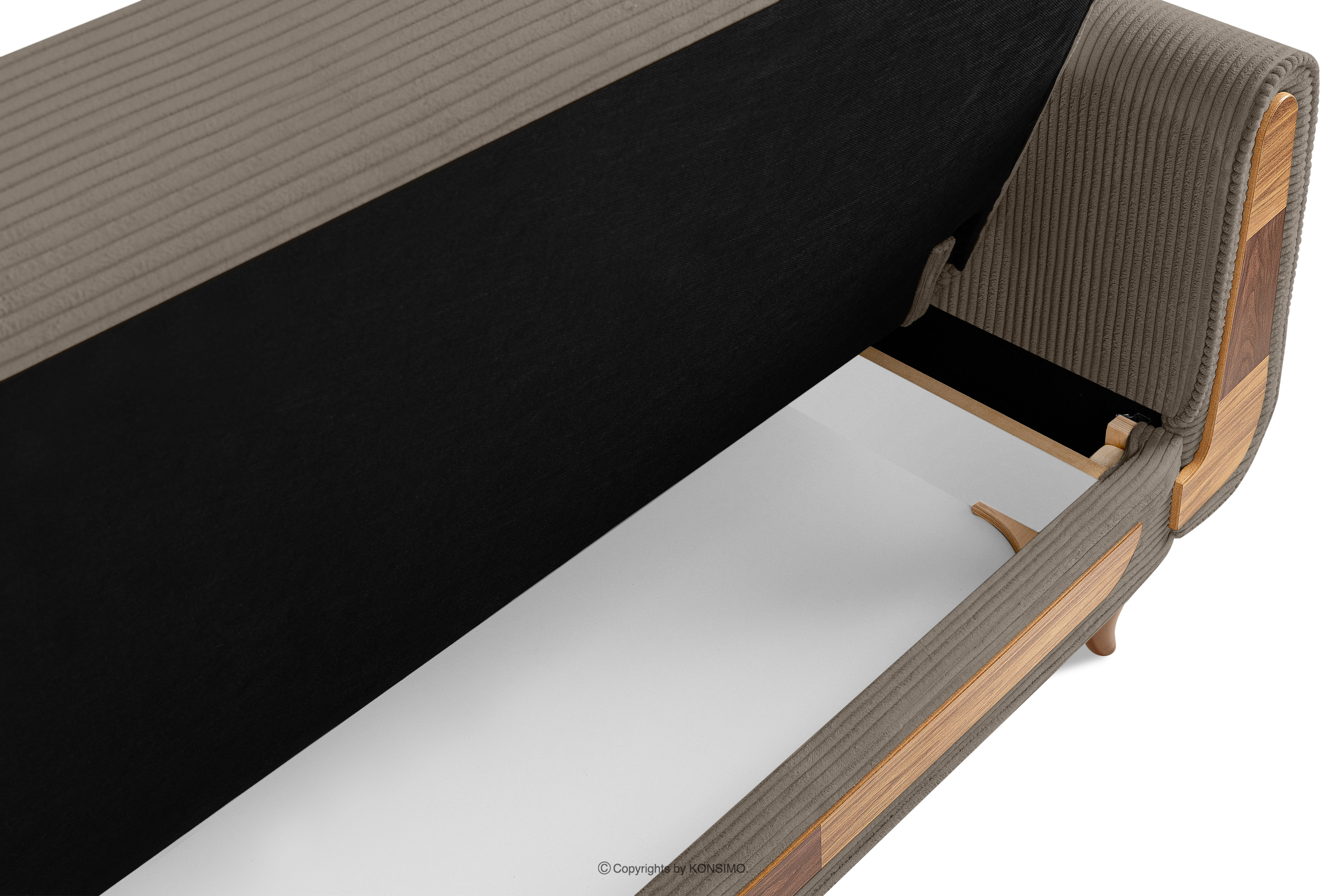 Das dreisitzige ausziehbare Sofa aus beigem Kordstoff ist ein Möbelstück im Vintage-Stil. Es wurde für höchste Ansprüche gefertigt. Es findet auch in eleganten und loftartigen Räumen seinen perfekten Platz. Der Stoff, mit dem das Sofa gepolstert ist, fühlt sich sehr angenehm an und ist leicht zu reinigen. Ein weiterer großer Vorteil ist die Schlaffunktion und ein Behälter für die Aufbewahrung von Bettzeug, was die Ordnung erheblich erleichtert.