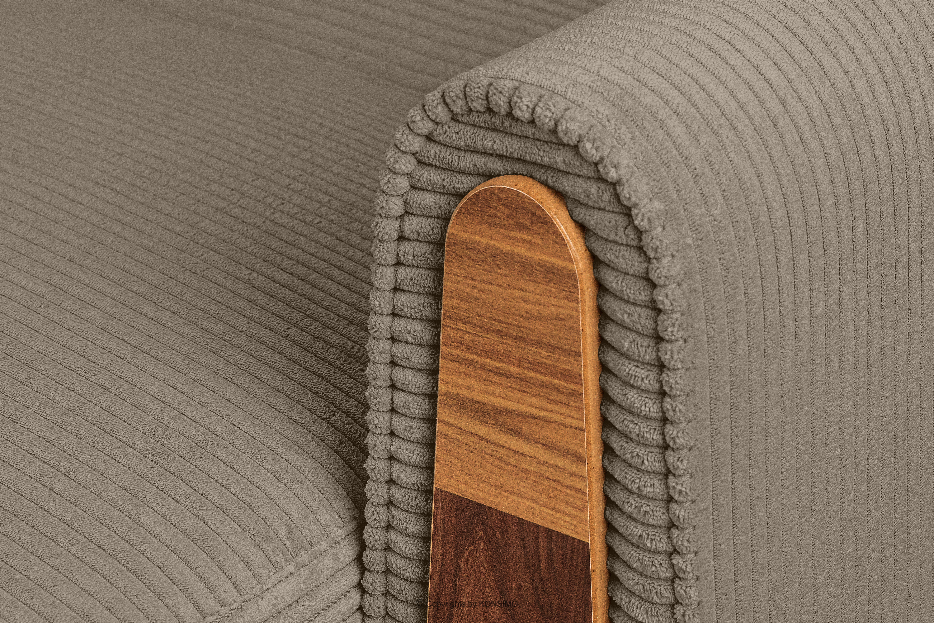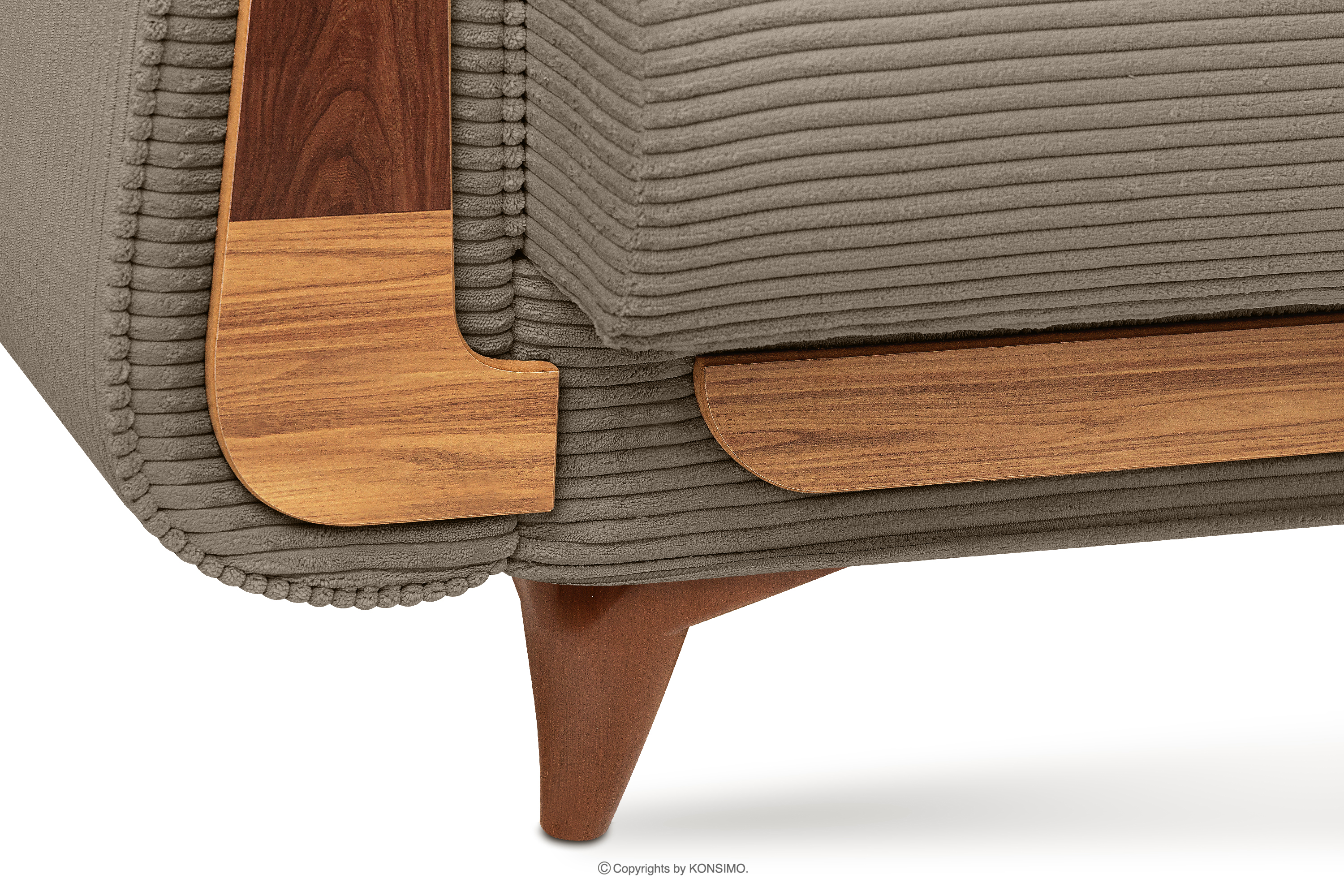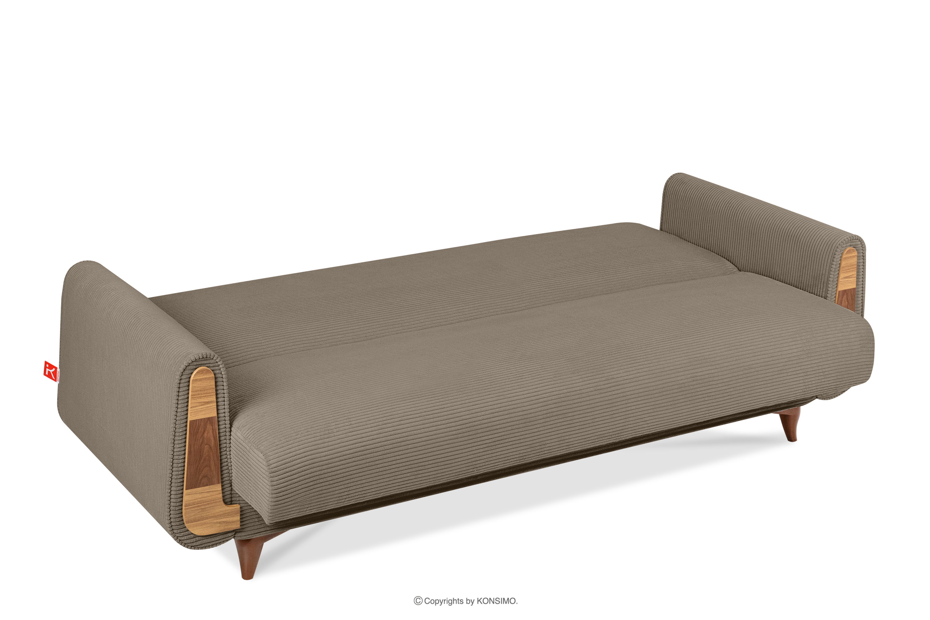 Das dreisitzige ausziehbare Sofa aus beigem Kordstoff ist ein Möbelstück im Vintage-Stil. Es wurde für höchste Ansprüche gefertigt. Es findet auch in eleganten und loftartigen Räumen seinen perfekten Platz. Der Stoff, mit dem das Sofa gepolstert ist, fühlt sich sehr angenehm an und ist leicht zu reinigen. Ein weiterer großer Vorteil ist die Schlaffunktion und ein Behälter für die Aufbewahrung von Bettzeug, was die Ordnung erheblich erleichtert.