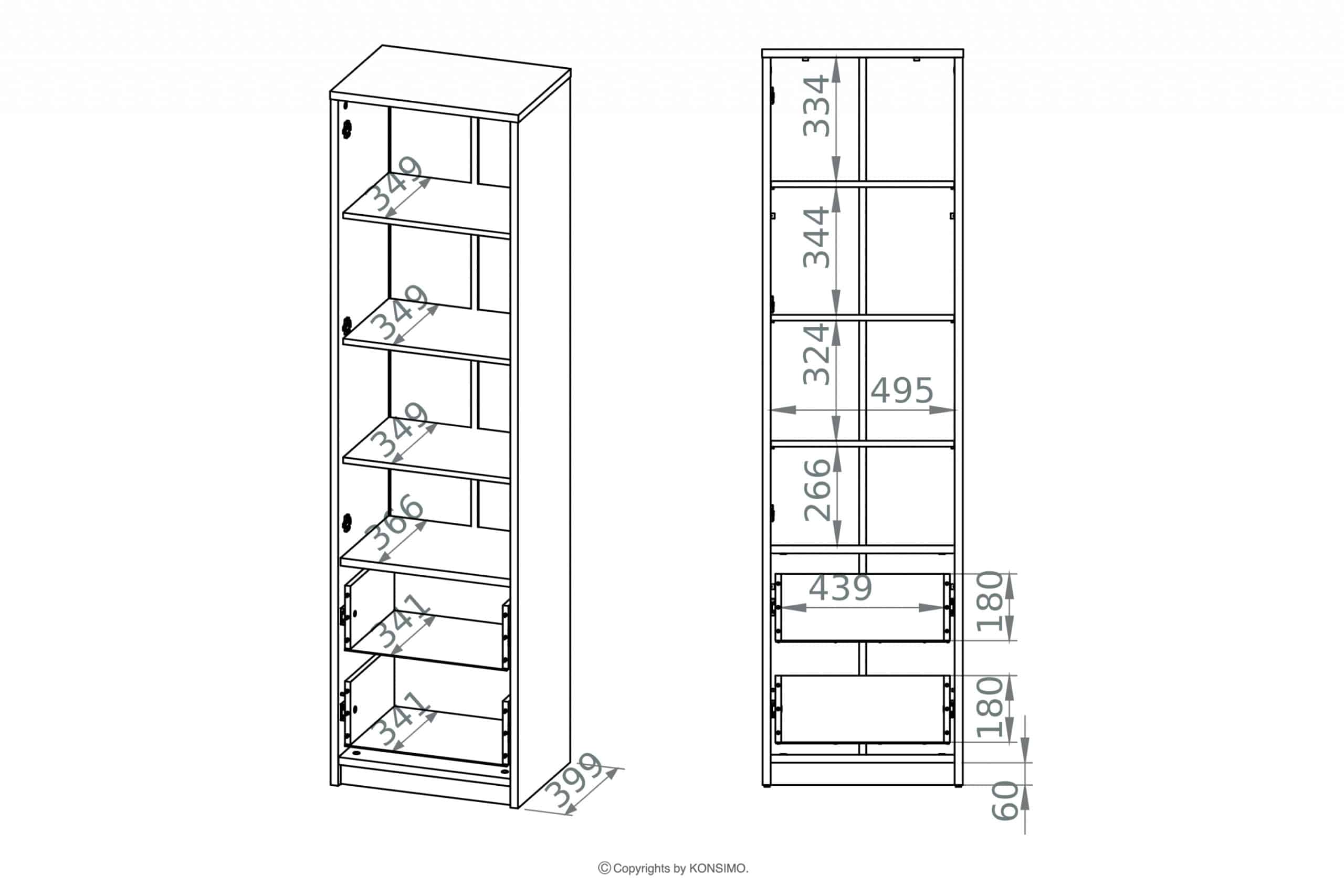 Dieses Möbelstück aus der PONGO-Kollektion ermöglicht sicherlich eine effiziente Organisation des Raums für jeden Teenager. Das Regal in kleinem Format mit stabiler Konstruktion verfügt über zwei bequeme Schubladen im unteren Teil und geräumige Regalböden im oberen Teil. Die ungewöhnlichen, kontrastreichen Griffe in Form von zwei weißen Leisten verleihen dem Möbelstück ein originelles Aussehen.
