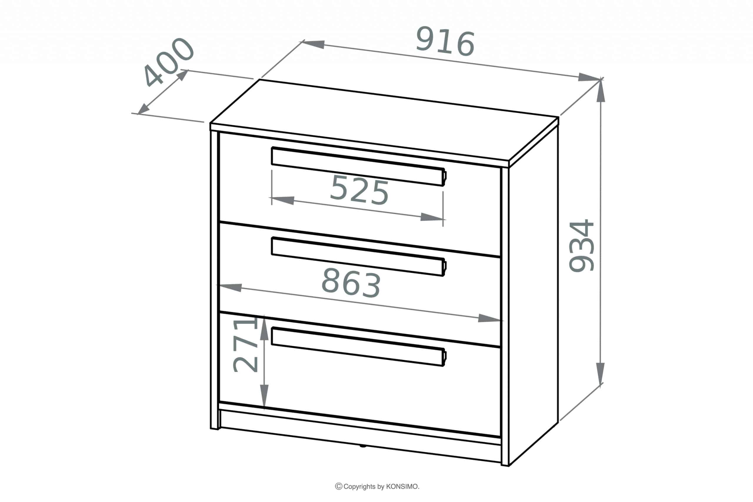 Die originale Kommode aus der PONGO-Kollektion ist ein Möbelstück, dessen Einfachheit, Farbauswahl und solide Verarbeitung auch die anspruchsvollsten Kunden begeistern werden. Sie verfügt über drei bequeme Schubladen, die so konzipiert wurden, um ihre Belastbarkeit maximal zu erhöhen. Dadurch ist dieses Möbelstück nicht nur sehr ästhetisch, sondern auch langlebig und robust. Zu den weiteren Merkmalen, die diese Kommode von anderen unterscheiden, gehören die originellen, geometrischen Griffe, die perfekt zu den glatten Fronten passen.