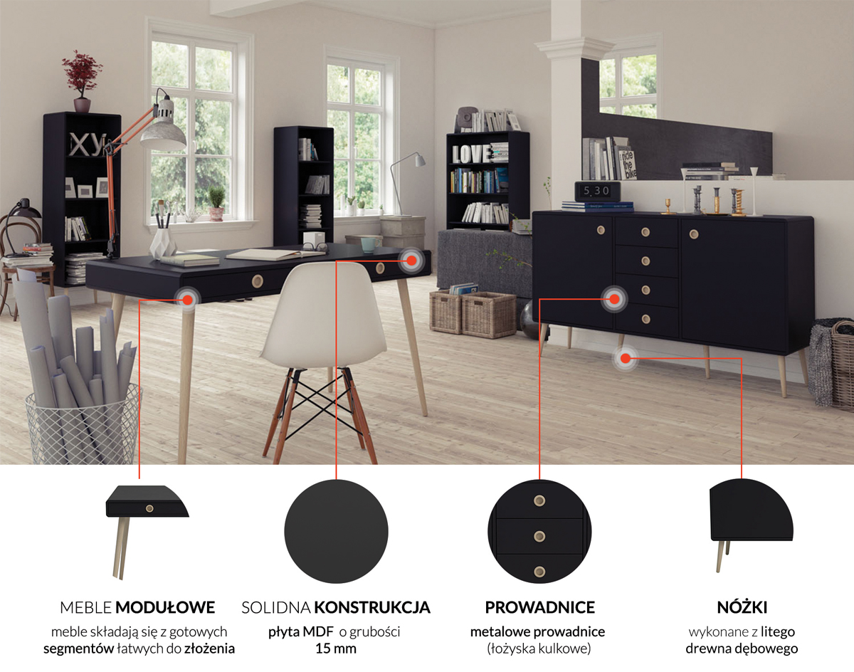 Er ist mit Beinen und Griffen aus massiver Eiche versehen. Der Schreibtisch verfügt über 2 Schubladen, in denen Notizbücher, Schreibutensilien oder sogar ein kleiner Computer Platz finden. Der kleine SOFTLINE-Schreibtisch besteht aus hochwertigen Vormaterialien, einer robusten Platte, die mit einer ästhetischen und abriebfesten Folie überzogen ist, sowie präzisen Führungssystemen, die ein einfaches Öffnen der Schubladen ermöglichen.