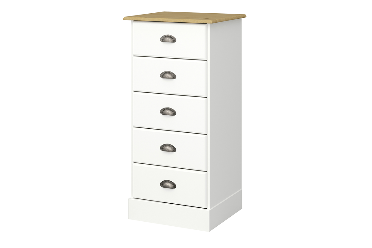 Schmaler Schrank mit 5 geräumigen Schubladen und einer Kontrastfarbenen Arbeitsplatte. Dieses schöne Möbelstück vereint schlichte Form, interessante, raffinierte Metallverzierungen und eine mutige Farbgebung und ist dadurch ein klassisches, aber charaktervolles Möbelstück. Dieser schmale Schrank ist in Weiß und Schwarz erhältlich, wobei die Arbeitsplatte in beiden Versionen aus naturfarbener Kiefer besteht. Der hohe Schrank NOLA ist ein solides Möbelstück, das mit Liebe zum Detail und aus robusten, bewährten Materialien hergestellt wurde.