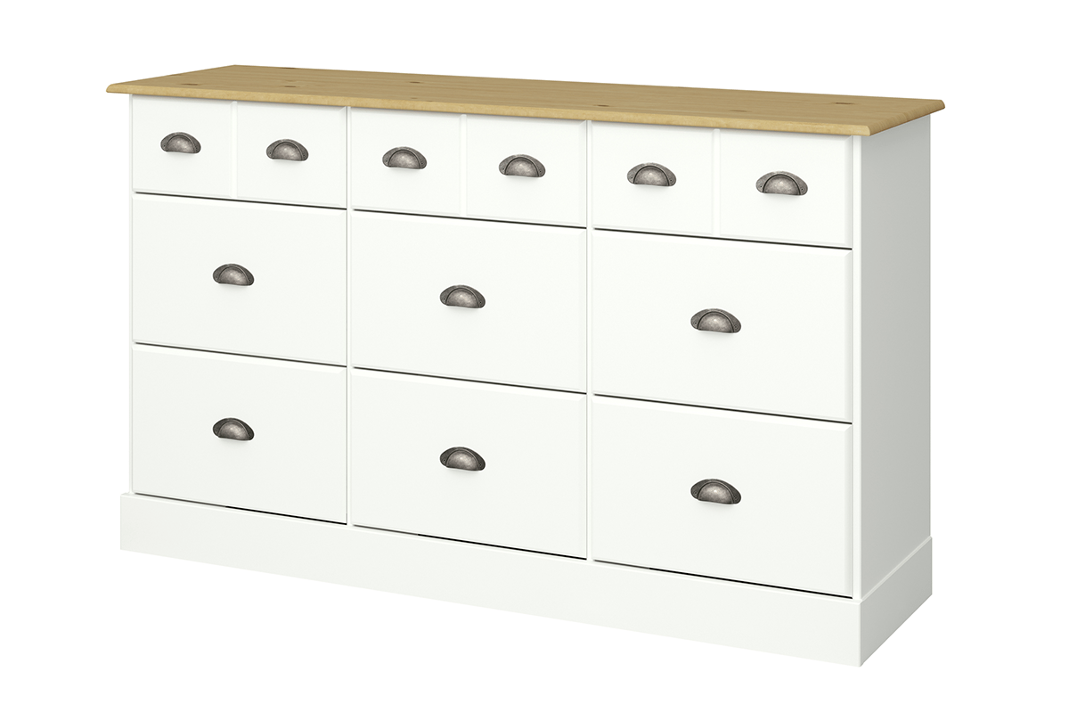 Große, sehr geräumige Kommode für Traditionalisten, die jedoch auch Sammler zu schätzen wissen werden. Die Kommode NOLA verfügt über insgesamt 12 Schubladen, von denen die Hälfte große Schubladen für Kleidung sind und die andere Hälfte kleine Schubladen für Kleinkram. Diese breite Kommode eignet sich perfekt für das Schlafzimmer, das Wohnzimmer oder den Kleiderschrank.