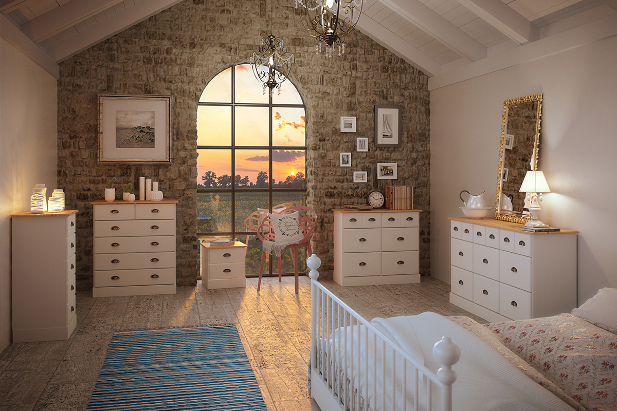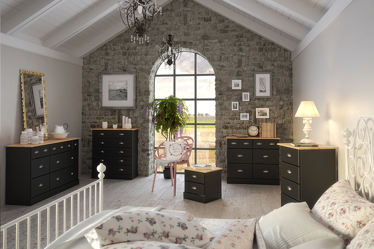 Die Kommode NOLA ist in 2 klassischen und eleganten Farben erhältlich, Weiß und Schwarz, wobei jede Version eine kontrastierende obere Platte aus naturbelassenem Kiefernholz und ergonomische, schöne Griffe im Vintage-Stil für das Öffnen hat. Solide Führungsschienen gewährleisten jahrelanges zuverlässiges Herausziehen und Schließen der Schubladen. Die eigentliche Struktur besteht aus strapazierfähigem Holzfaserplatten, die mit einer schönen, widerstandsfähigen Folie überzogen sind, um das Möbelstück leicht sauber halten zu können.
