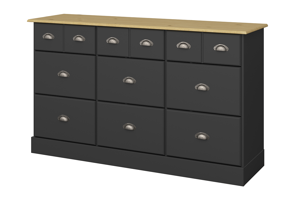 Große, sehr geräumige Kommode für Traditionalisten, obwohl sie sicherlich auch von Sammlern geschätzt wird. Die Kommode NOLA hat ganze 12 Schubladen, von denen die Hälfte große Schubladen für Kleidung sind und die andere Hälfte kleine Schubladen für Kleinigkeiten. Diese breite Kommode eignet sich perfekt für das Schlafzimmer oder das Wohnzimmer oder den Kleiderschrank.