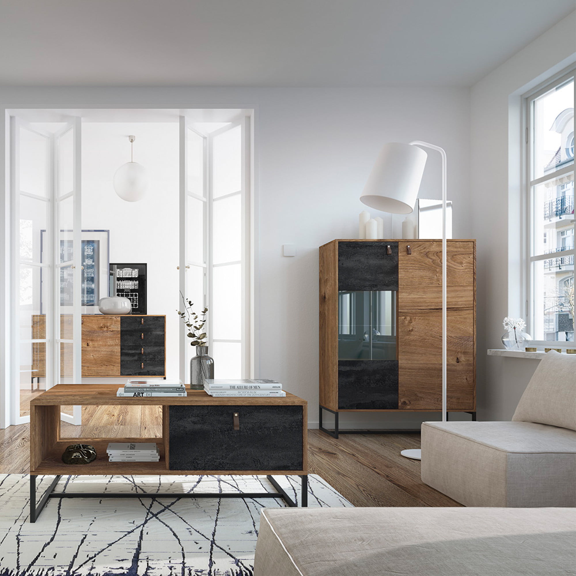 Optionale LED-Beleuchtung 11087.08.147. Die Eichenkommode aus der RUGO-Kollektion vereint das Gleichgewicht von Holz und Schwarz, durchbrochen von einer Front aus gehärtetem Glas. Das transparente Element bringt eine neue Qualität und Charakter in das Möbelstück und macht es attraktiver und außergewöhnlicher. Die Verwendung einer Vitrine eignet sich perfekt zur Ausstellung von Glas oder Familienandenken.