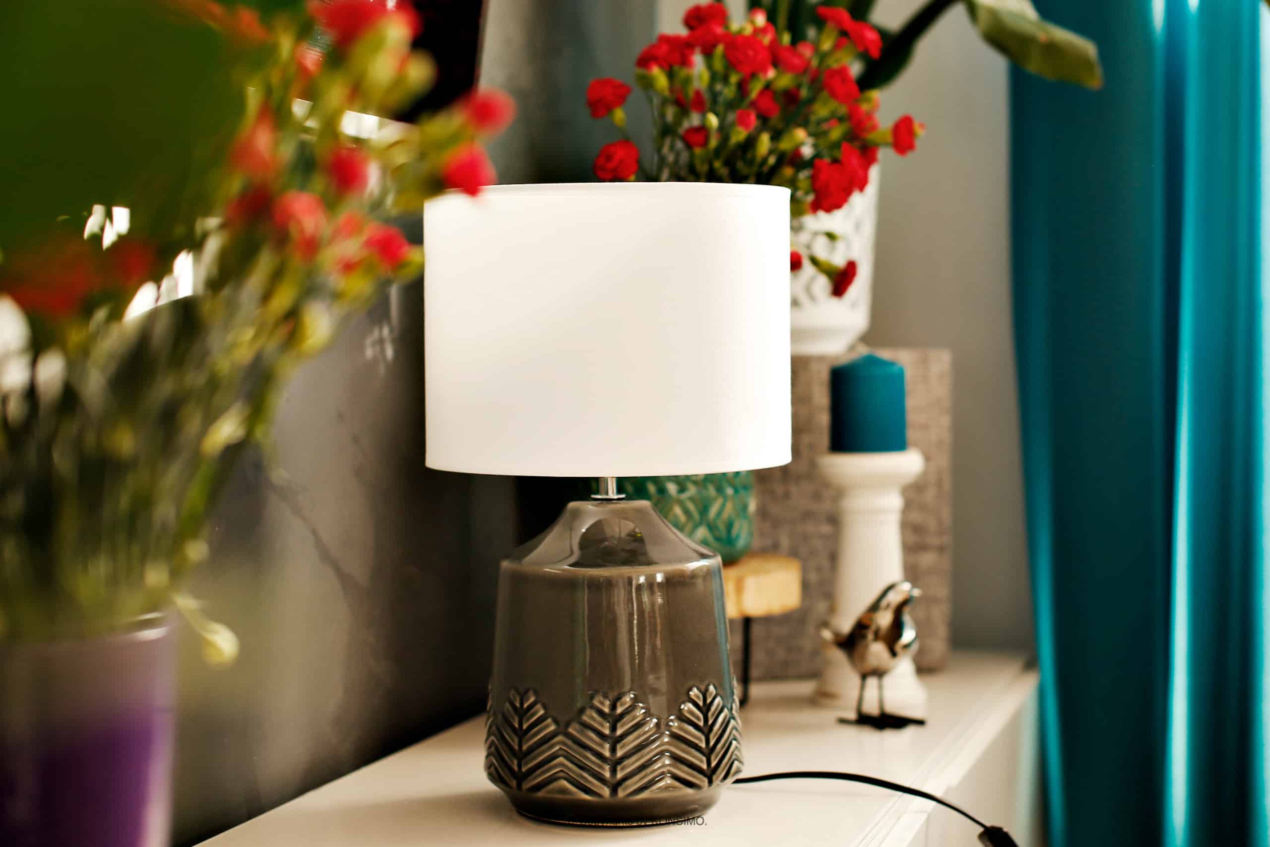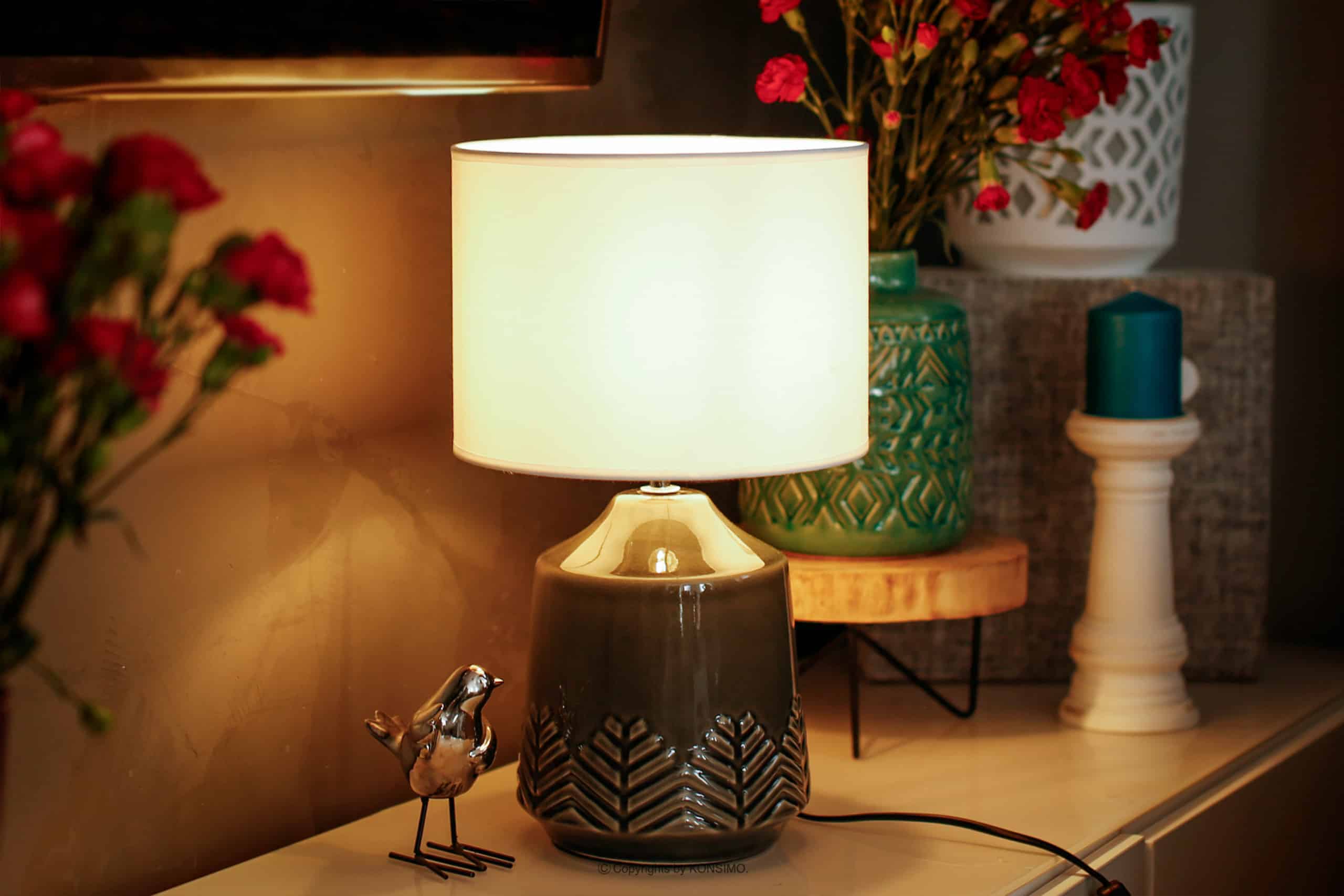 Die dekorative Tischlampe aus der HYSSO-Serie bringt Wärme und Komfort in Ihr Zuhause. Der Lampenfuß ist mit einem Blattmotiv verziert, was ihm eine natürliche Note verleiht und das schlichte Raumdesign ergänzt. Die Basis ist aus grauer Keramik gefertigt, während der obere Teil von einem breiten, weißen Lampenschirm abgedeckt wird. Diese Farbkombination passt gut zu klassischen und modernen Innenräumen, die auf einheitliche Farben und Schattierungen setzen.