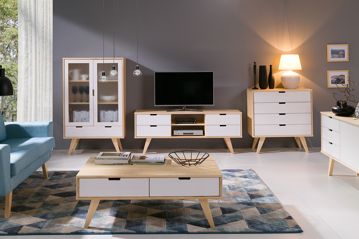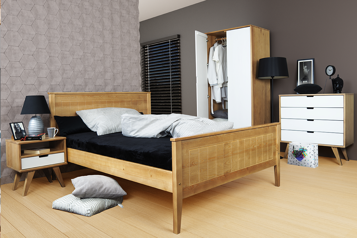 Sie verleihen ihm Leichtigkeit und lassen viel Platz unter dem Möbelstück, was besonders beim Staubsaugen des Bodens wichtig ist. Für die Herstellung des Möbels wurde hochwertiges gebeiztes Kiefernholz verwendet, und das Ganze kann in verschiedenen Farbkombinationen ausgewählt werden.
