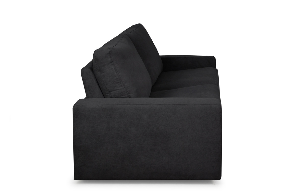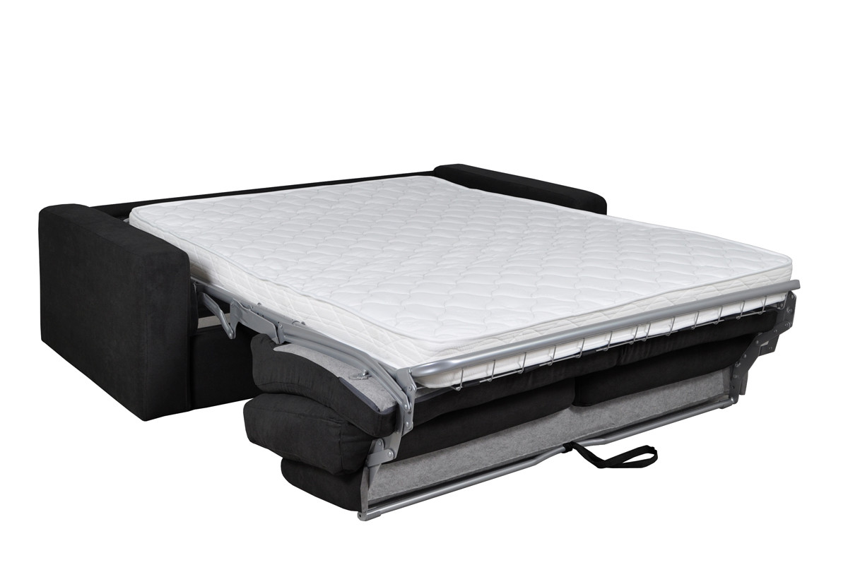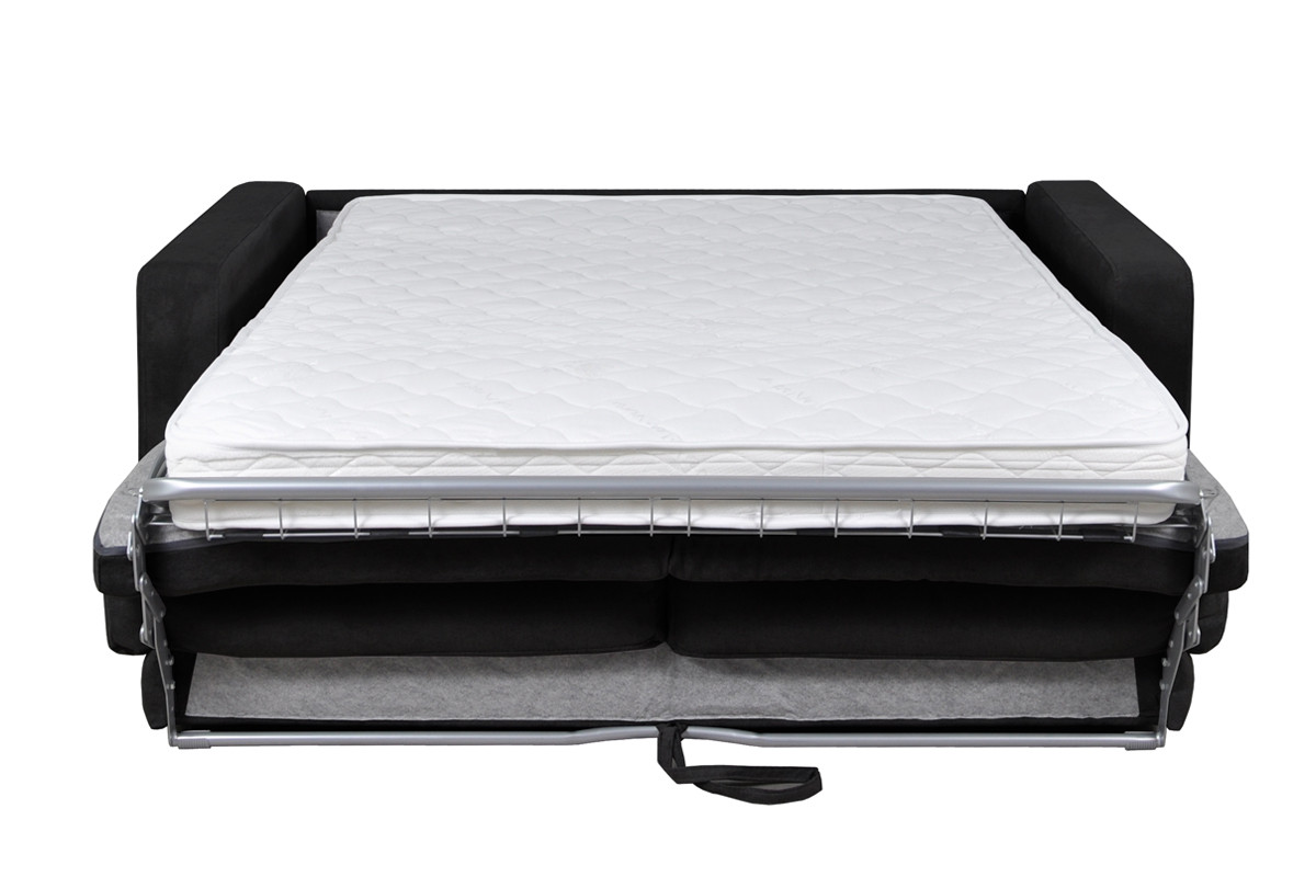 Das ausziehbare 3-Sitzer-Sofa im italienischen Stil in Schwarz ist ein schönes Möbelstück mit einer schlichten Form, das sich perfekt in große und kleine Wohnzimmer einfügt und gleichzeitig zusätzlichen Schlafplatz bietet. Es ist mit hochwertigem Stoff bezogen, der schmutz- und abriebfest ist. Im Sitz befinden sich elastische Gurte, die sehr belastbar sind und für große Belastungen ausgelegt sind.