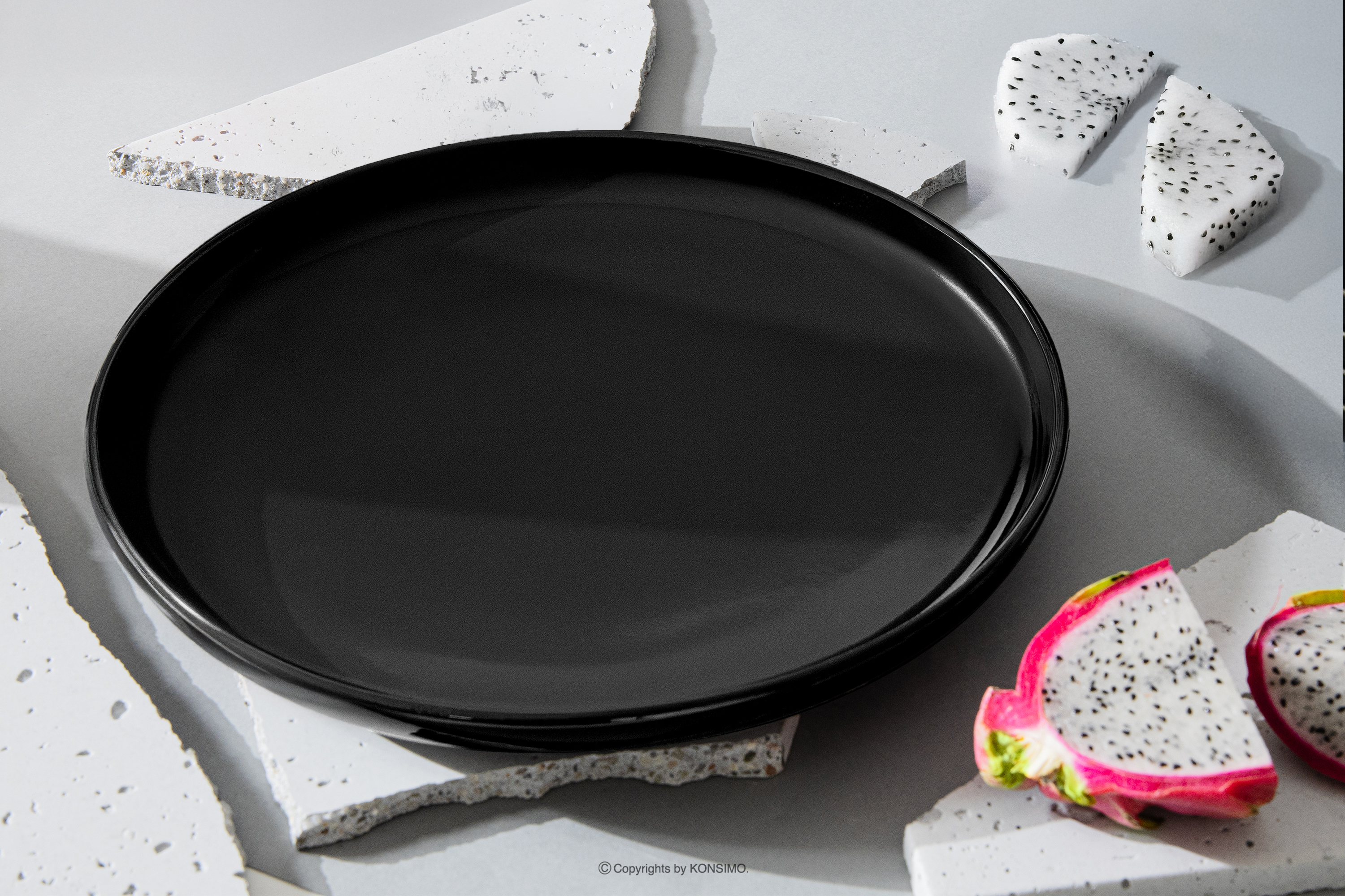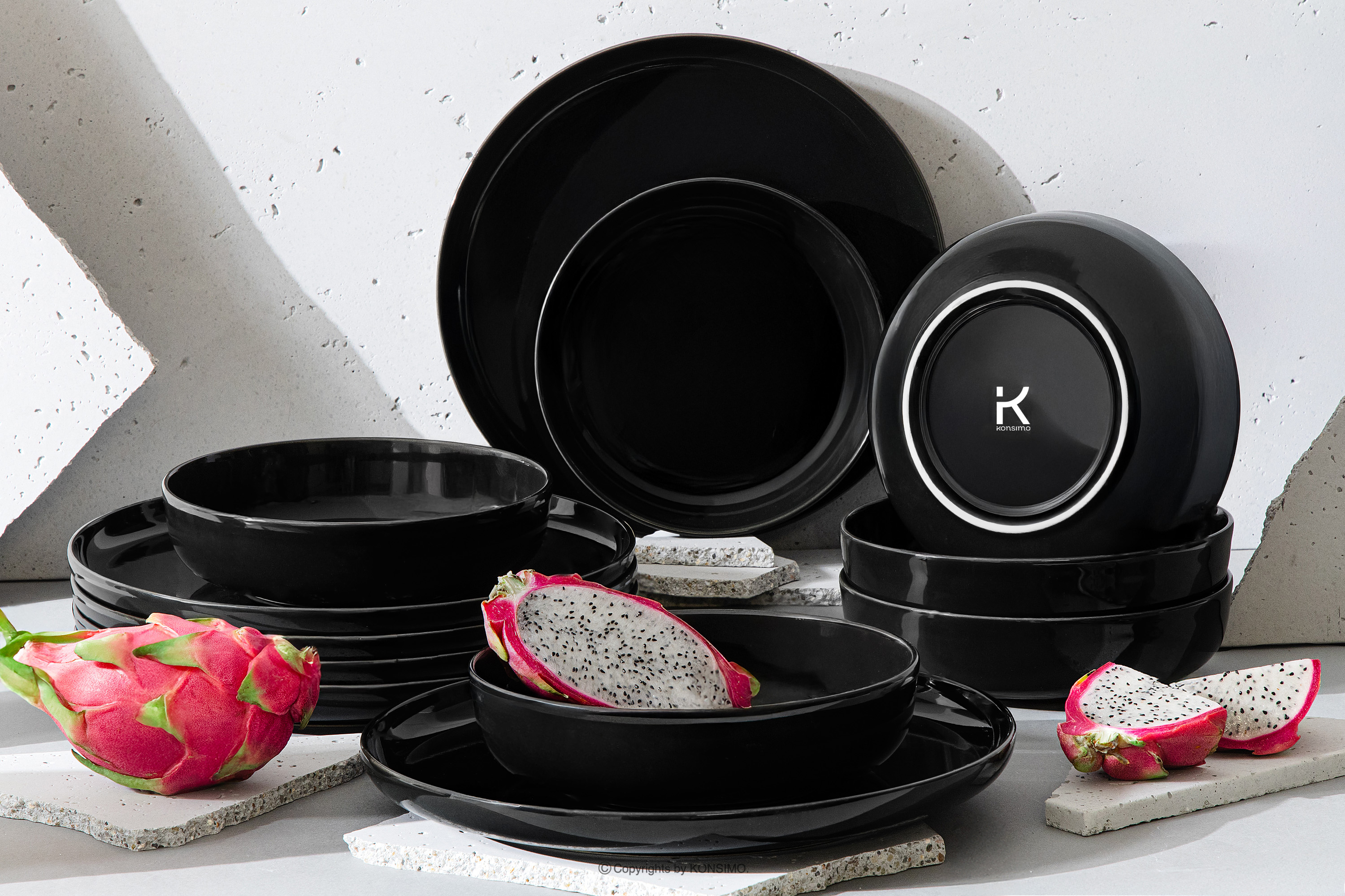 Tafelservice glänzend schwarz 6-Personen (12 tlg.), hergestellt aus hochwertigster Keramik, besticht durch seine außergewöhnliche Eleganz und seine unbestreitbare Widerstandsfähigkeit gegen jegliche Art von Beschädigung. Die glänzende Oberfläche und die minimalistischen, abgerundeten Formen verleihen ihm einen einzigartigen Charakter, so dass es sowohl zu modernen Loft-Interieurs als auch zu traditionellen Esszimmereinrichtungen passt. Diese ungewöhnliche Kombination aus Stil und Funktionalität macht dieses Set zur perfekten Wahl sowohl für einen eleganten Esstisch bei formellen Anlässen als auch für den alltäglichen Gebrauch, wo es außergewöhnlichen Geschmack und Lebensstil unterstreicht.
