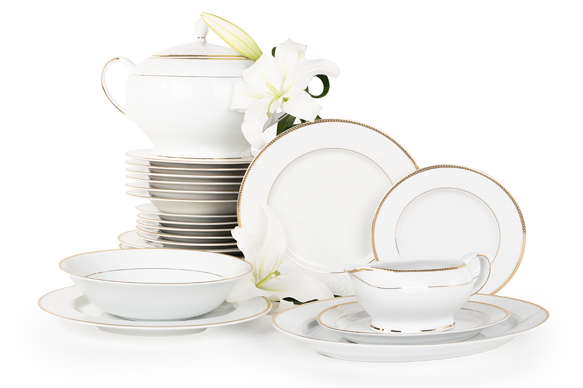 für das Produkt Tafelservice aus polnischem Porzellan 6-sitzig 24 -teilig. weiß / gold gemustert