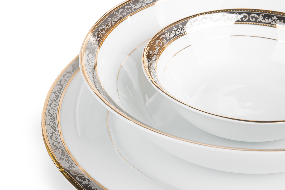 Tafelservice aus polnischem Porzellan für 6 Personen weiß / goldfarben CONTE - Farbe weiß/silber/gold