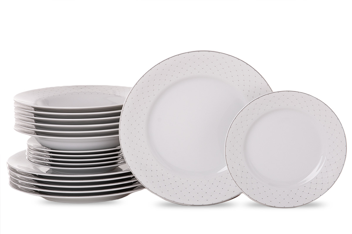 Die außergewöhnliche Geschirrkollektion AMELIA CARMEN zeichnet sich durch Verzierungen in Form von glänzenden und miteinander verbundenen Punkten aus - das Ganze bildet ein raffiniertes Muster, das voller Leichtigkeit und Eleganz ist. Darüber hinaus betonen silberne Veredelungen an den Rändern die schöne Weiße des Porzellans. Die Kollektion wurde vollständig in polnischen Fabriken aus hochwertigem Porzellan hergestellt, so dass sie über viele Jahre hinweg den Tisch schmücken und die verglasten Vitrinen mit Charme füllen wird.