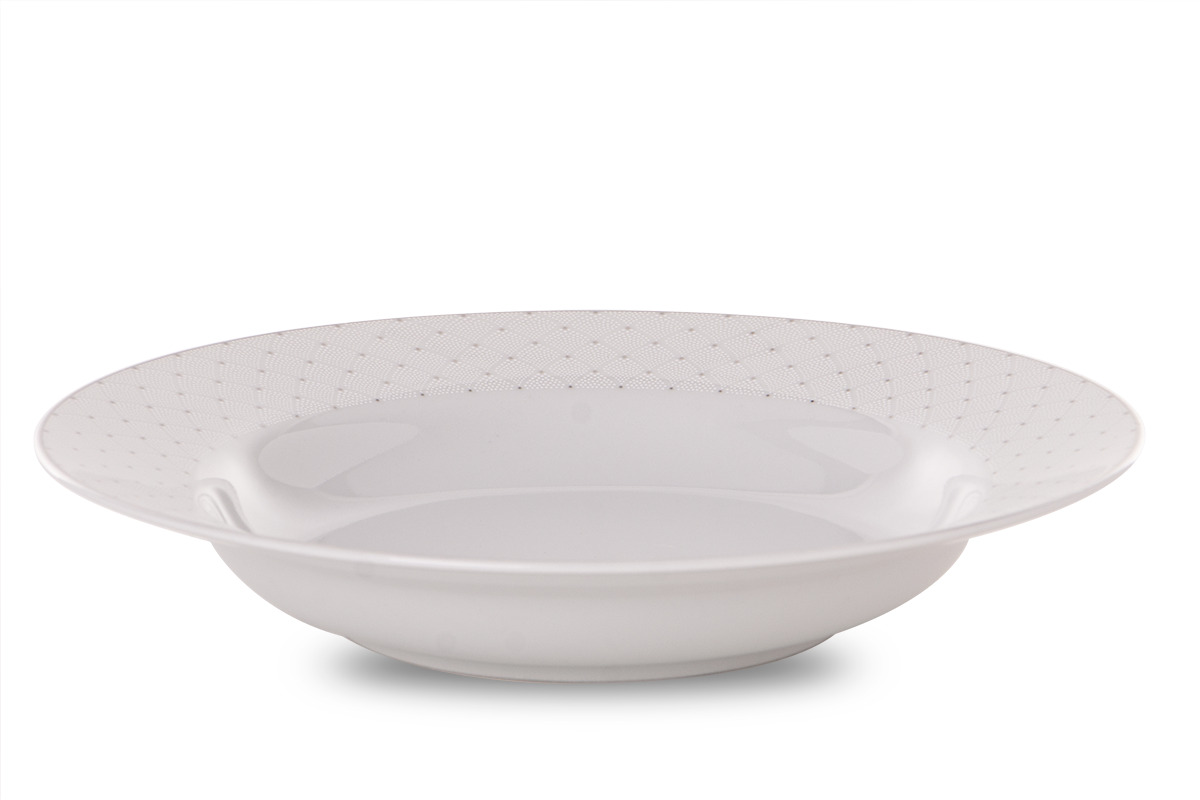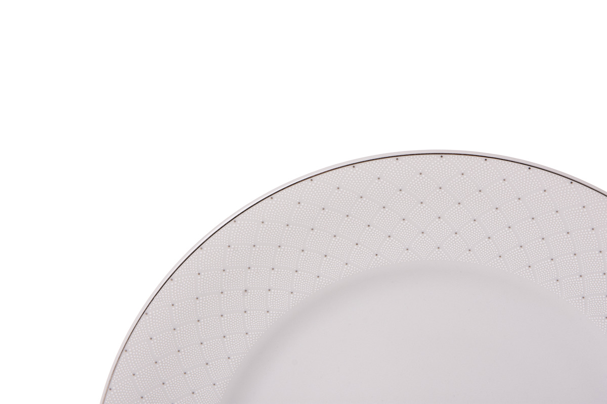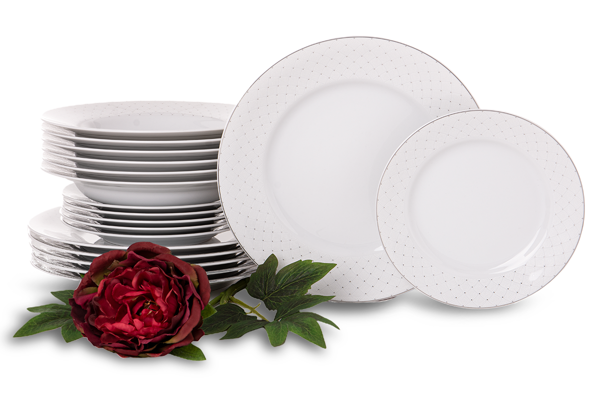 Die außergewöhnliche Geschirrkollektion AMELIA CARMEN zeichnet sich durch Verzierungen in Form von glänzenden und miteinander verbundenen Punkten aus - das Ganze bildet ein raffiniertes Muster, das voller Leichtigkeit und Eleganz ist. Darüber hinaus betonen silberne Veredelungen an den Rändern die schöne Weiße des Porzellans. Die Kollektion wurde vollständig in polnischen Fabriken aus hochwertigem Porzellan hergestellt, so dass sie über viele Jahre hinweg den Tisch schmücken und die verglasten Vitrinen mit Charme füllen wird.