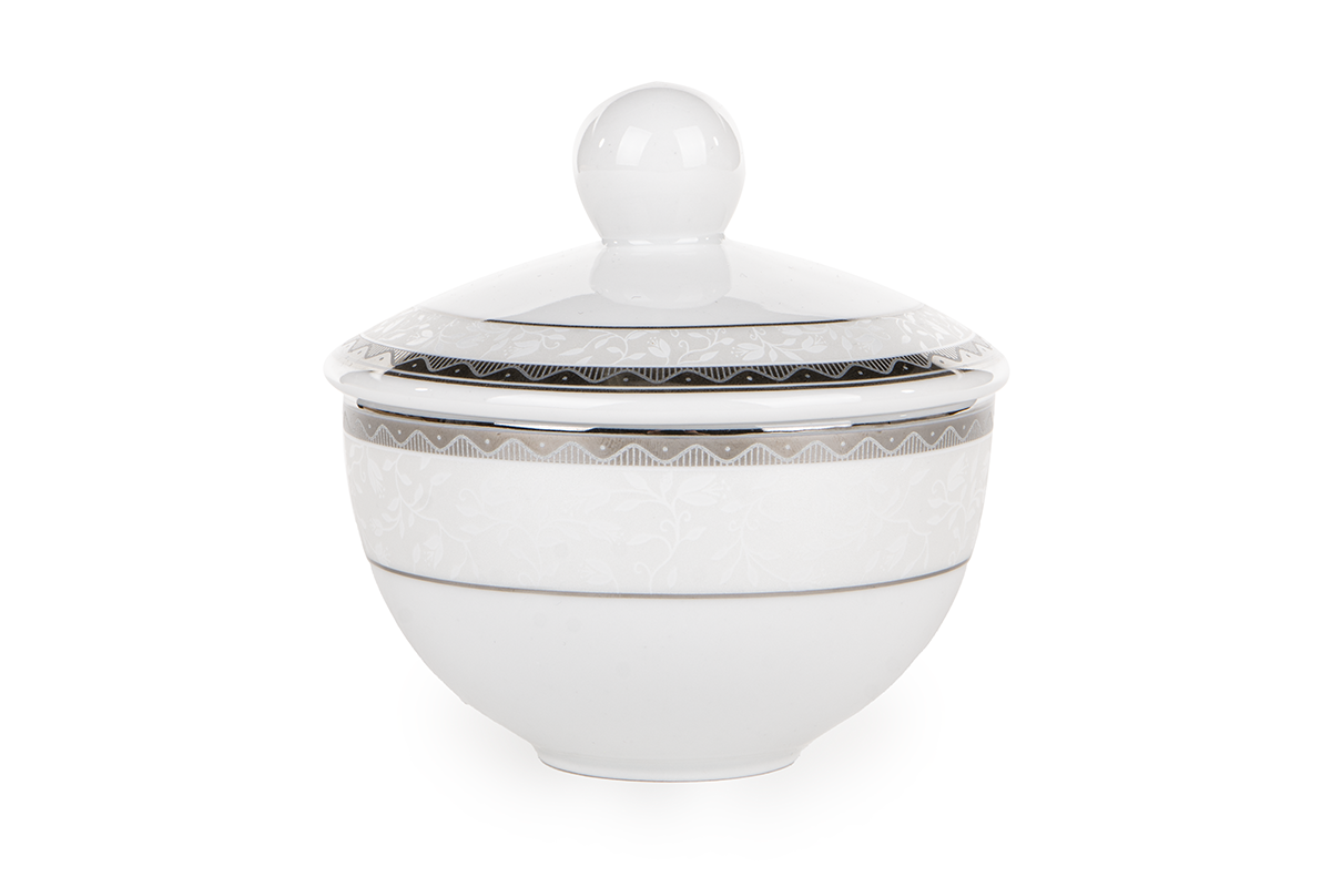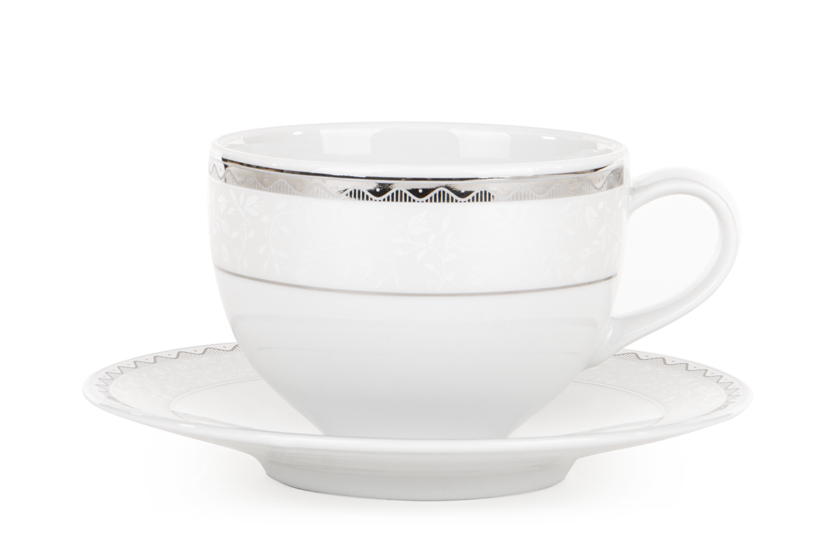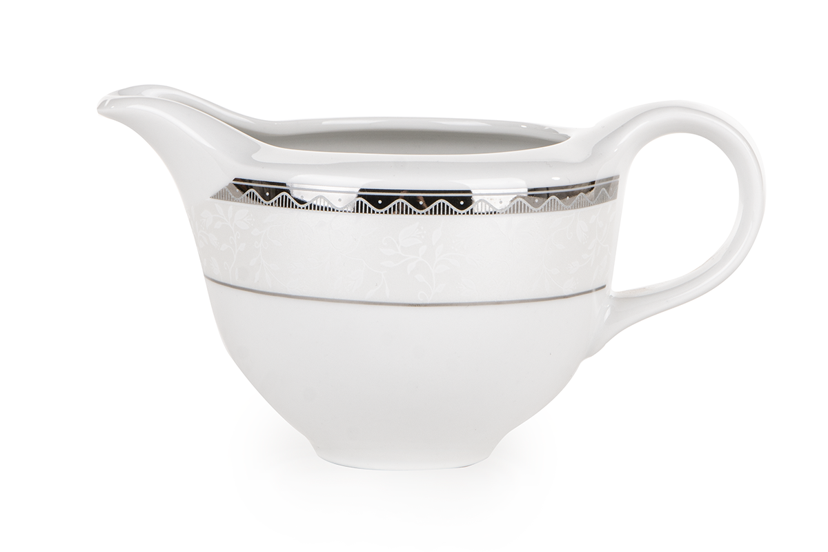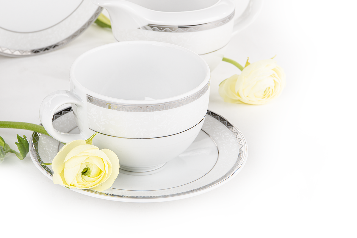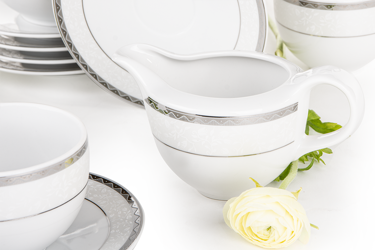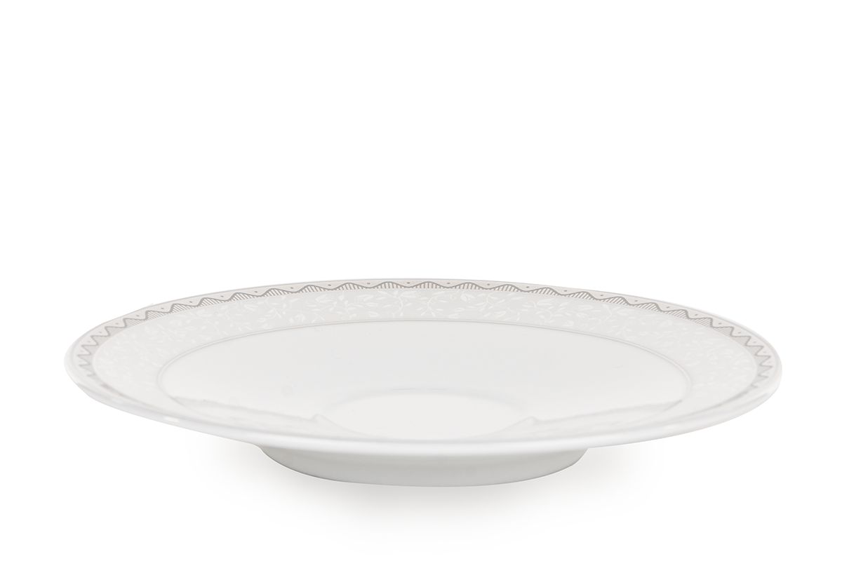Die markante AMELIA PLATYNA Geschirrkollektion verleiht jedem Interieur Charakter - sie wird den Tisch perfekt schmücken und die verglasten Vitrinen mit Charme füllen. Die Verzierung besticht durch eine auffällige, wellenförmige Linie mit originellen Füllungen, und der Kollektion verleihen natürliche, erhabene Motive auf schneeweißer Oberfläche zusätzlichen Charme. Die gesamte Kollektion wurde in polnischen Fabriken aus hochwertigem Porzellan hergestellt, sodass Sie Ihren Gästen jahrelang schöne Gerichte servieren können.