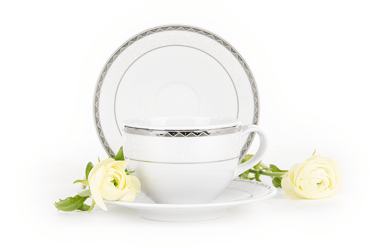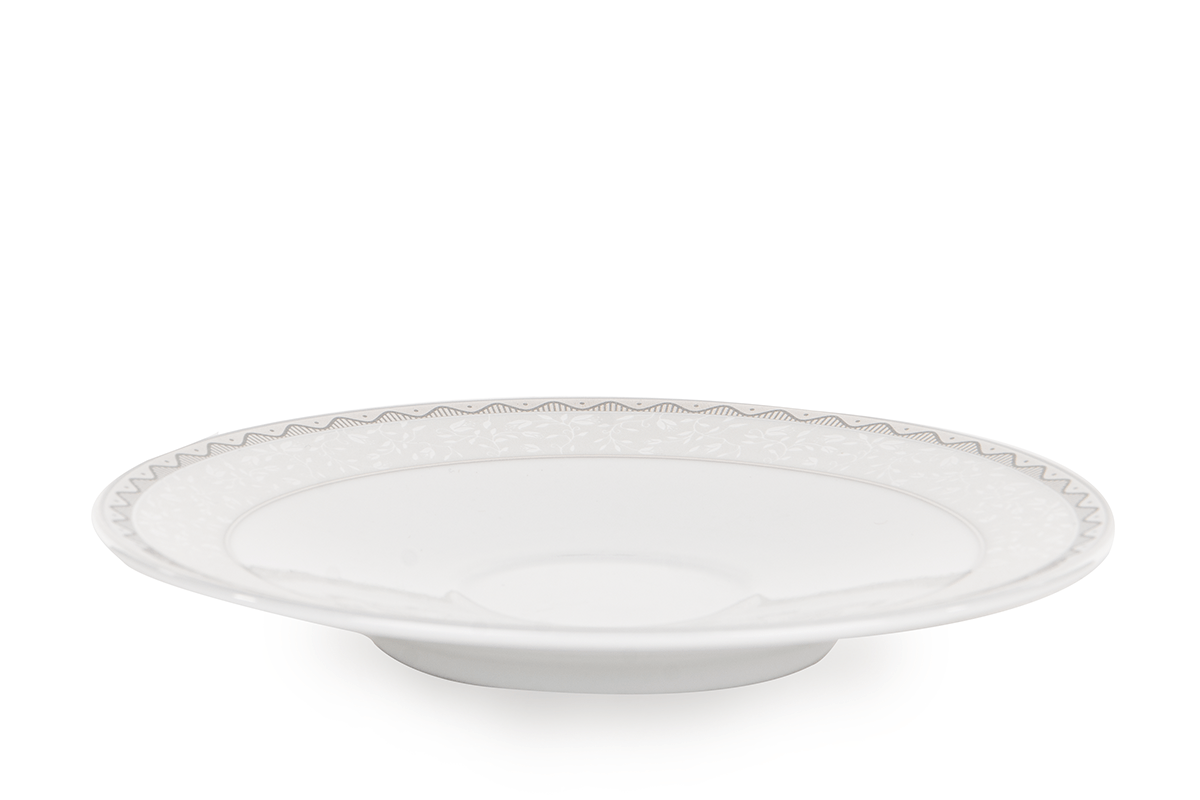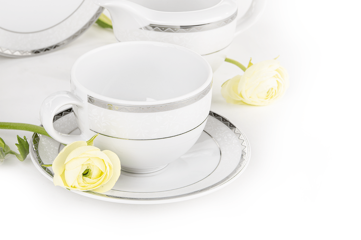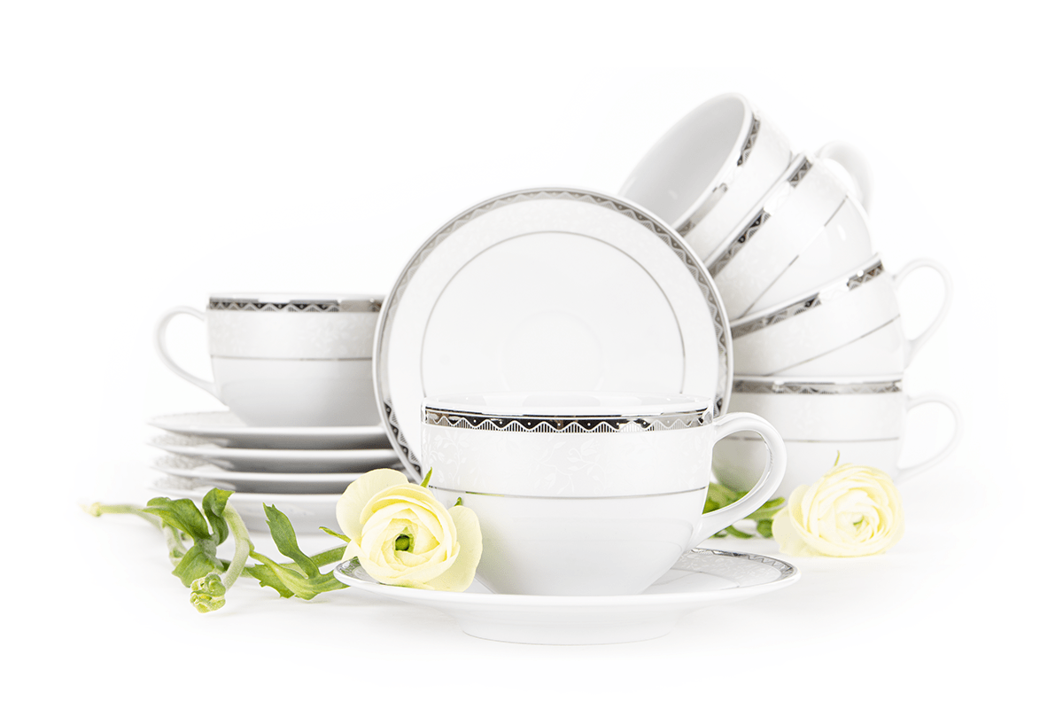 Die markante Kollektion AMELIA PLATYNA verleiht den Räumen Charakter - sie schmückt den Tisch perfekt aus und füllt die verglasten Vitrinen mit Charme. Die Verzierung zeichnet sich durch eine deutlich kontrastierende, wellenförmige Linie mit origineller Füllung aus, während natürliche, erhabene Motive auf der schneeweißen Oberfläche der Kollektion zusätzliche Eleganz verleihen.