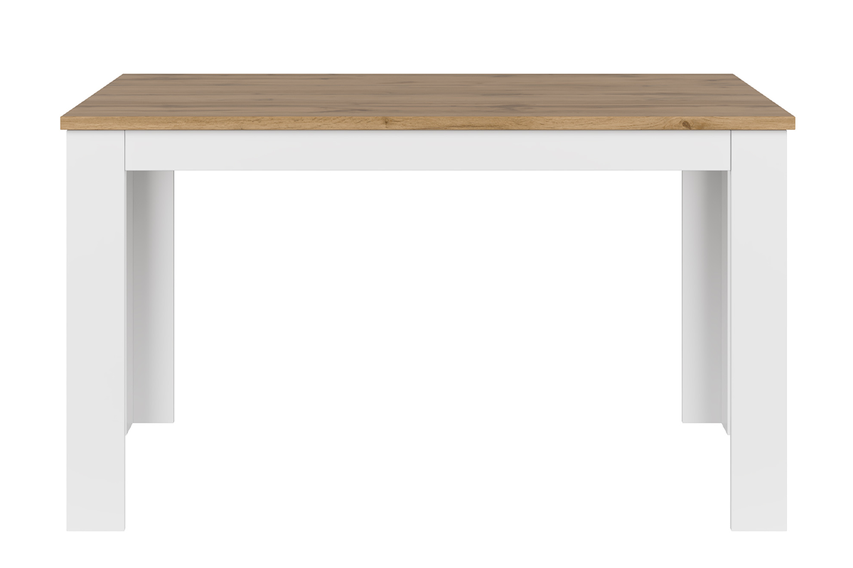 Der ausziehbare Tisch ist Garant für gelungene Treffen im Kreis der Liebsten. Die klassische Konstruktion aus zwei Platten in Eichen- und Weißtönen macht ihn zu einer perfekten Ergänzung für eine im skandinavischen oder modernen Stil eingerichtete Esszimmer. Das Möbelstück ist eine ausgezeichnete Wahl für Bewohner kleiner Wohnungen, da seine Grundversion die Standardmaße 135x78x86 cm hat und nach dem Ausziehen eine Länge von über 180 Zentimetern erreicht.