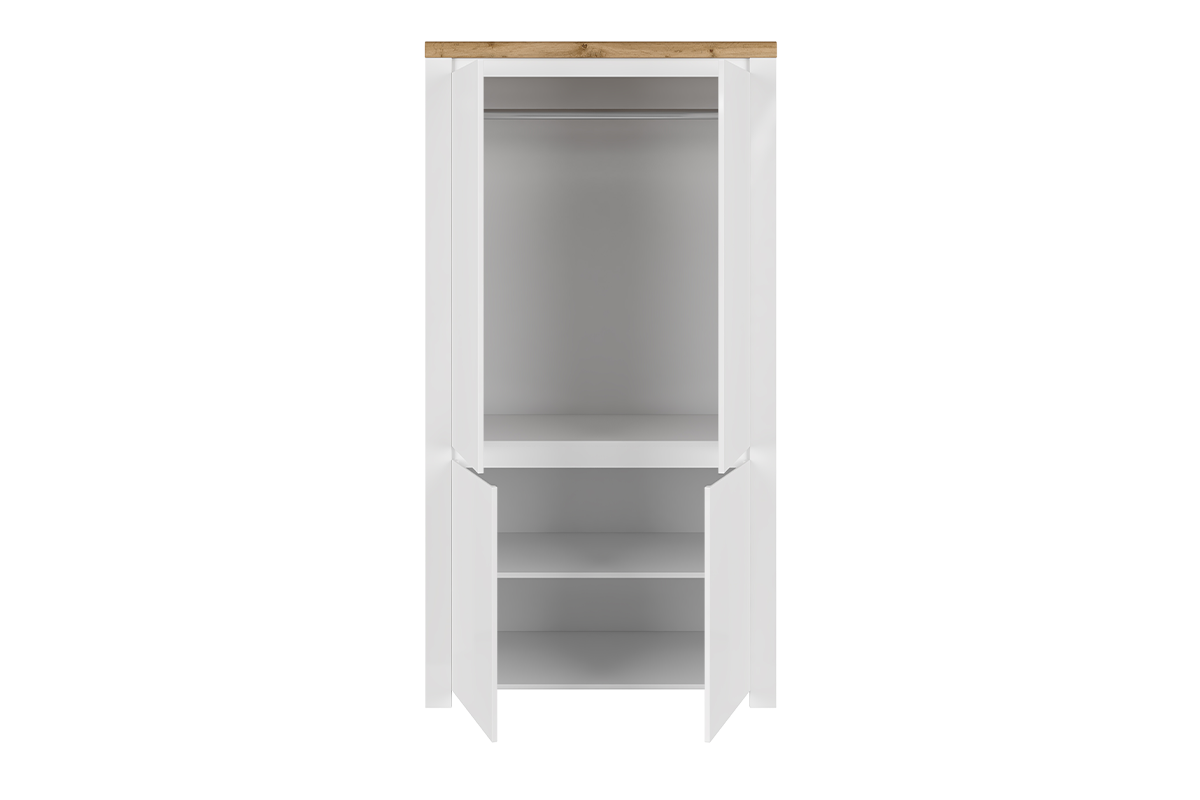 Der Kleiderschrank sollte geräumig und funktional sein, daher enthält unser Vorschlag aus der Damino-Kollektion sowohl bequeme, tiefe Regale als auch eine Stange zum Aufhängen längerer Kleidungsstücke im Inneren. Diese Lösung ermöglicht die Aufbewahrung aller Arten von Kleidung - von Wintermänteln über Maxikleider bis hin zu Basic-T-Shirts. Der Schrank hat ein klassisches, schlichtes Design, wie die gesamte Damino-Kollektion.