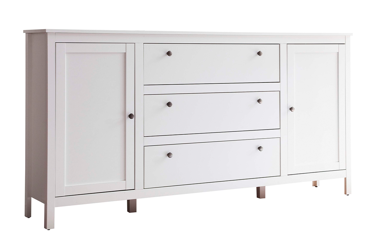 Die weiße große Kommode ist eine perfekte Lösung für das Wohnzimmer oder Schlafzimmer. Der Korpus des Möbels wurde in drei Teile aufgeteilt, zwei verschließbare Schränke mit zwei Regalen auf der rechten und linken Seite sowie eine mittlere Schubladen mit drei ausziehbaren Schubladen. Die geräumige Kommode Farge, trotz ihrer Größe von 183x98x38 cm, wirkt nicht "klobig", hauptsächlich dank der schlanken Beine in der Farbe des Möbels, die das Gesamtbild optisch entlasten.
