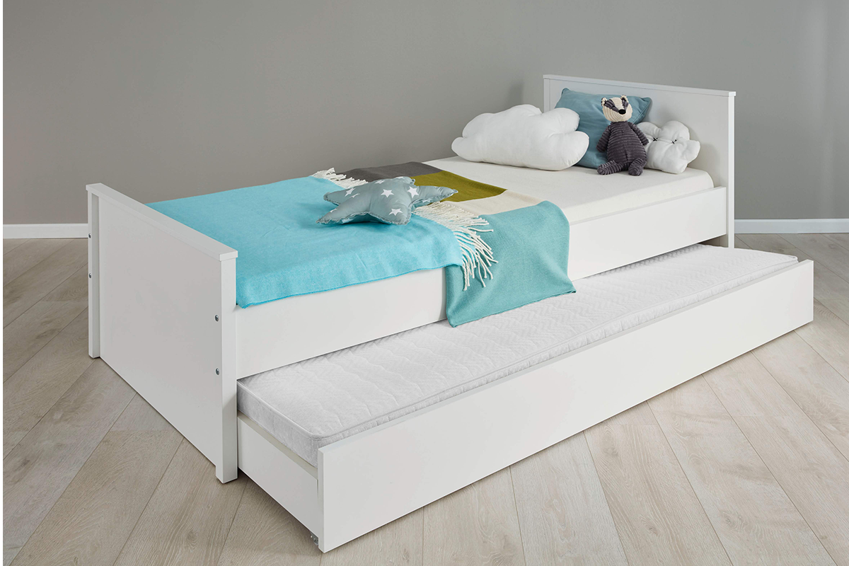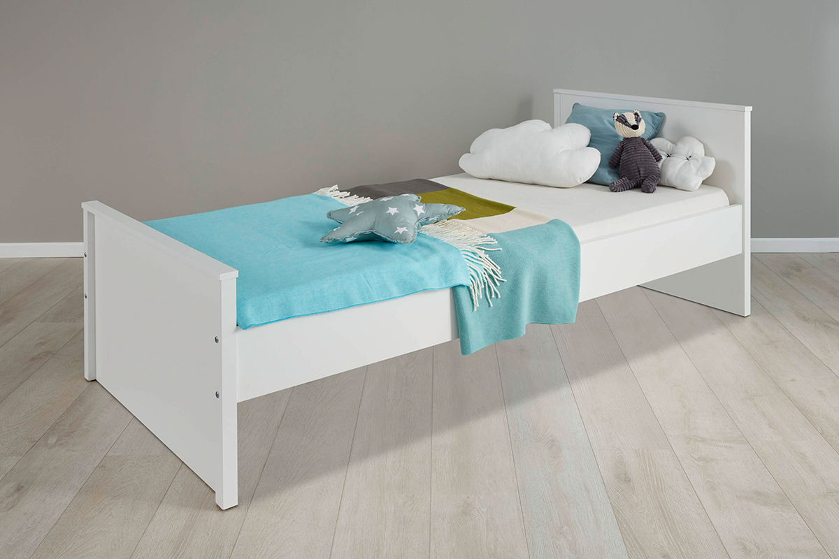 Eine Ergänzung für das Schlafzimmer im modernen, eleganten Stil wäre ein einfaches, weißes Bett. Die Standardgröße des Möbels - 90x200 - ermöglicht die Auswahl einer Matratze nach den Bedürfnissen und dem Komfort des Benutzers aus einer breiten Palette von Produkten auf dem Markt. Der Rahmen kann sowohl als Bett für das Jugendzimmer als auch als ergänzendes Möbelstück beispielsweise für einen großen Kleiderschrank oder ein Gästezimmer dienen.