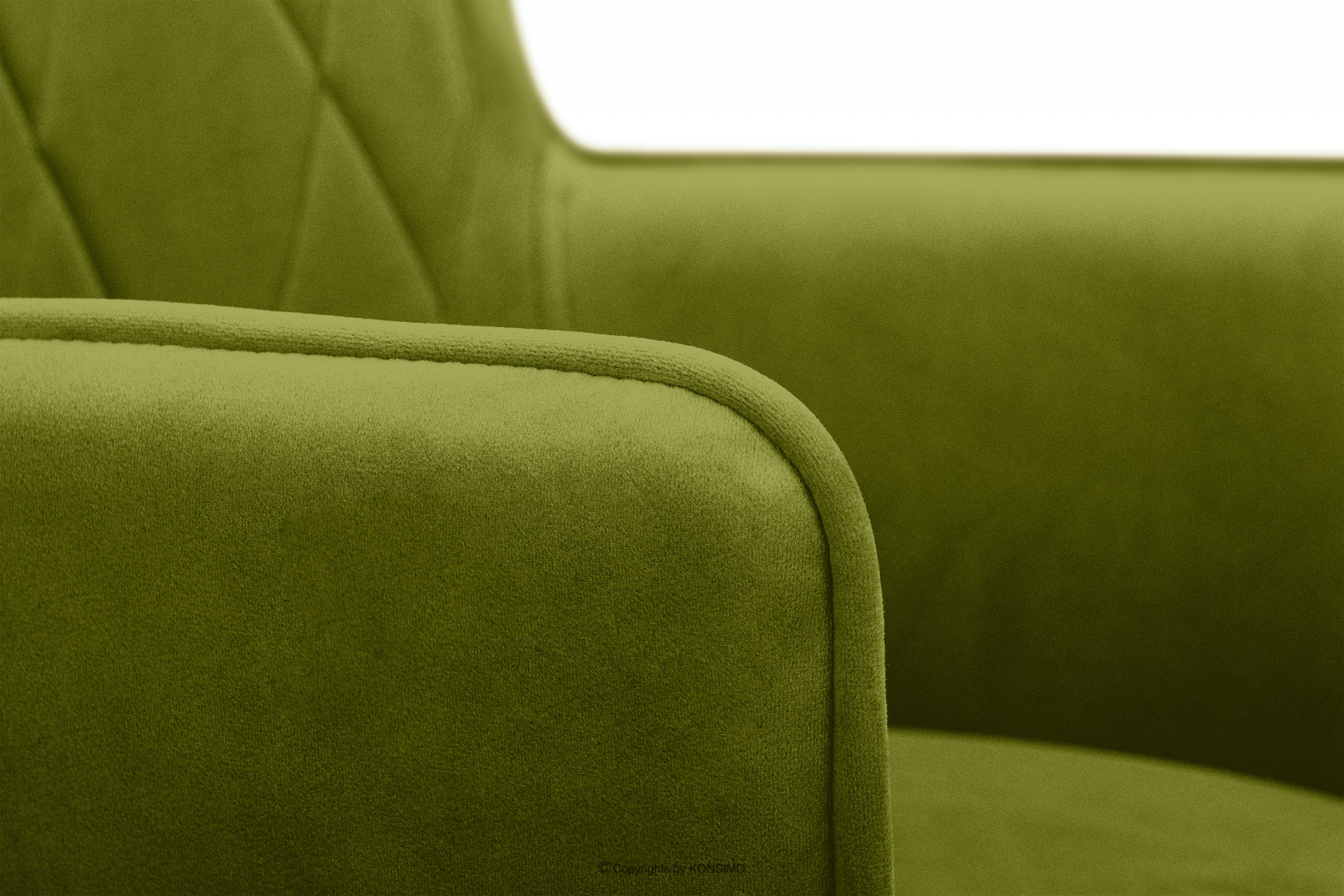 Der Wohnzimmerstuhl aus Velours in Flaschengrün hat eine perfekt geformte Rückenlehne und Armlehnen, die Komfort und eine korrekte Körperhaltung gewährleisten. Er macht sich sehr gut in Esszimmern oder Wohnzimmern im Loft- und Vintage-Stil. Die hohen Beine harmonieren perfekt mit dem beigen Veloursbezug des Stuhls.