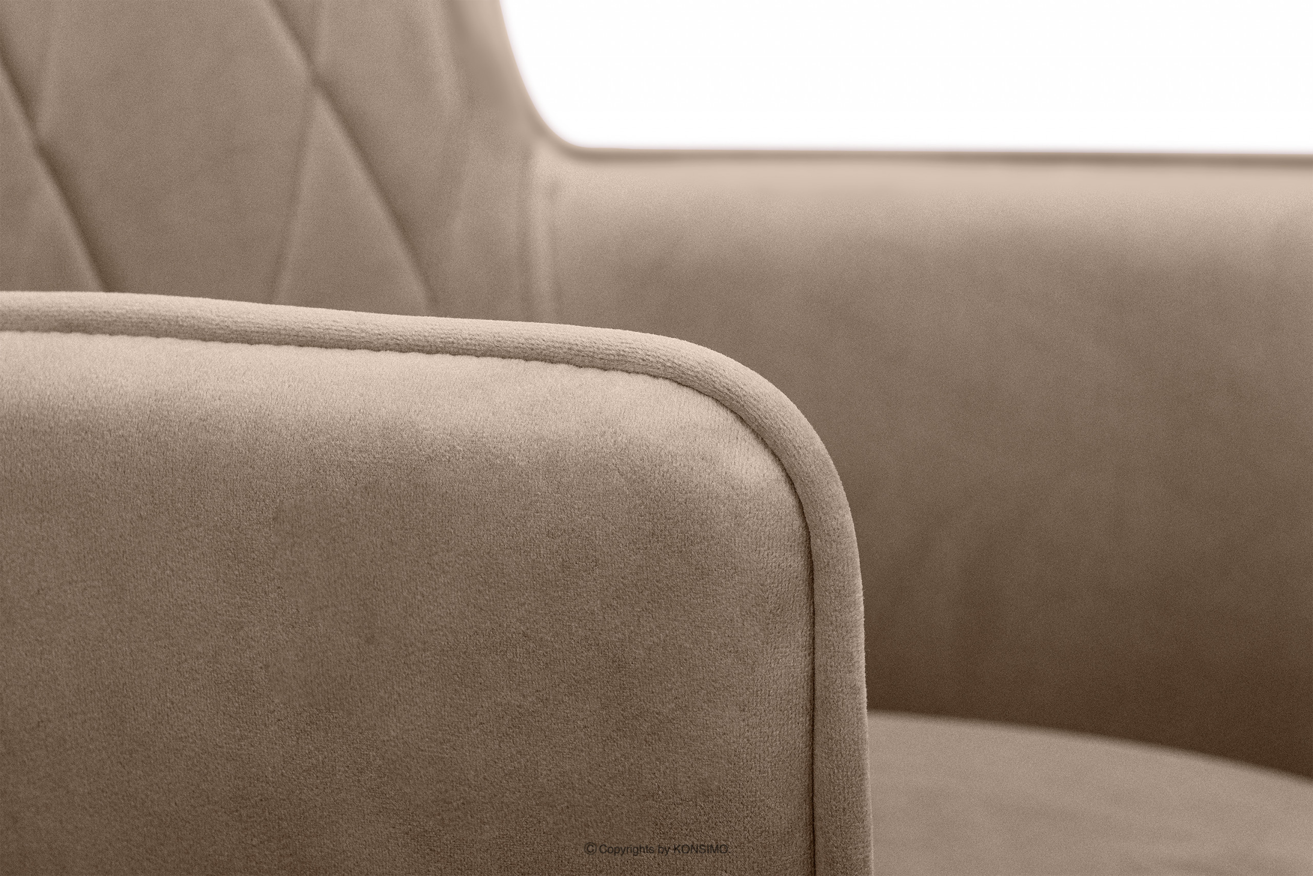 Der Wohnzimmerstuhl aus flaschengrünem Velours hat eine perfekt geformte Rückenlehne und Armlehnen, die für Komfort und eine korrekte Körperhaltung sorgen. Er macht sich sehr gut in Esszimmern oder Wohnzimmern im Loft- und Vintage-Stil. Die hohen Beine und die beigefarbene Velours-Polsterung des Stuhls harmonieren hervorragend miteinander.