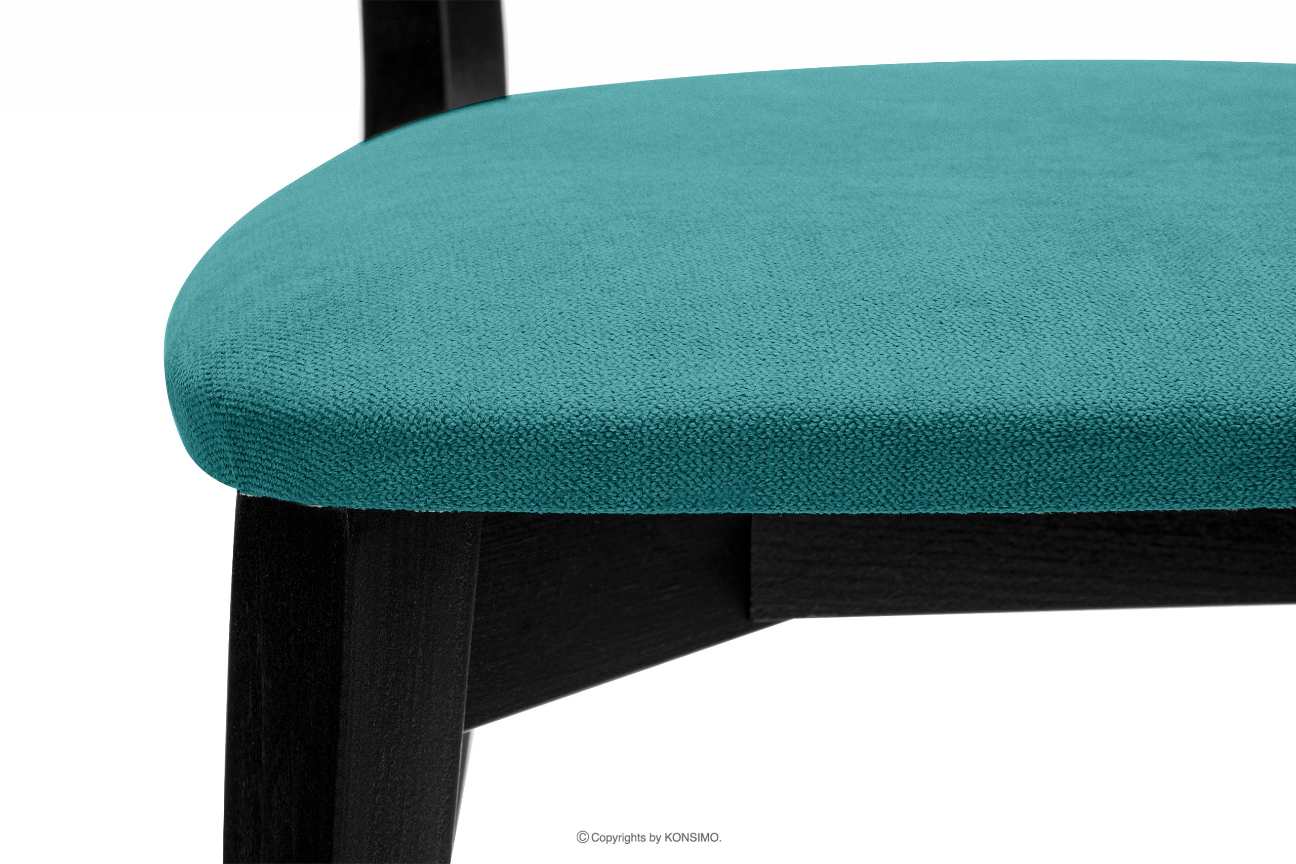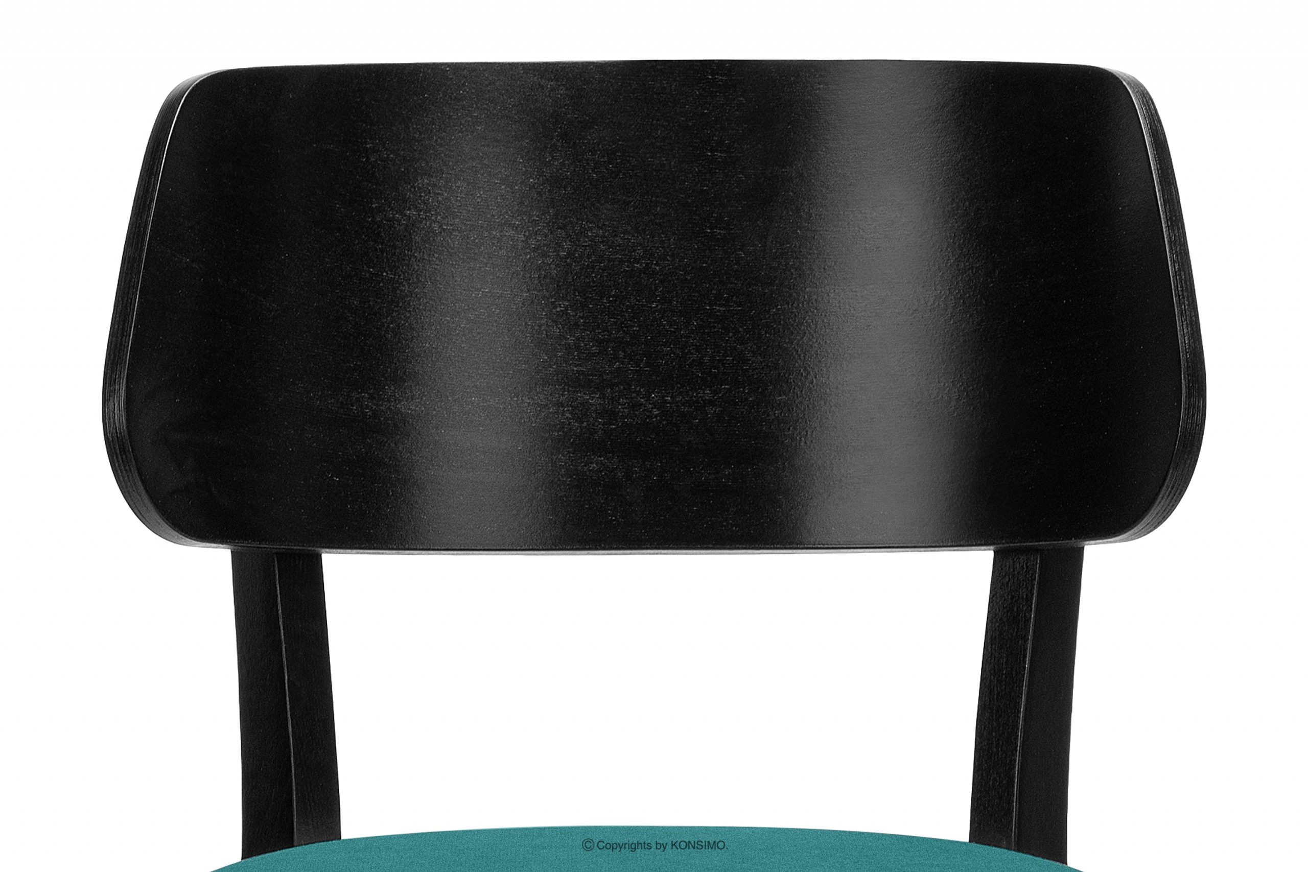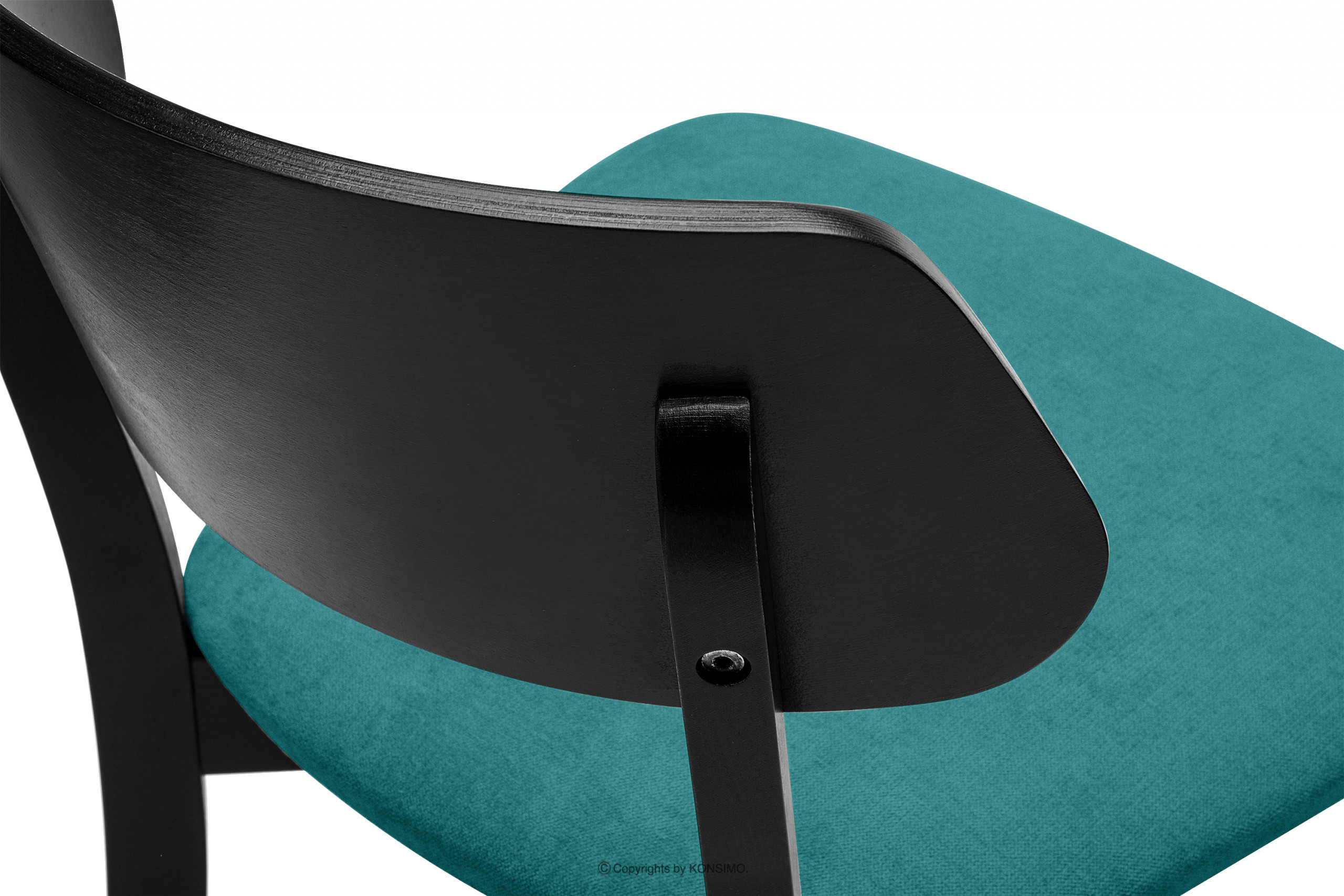 Der VINIS Stuhl ist hauptsächlich ein Klassiker mit einfachen Formen. Es greift den Retro-Stil auf und kombiniert türkisen Stoff mit einem schwarzen Rahmen. Der moderne schwarze Holzstuhl in Türkis passt gut zu interessanten Arrangements für Liebhaber natürlicher Innenräume. Er eignet sich für kleine und große Esszimmer und bietet auch Komfort bei gemeinsamen Familienmahlzeiten.