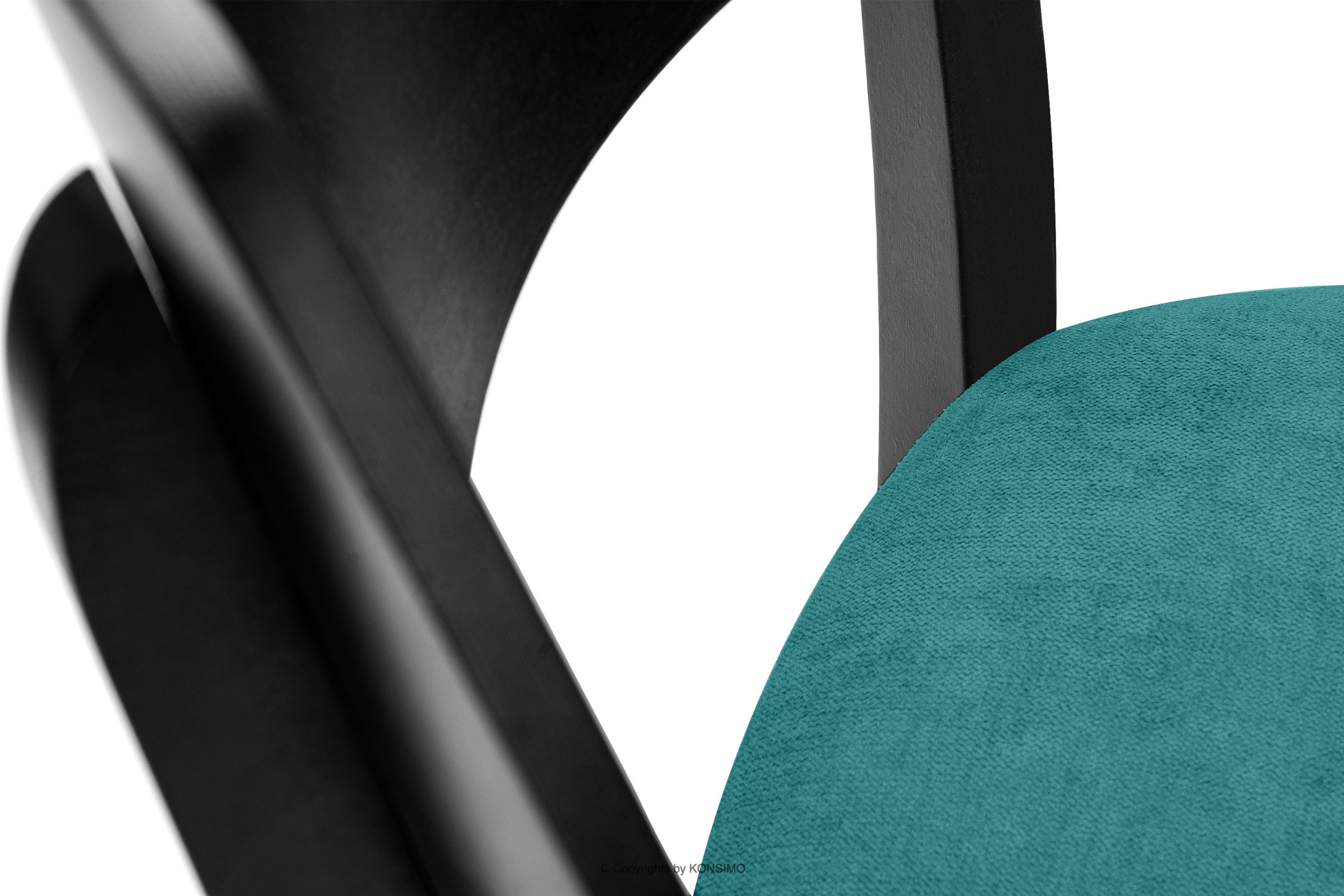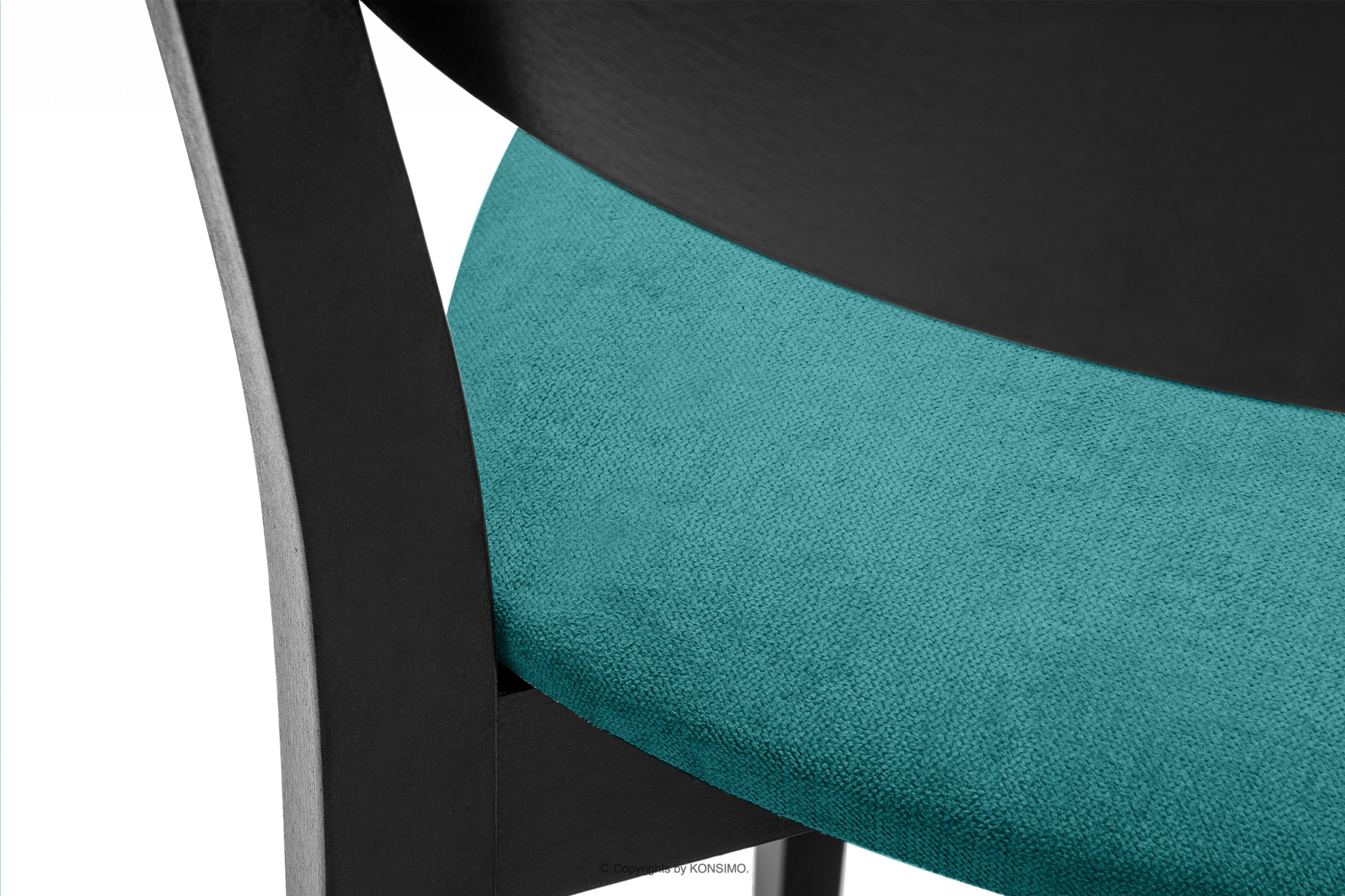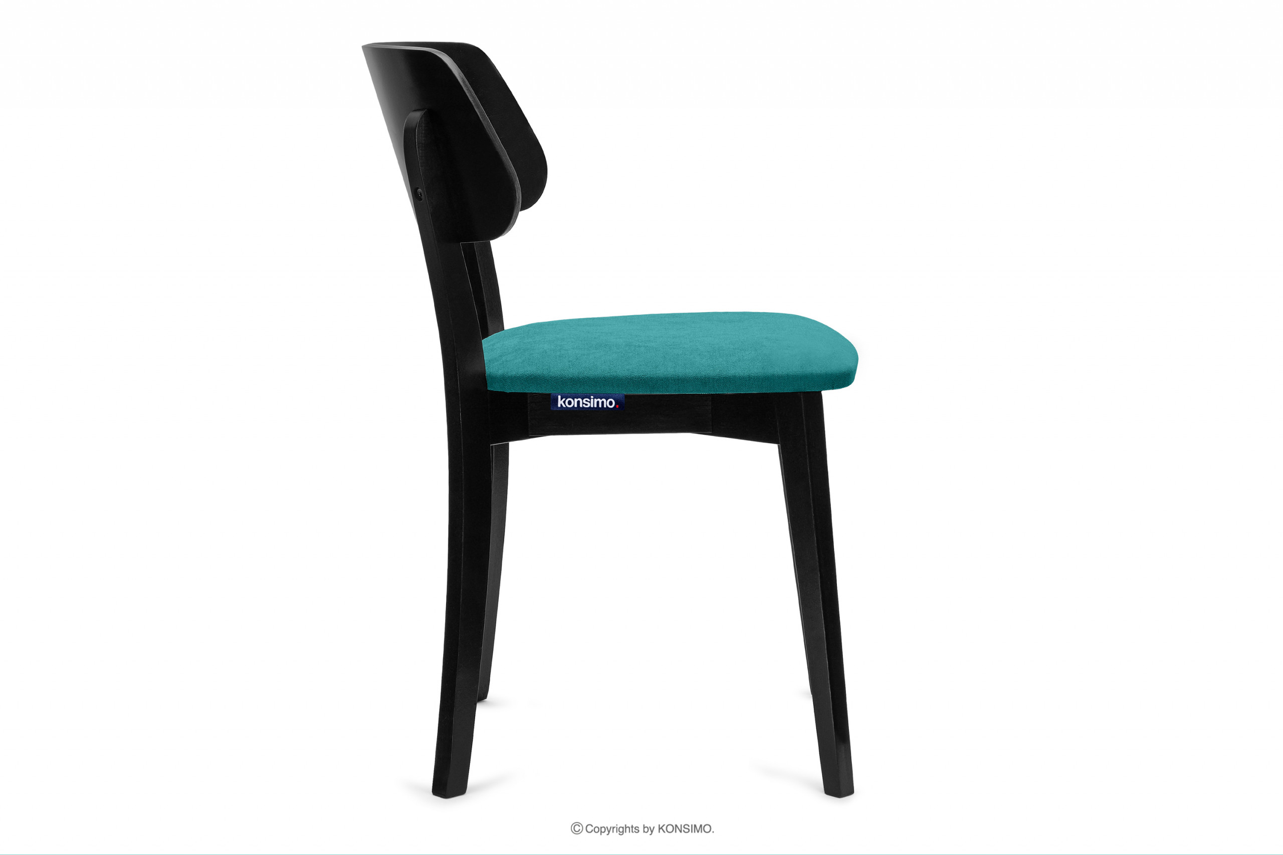 Der VINIS Stuhl ist hauptsächlich ein Klassiker mit einfachen Formen. Es greift den Retro-Stil auf und kombiniert türkisen Stoff mit einem schwarzen Rahmen. Der moderne schwarze Holzstuhl in Türkis passt gut zu interessanten Arrangements für Liebhaber natürlicher Innenräume. Er eignet sich für kleine und große Esszimmer und bietet auch Komfort bei gemeinsamen Familienmahlzeiten.