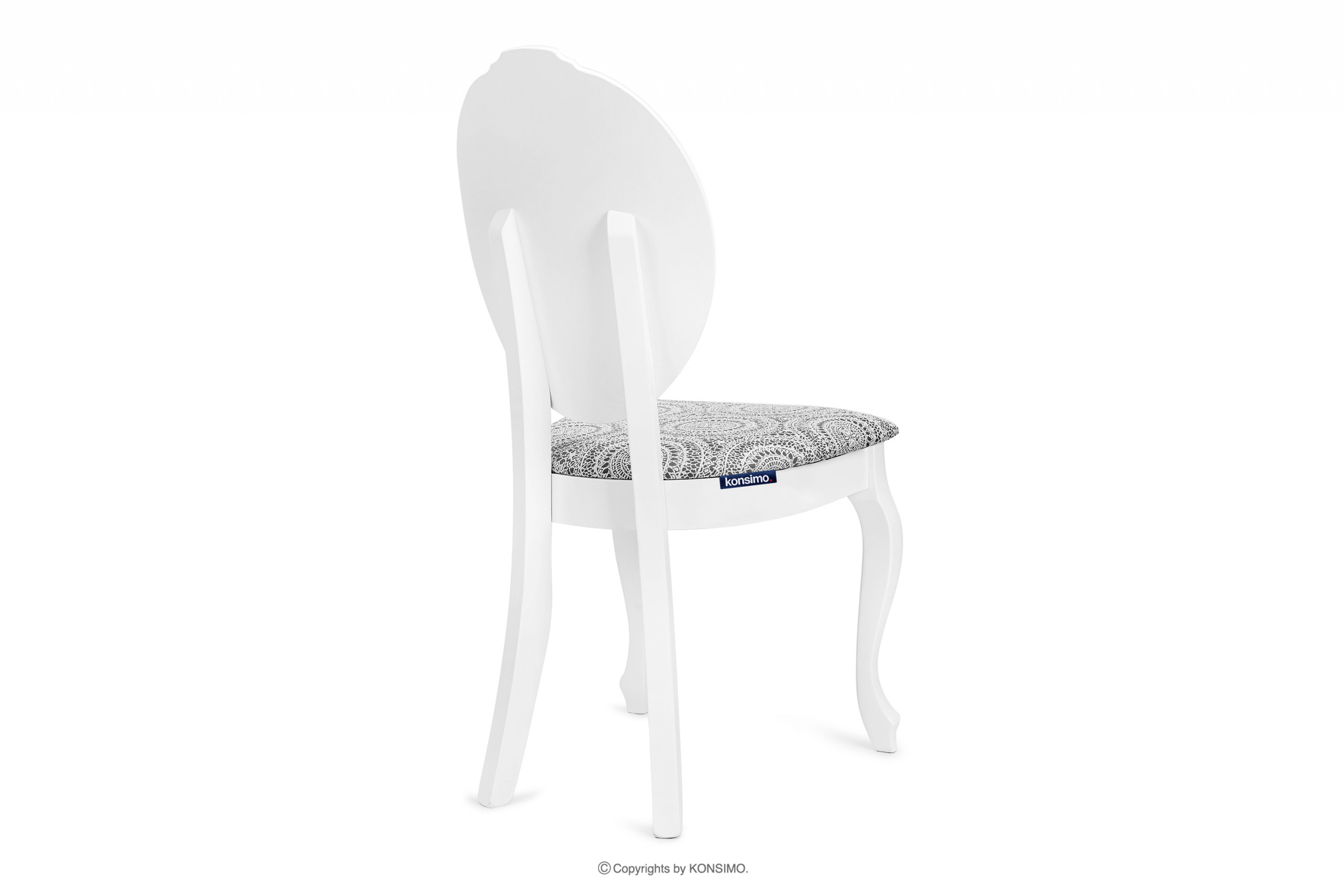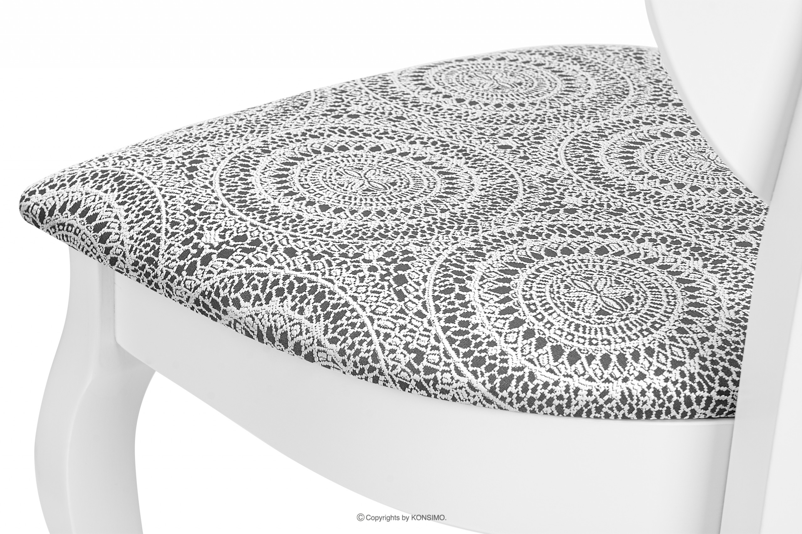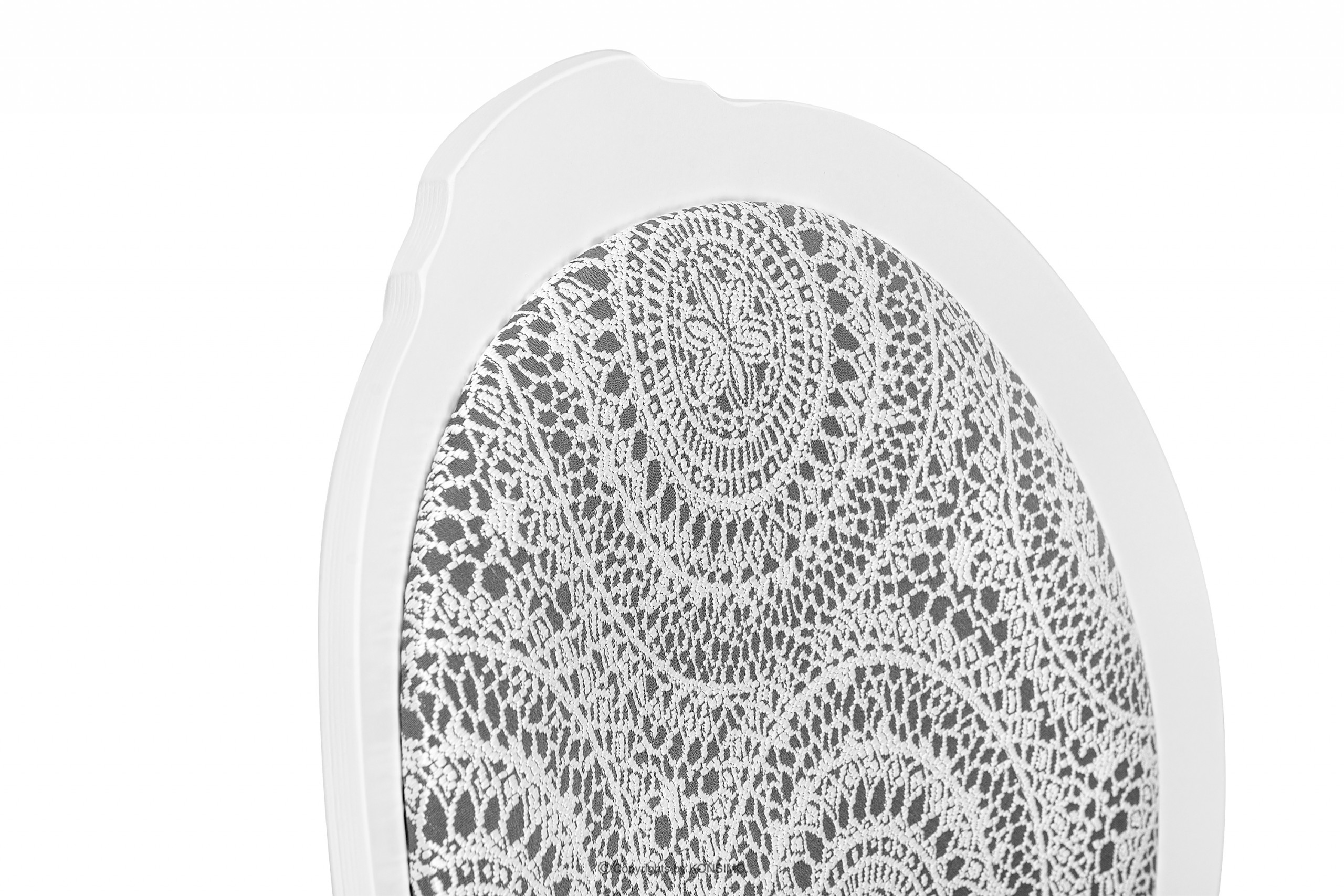 Luxuriöser Stuhl im Glamour-Stil, ideal für einen eleganten Schminktisch oder ein stilvolles Esszimmer. Veredelt mit einem Jacquard-Stoff mit dezentem Prägemuster, der dem Möbelstück einen exklusiven Charakter verleiht. Die bequeme Sitzfläche und Rückenlehne sind mit hochwertigem Polyurethanschaumstoff T-30 und 40 / T-25 und 170 gefüllt, der für ideale Elastizität und Langlebigkeit sorgt.