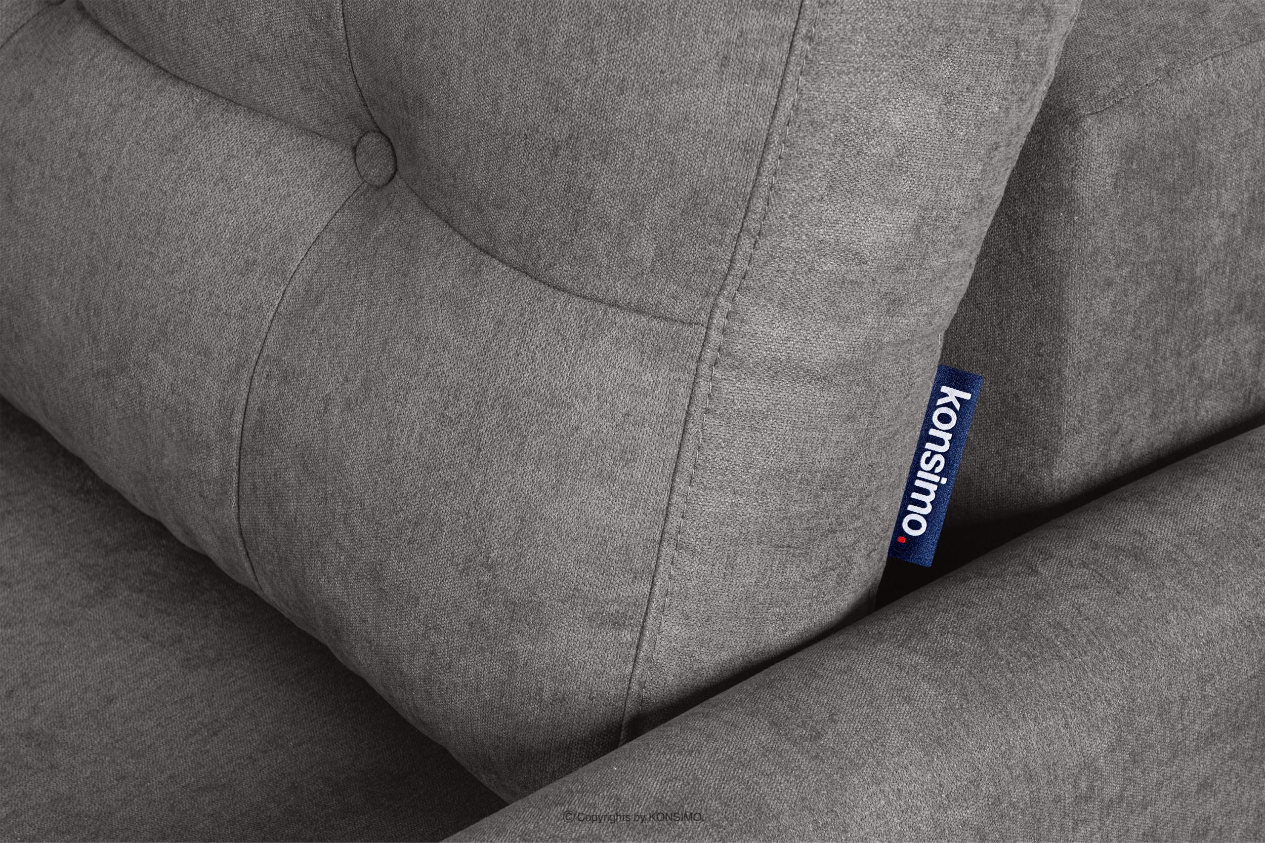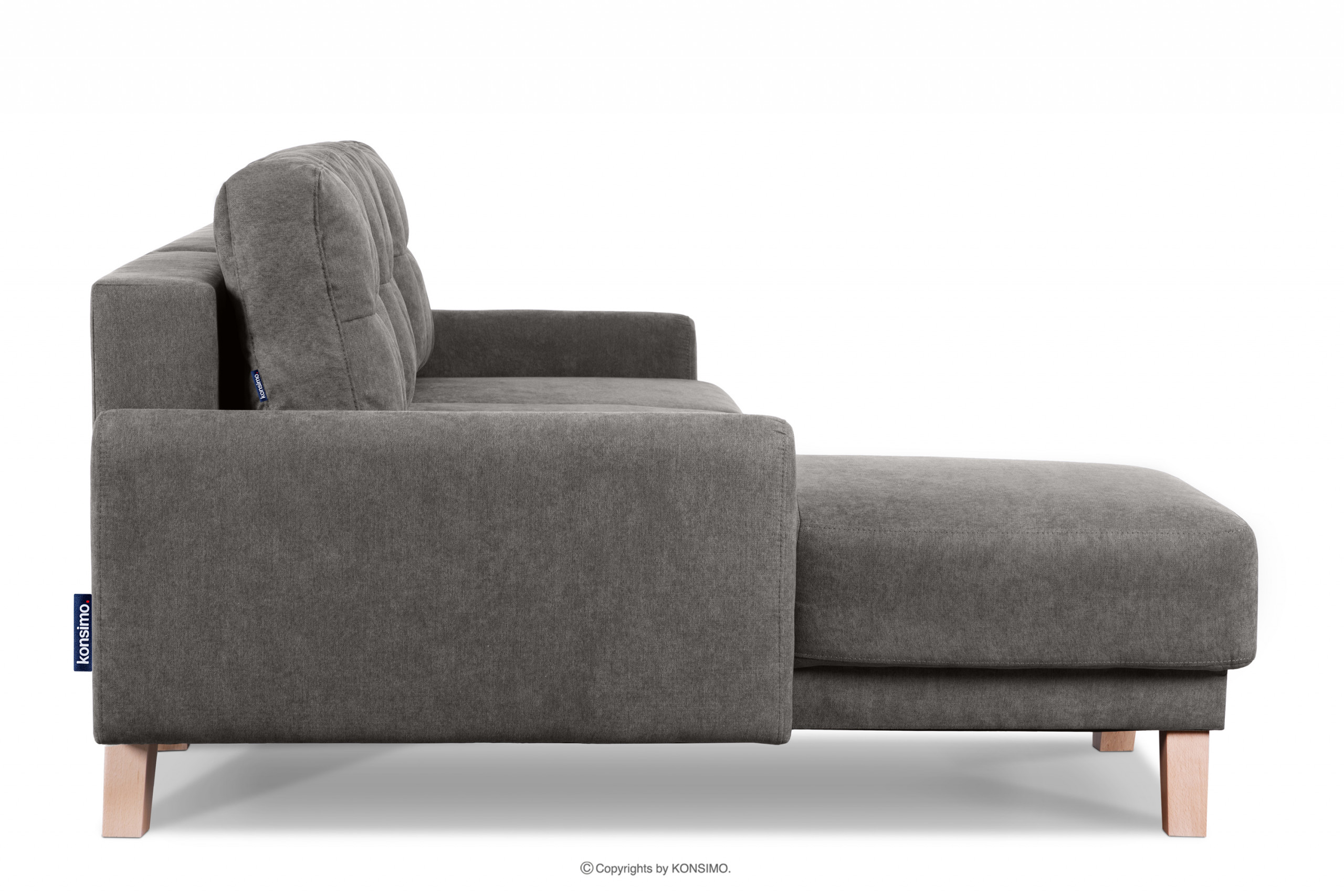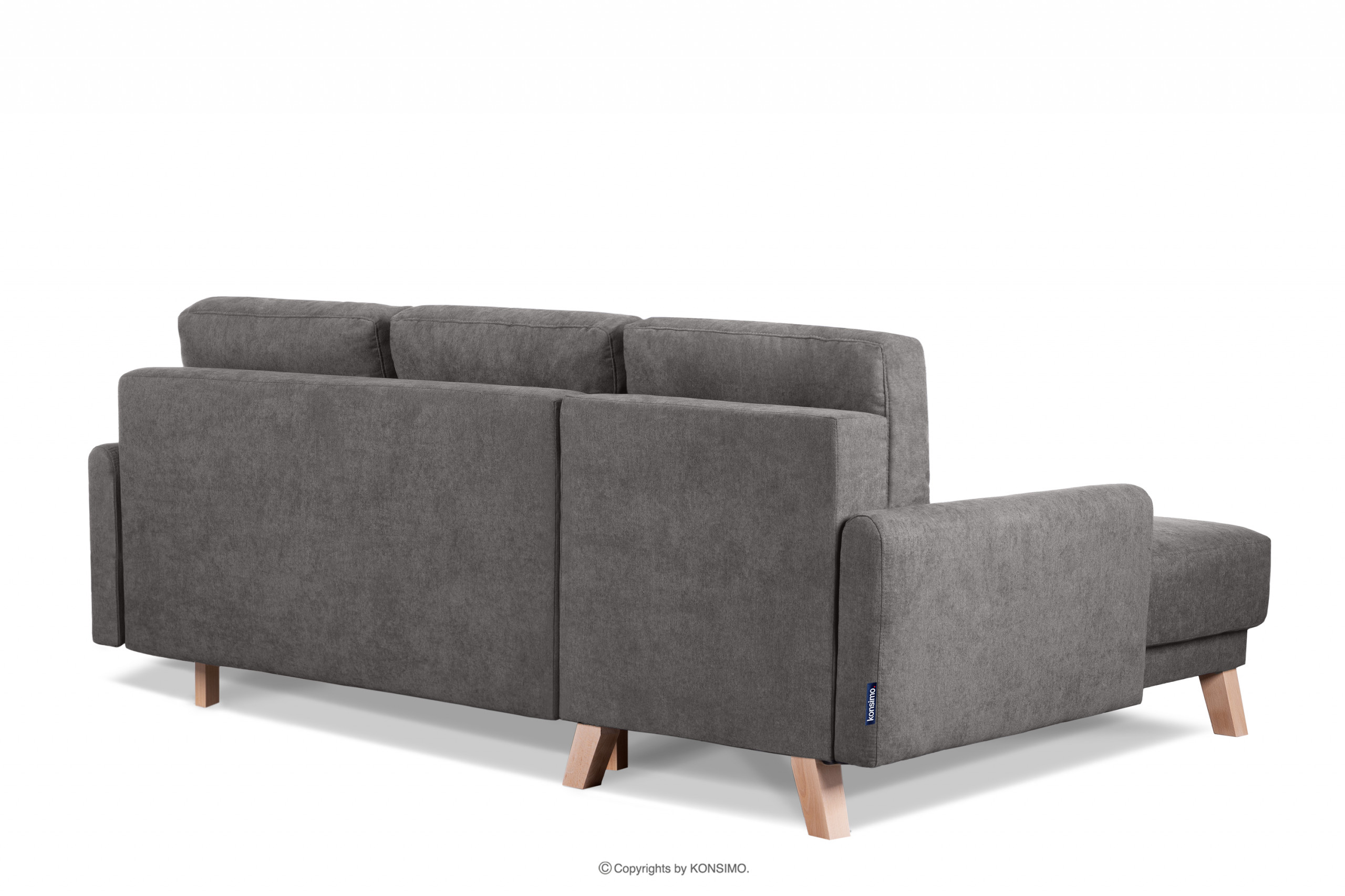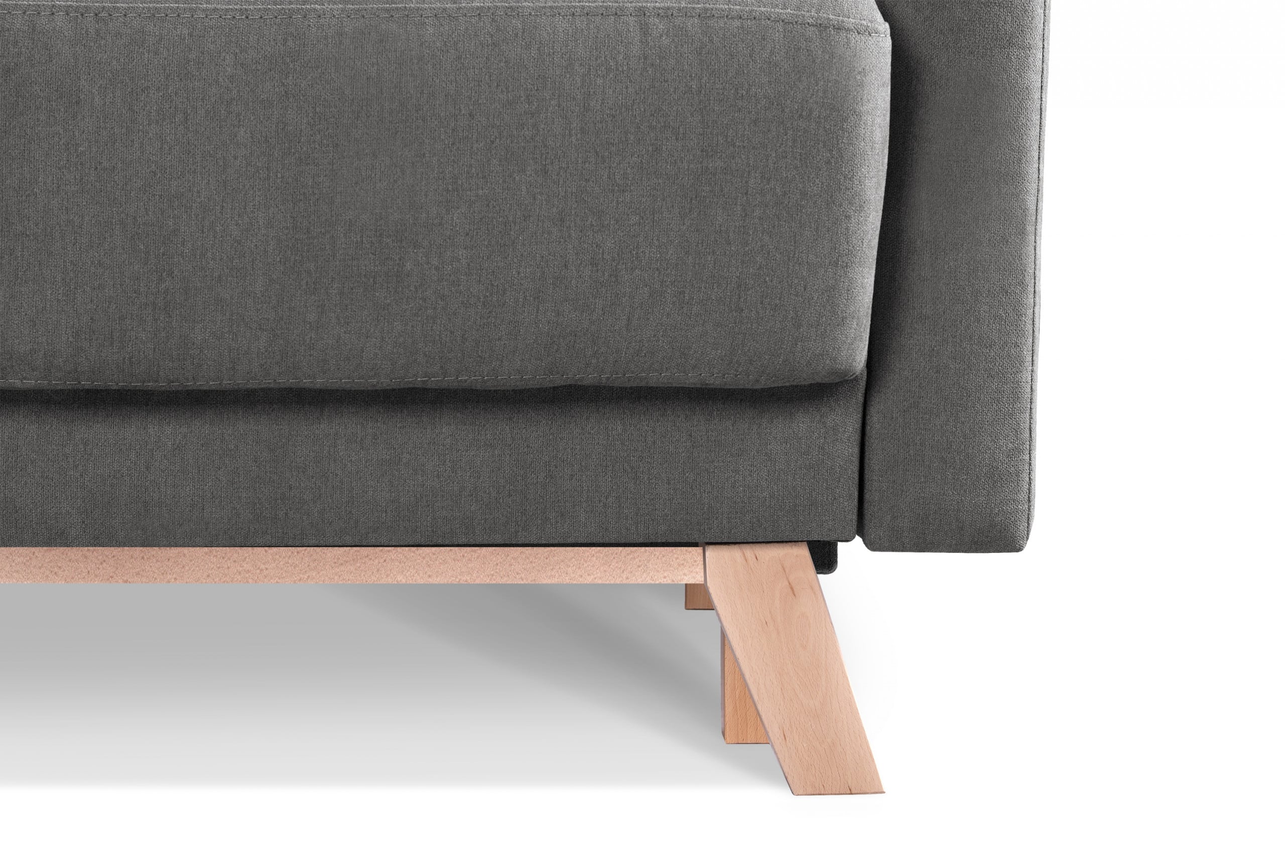 Ausziehbares Ecksofa mit Stauraum für Bettwäsche, grau, linksseitig, im skandinavischen Stil, mit Buchenholzfüßen und Einsätzen. Es verfügt über eine Schlaffunktion und einen Stauraum für Bettwäsche, was besonders in kleinen Räumen praktisch ist. Es verwendet das DL-System, das sehr einfach und schnell zu bedienen ist. Die Sitzfläche ist mit T30-Schaumstoff gefüllt und verfügt über wellenförmige Federn des Typs B, wodurch sie nicht einsinkt und ihre Form behält.