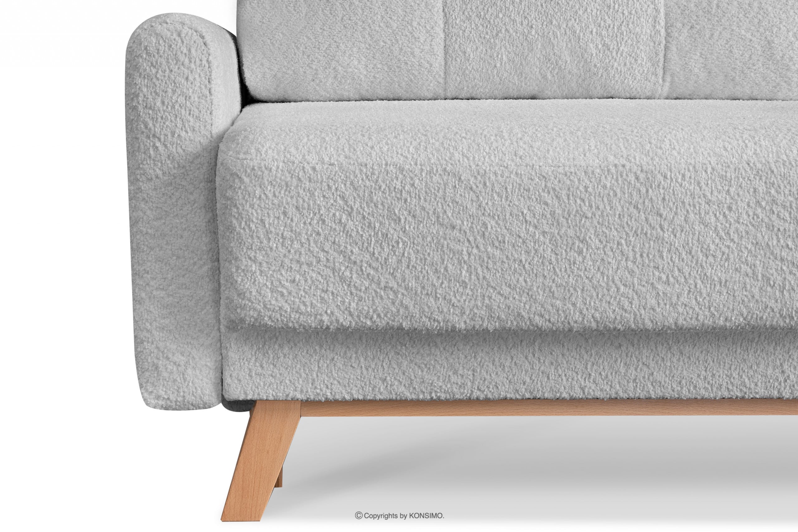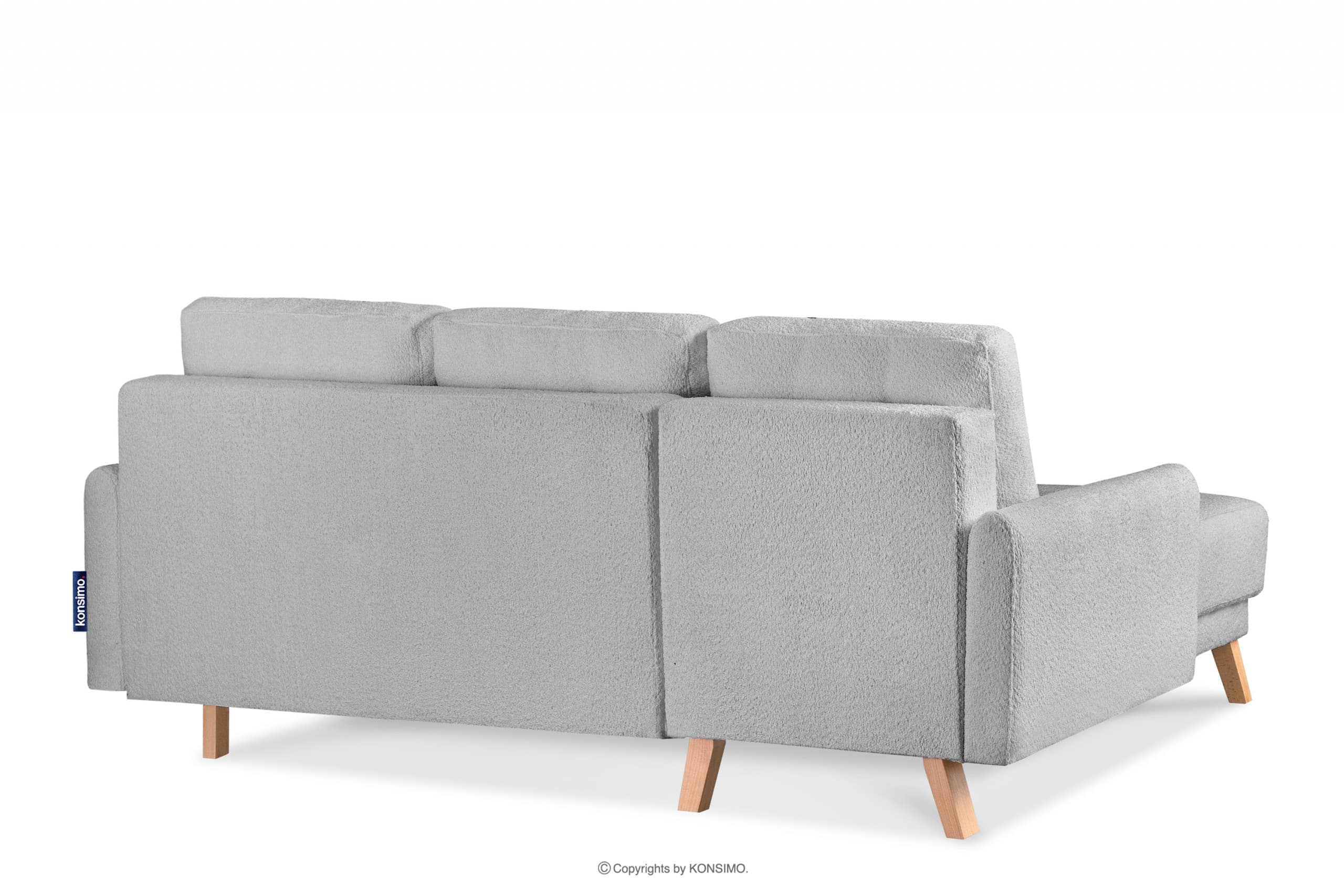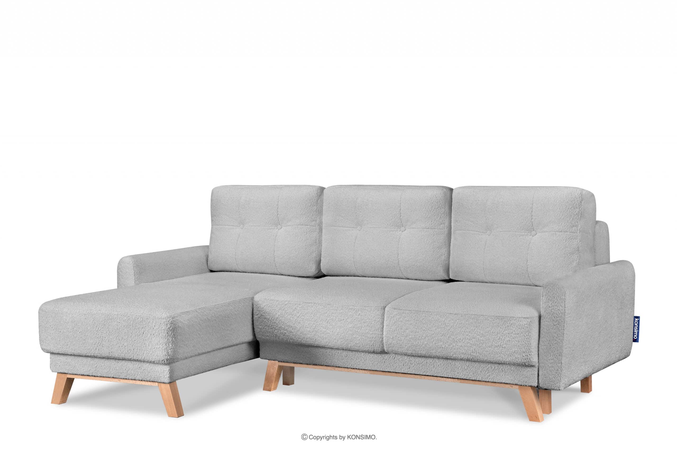 Graue skandinavische Eckcouch aus Bouclé links, gekennzeichnet durch helle Holzbeine und besondere Funktionalität. Außerdem passt seine Farbe perfekt zum skandinavischen Stil. Es verfügt über eine Schlaffunktion und einen Stauraum für Bettwäsche, was besonders in kleinen Räumen praktisch ist. Es wurde das DL-System verwendet, das sehr einfach und schnell zu bedienen ist.