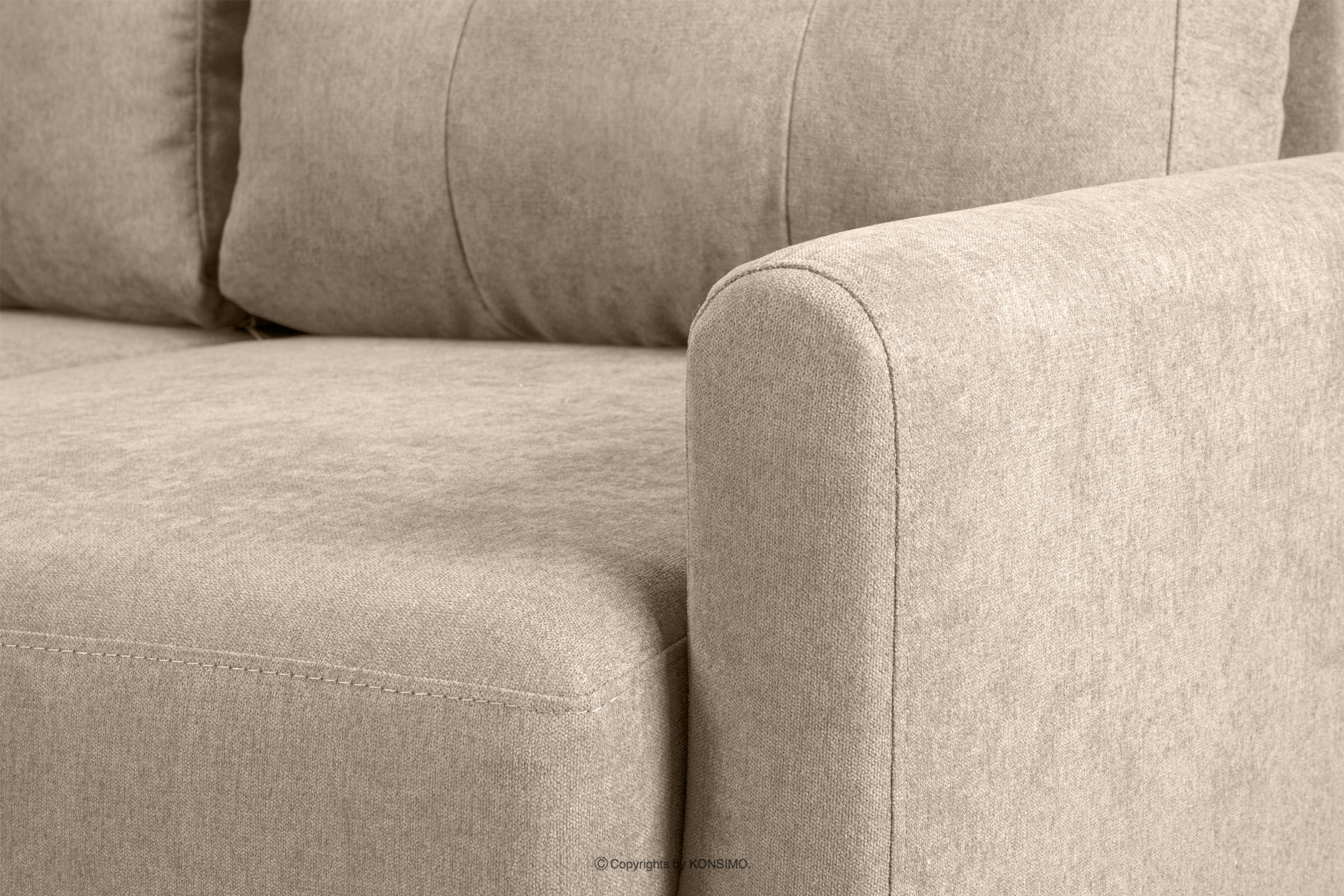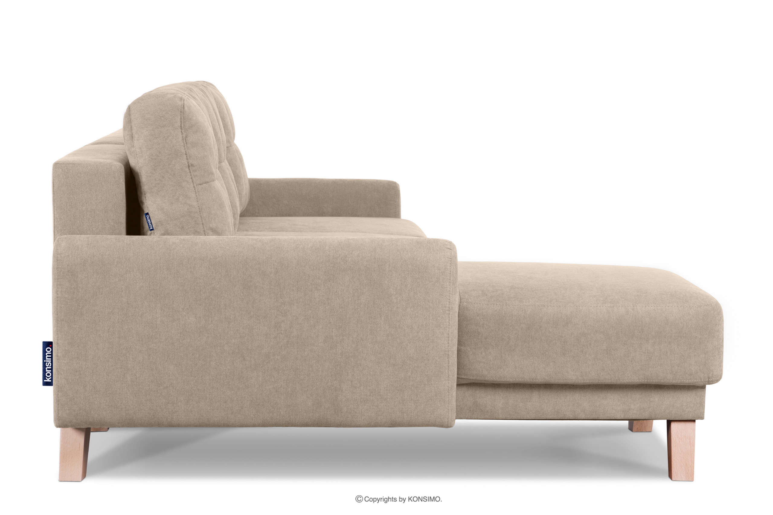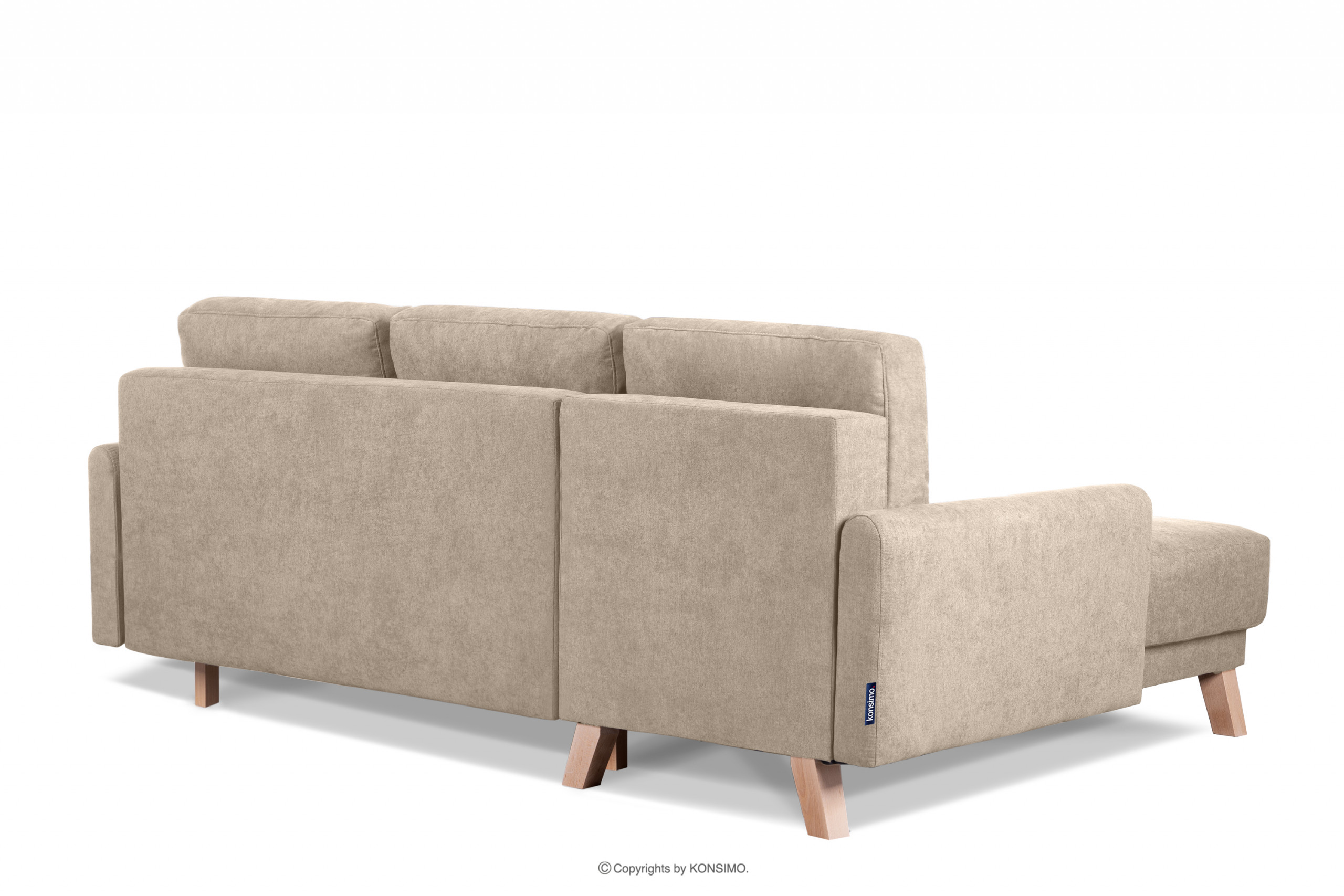 Ausziehbares Ecksofa mit Bettkasten für das Wohnzimmer, beige, links, im skandinavischen Stil, gekennzeichnet durch Buchenholzbeine und -einsätze. Es verfügt über eine Schlaffunktion und einen Bettkasten, was besonders in kleinen Räumen praktisch ist. Es verwendet das DL-System, das sehr einfach und schnell zu bedienen ist. Die Sitzfläche ist mit T30-Schaumstoff gefüllt und verfügt über gewellte B-Typ Federn, so dass sie nicht einsinkt und ihre Form behält.