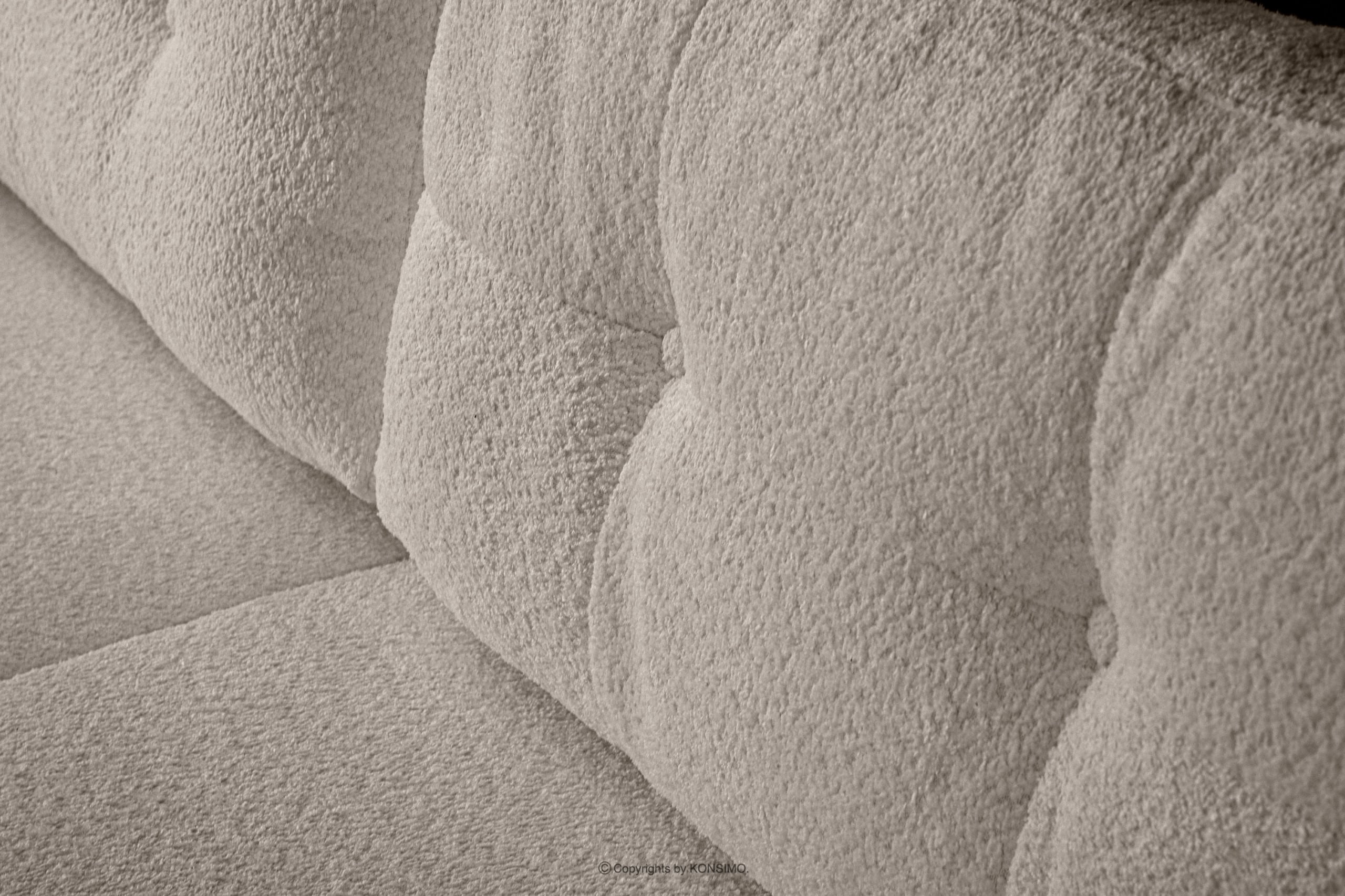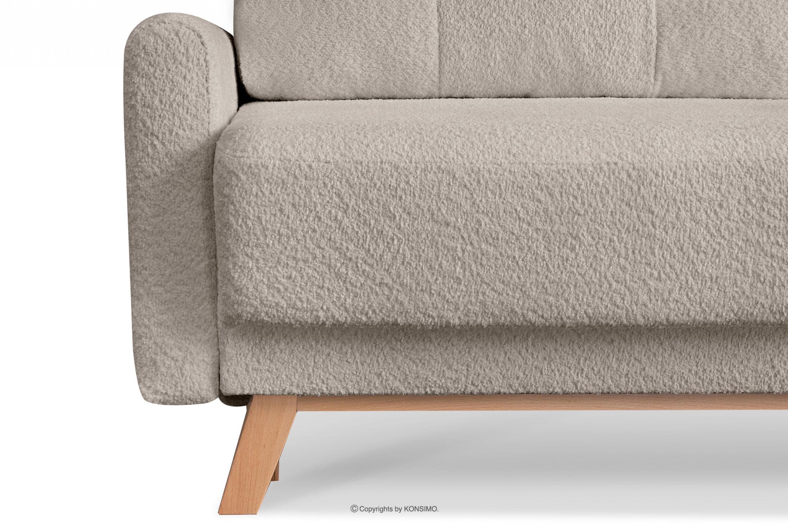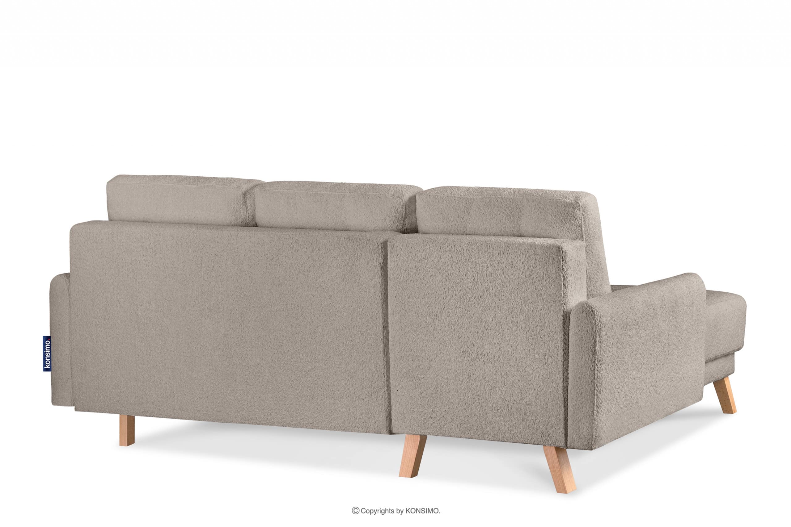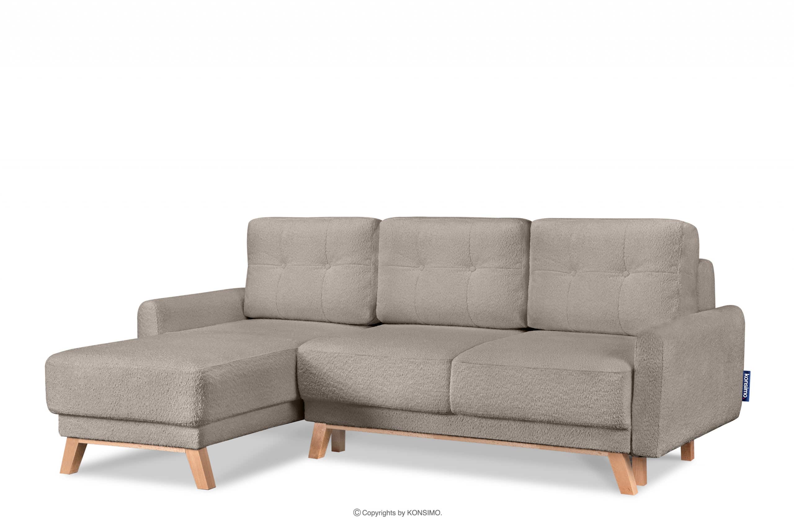 Beige skandinavisches Ecksofa aus Boucléstoff links, mit hellen Holzbeinen und besonderer Funktionalität. Außerdem passt seine Farbe perfekt zum skandinavischen Stil. Es verfügt über eine Schlaffunktion und einen Stauraum für Bettwäsche, was besonders in kleinen Räumen praktisch ist. Es verwendet das DL-System, das sehr einfach und schnell zu bedienen ist. Der Sitz ist mit T30-Schaumstoff gefüllt und verwendet Wellenfedern vom Typ B, wodurch das Sofa nicht einsinkt und der Schaumstoff seine Form nicht verliert.