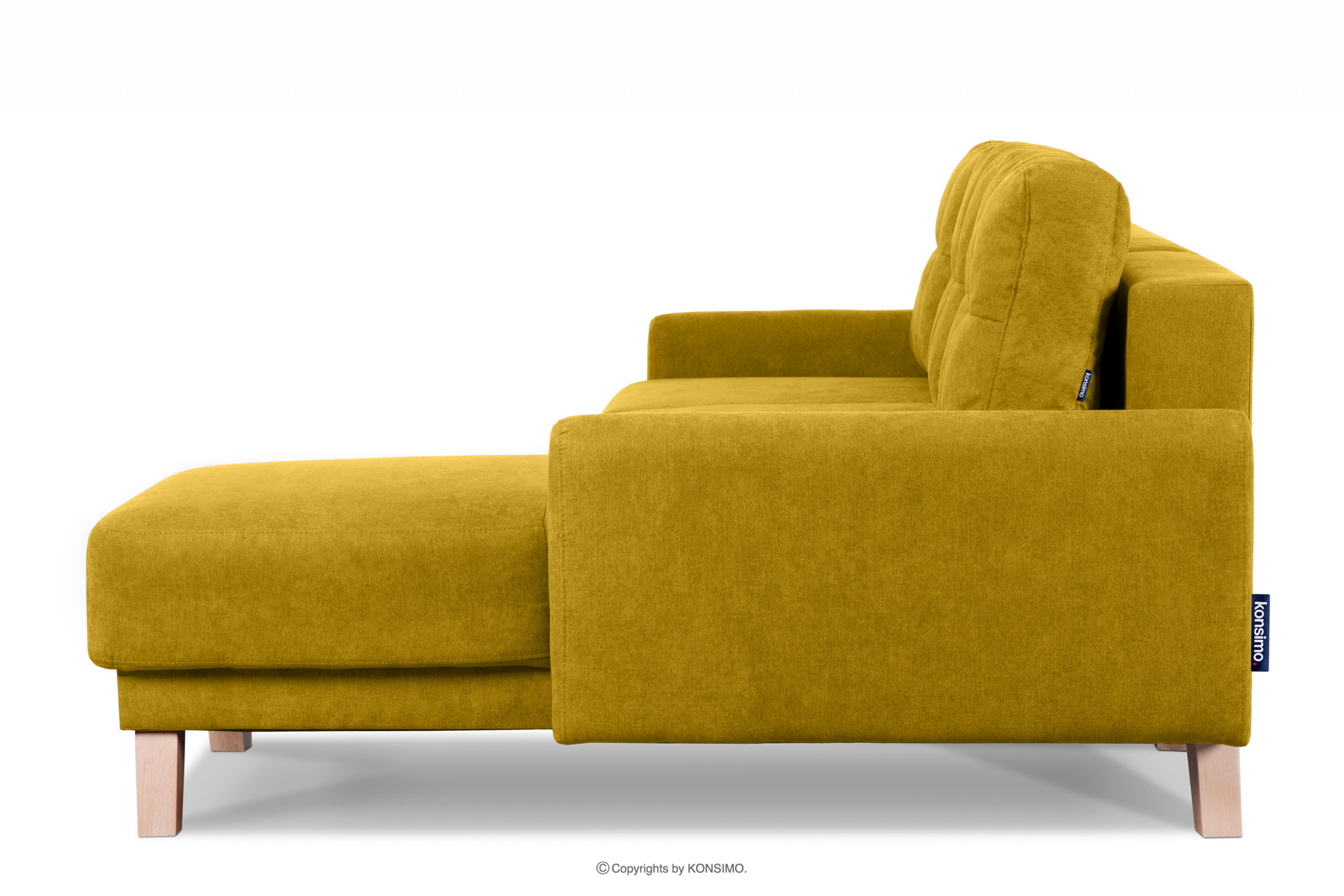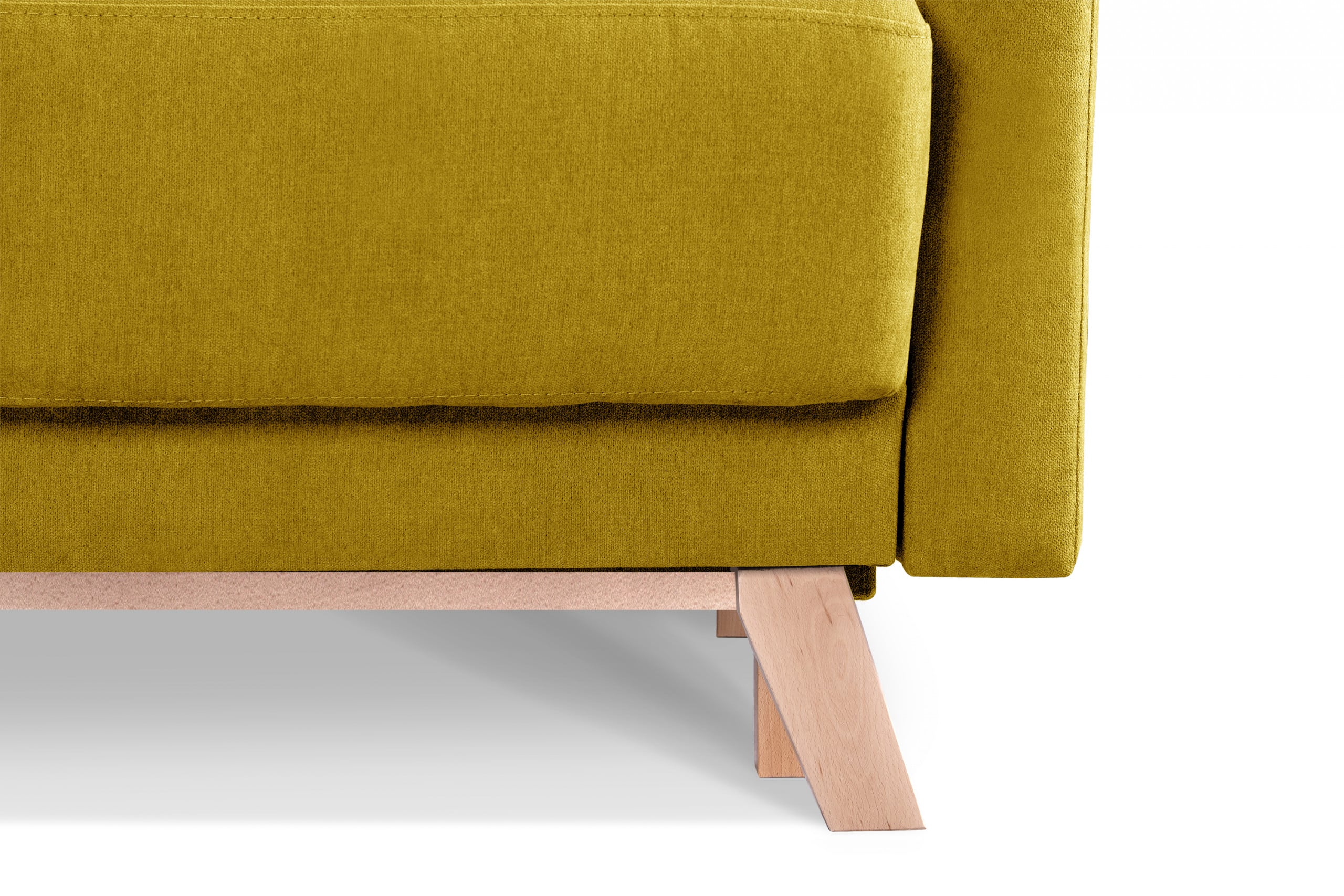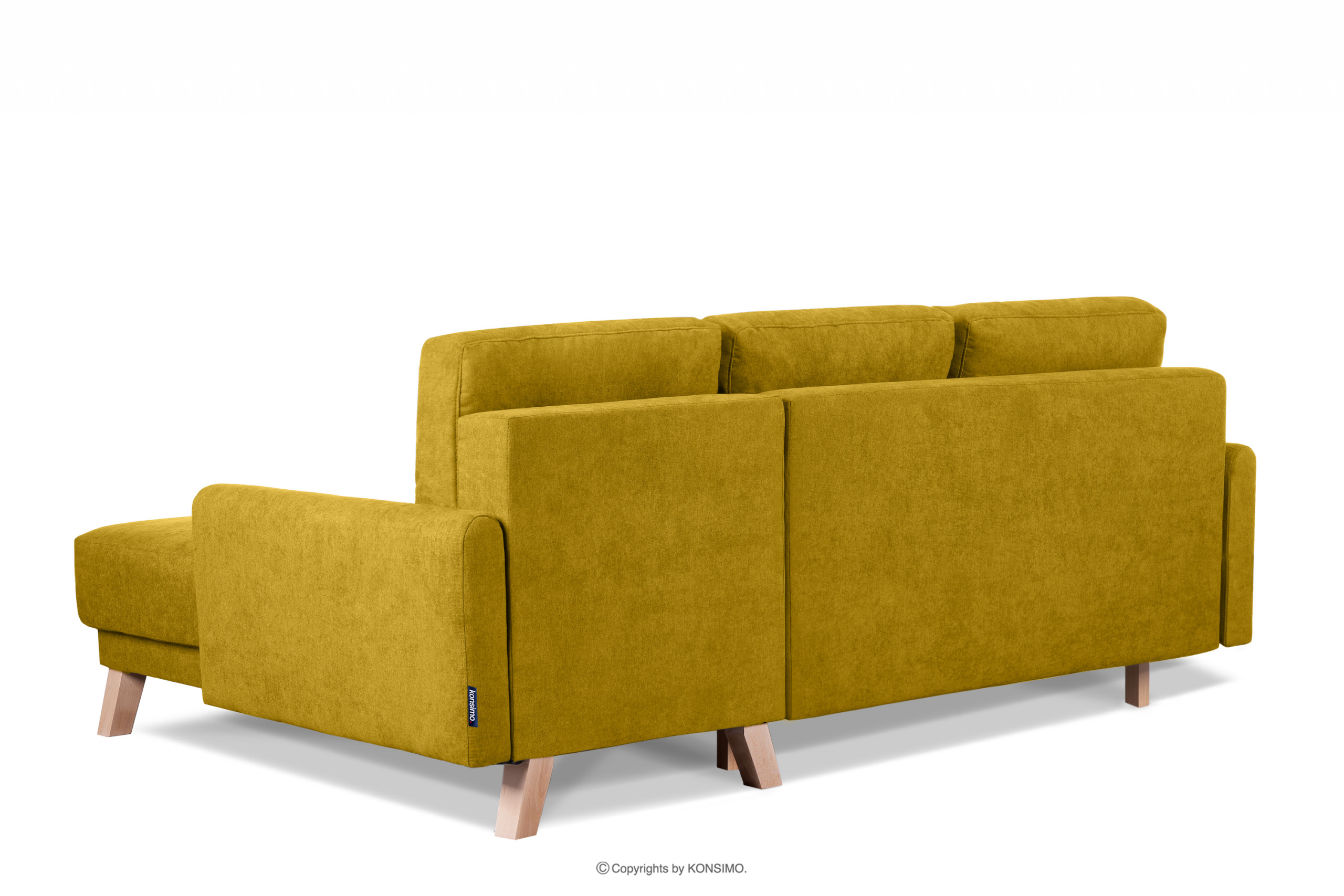 Ausziehbares Ecksofa für das Wohnzimmer mit Stauraum für Bettwäsche, gelb, rechts, im skandinavischen Stil, gekennzeichnet durch helle Holzfüße und besondere Funktionalität. Darüber hinaus passt seine Farbe perfekt zum nordischen Trend. Es verfügt über eine Schlaffunktion sowie einen Stauraum für Bettwäsche, was besonders in kleinen Räumen praktisch ist. Es wurde das DL-System verwendet, das sehr einfach und schnell zu bedienen ist.
