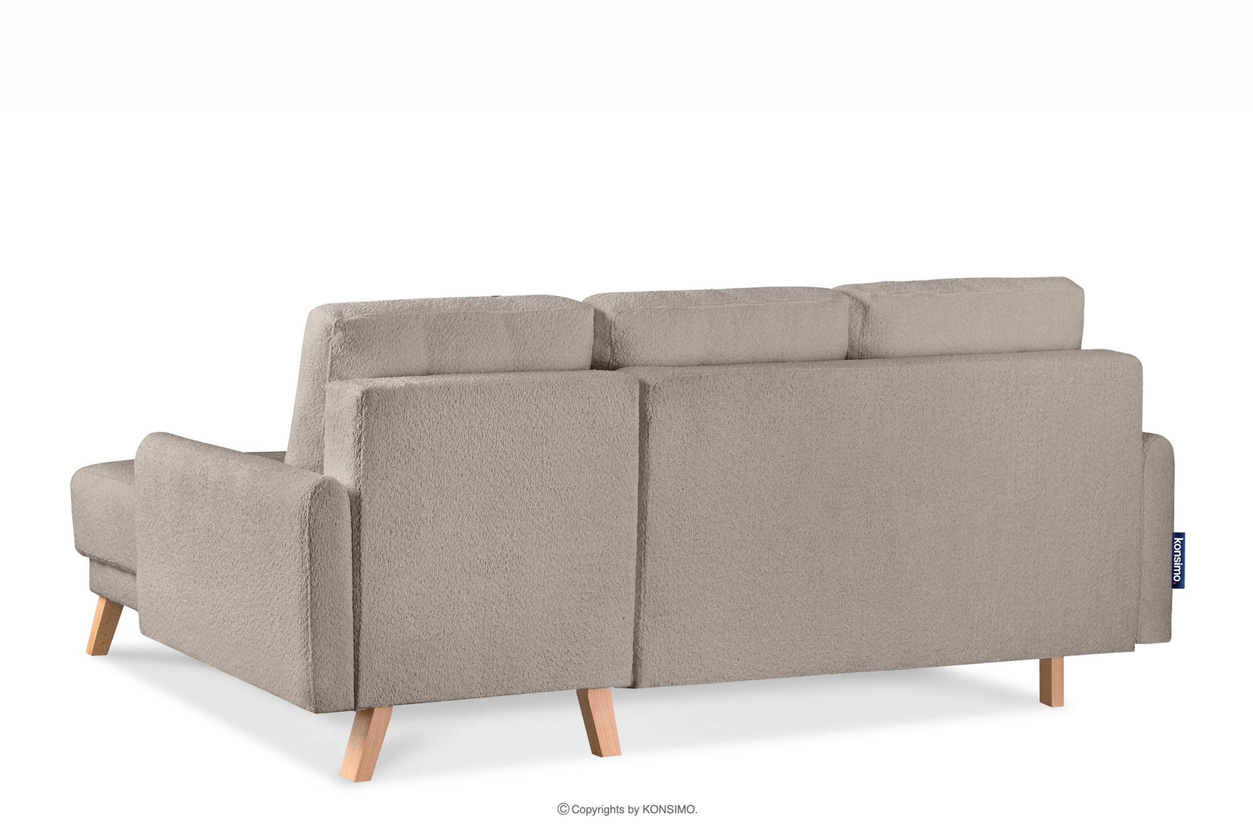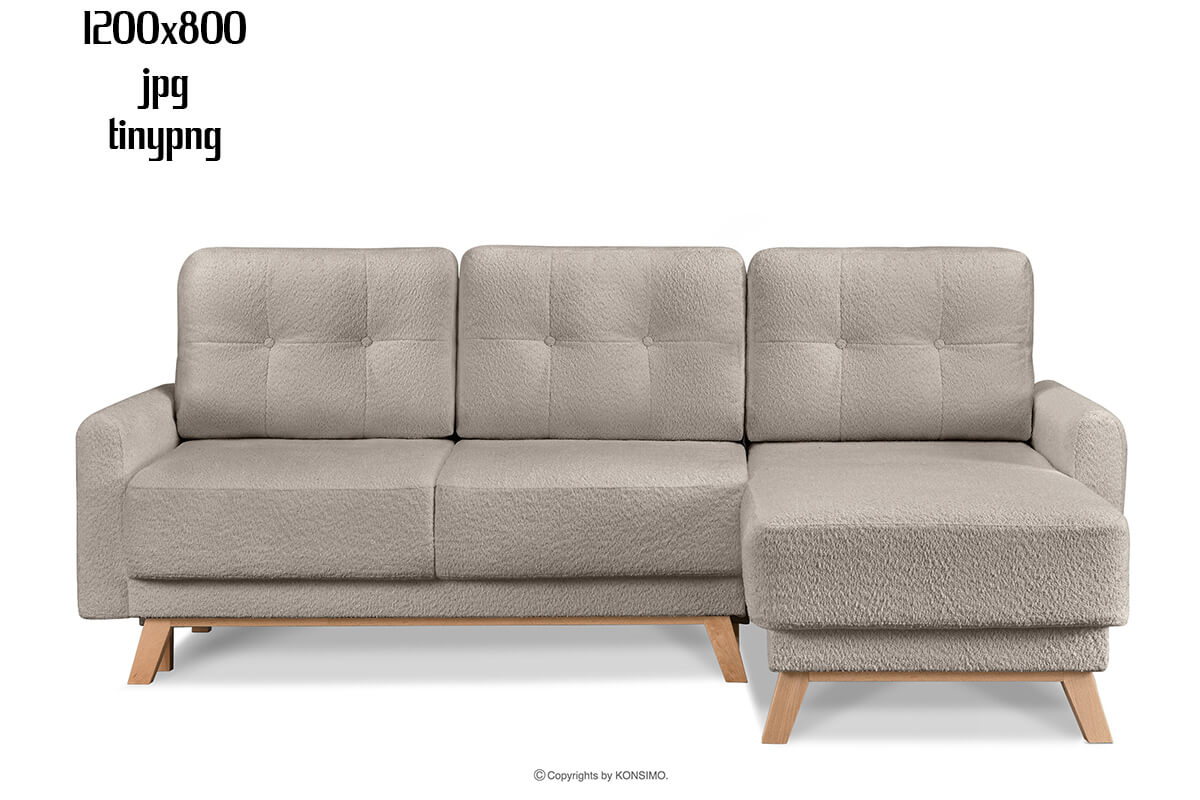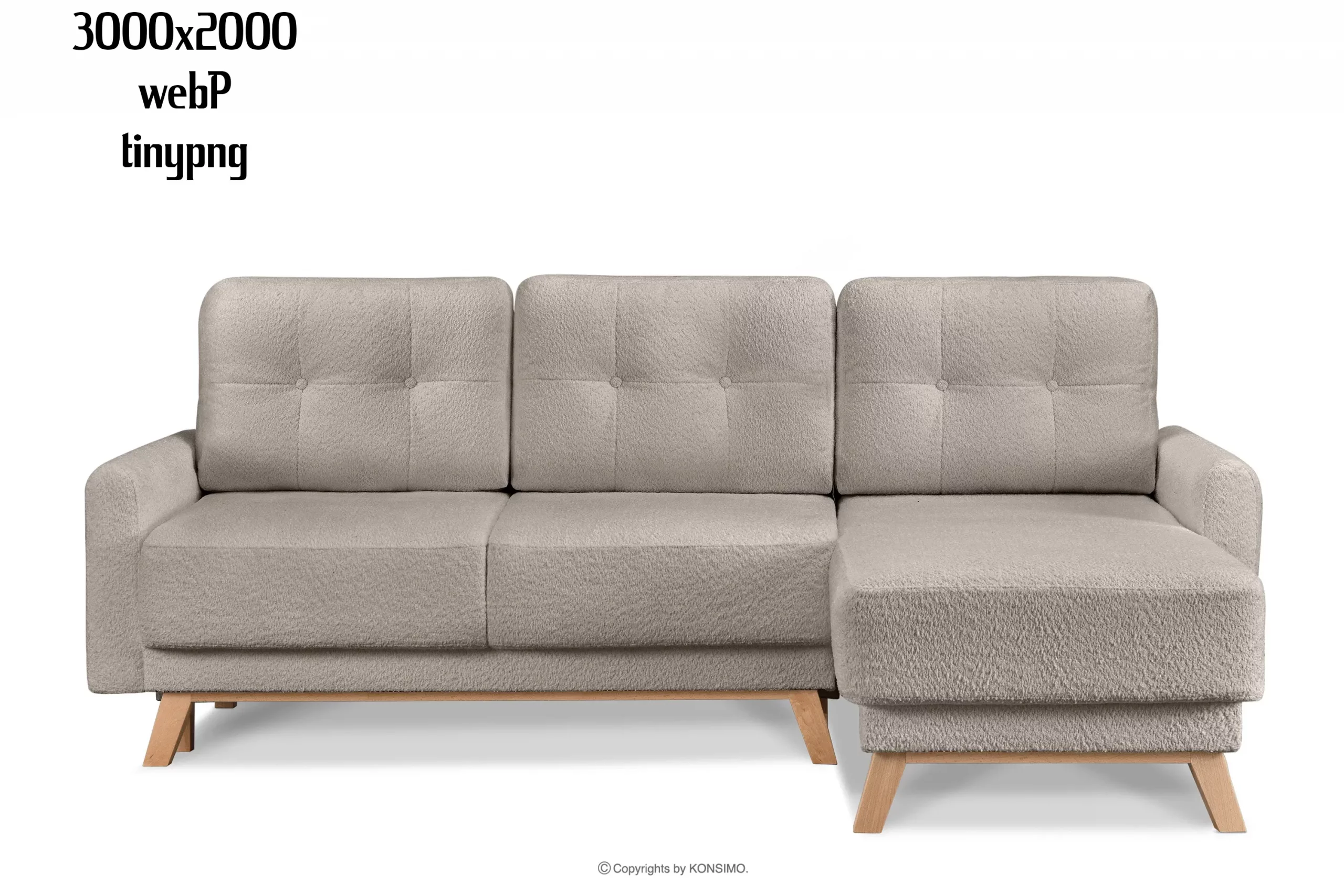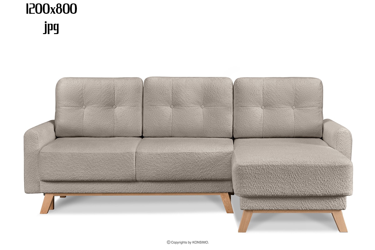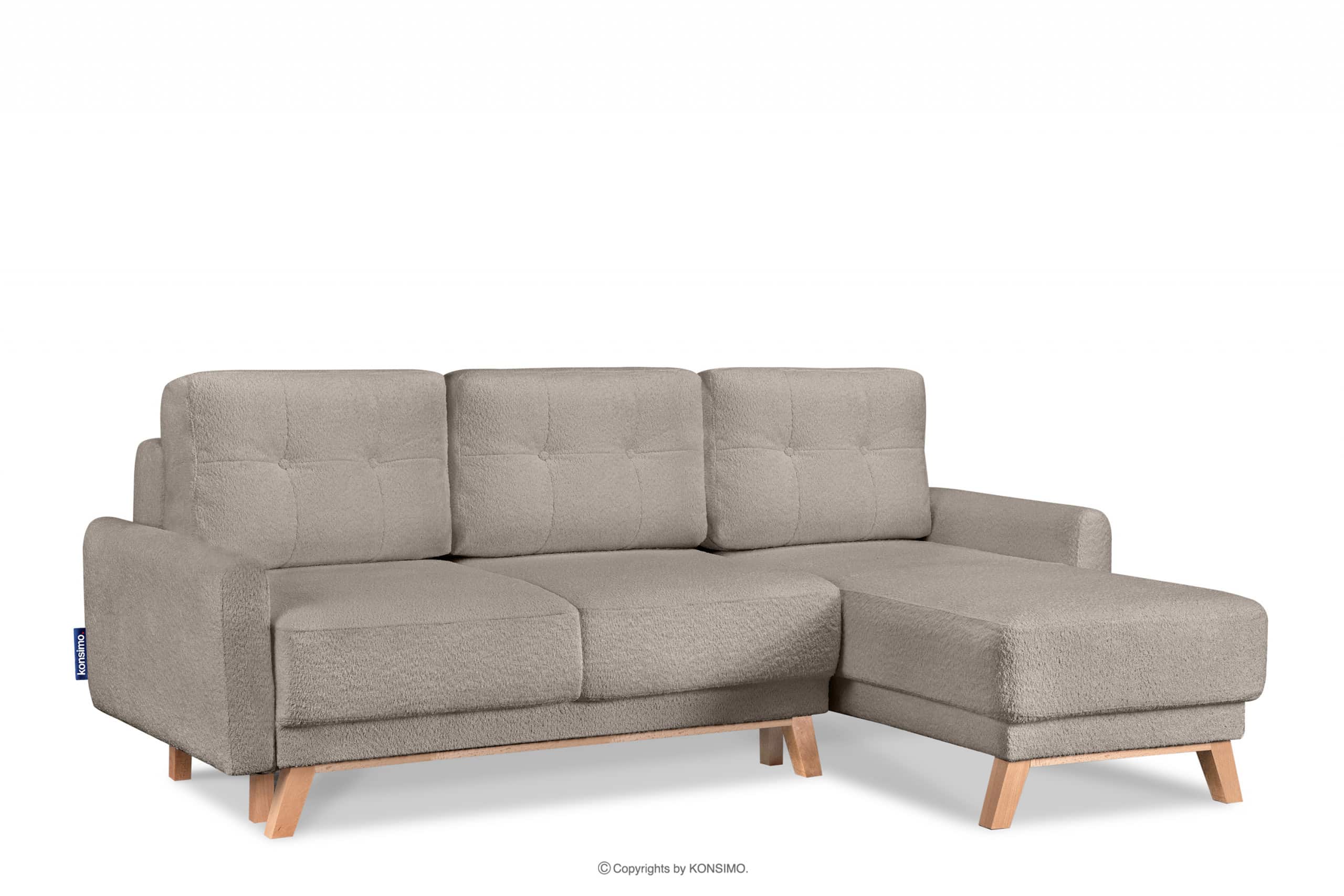 Beiger skandinavischer Ecksofa aus Schafstoff rechts, gekennzeichnet durch helle Holzbeine und besondere Funktionalität. Darüber hinaus passt seine Farbe perfekt zum skandinavischen Stil. Es verfügt über eine Schlaffunktion und einen Bettkasten, was besonders in kleinen Räumen praktisch ist. Es wurde das DL-System verwendet, das sehr einfach und schnell zu bedienen ist. Die Sitzfläche ist mit T30-Schaumstoff gefüllt und es wurden wellenförmige Federn vom Typ B verwendet, dank denen das Ecksofa nicht einsinkt und der Schaumstoff seine Form nicht verliert.