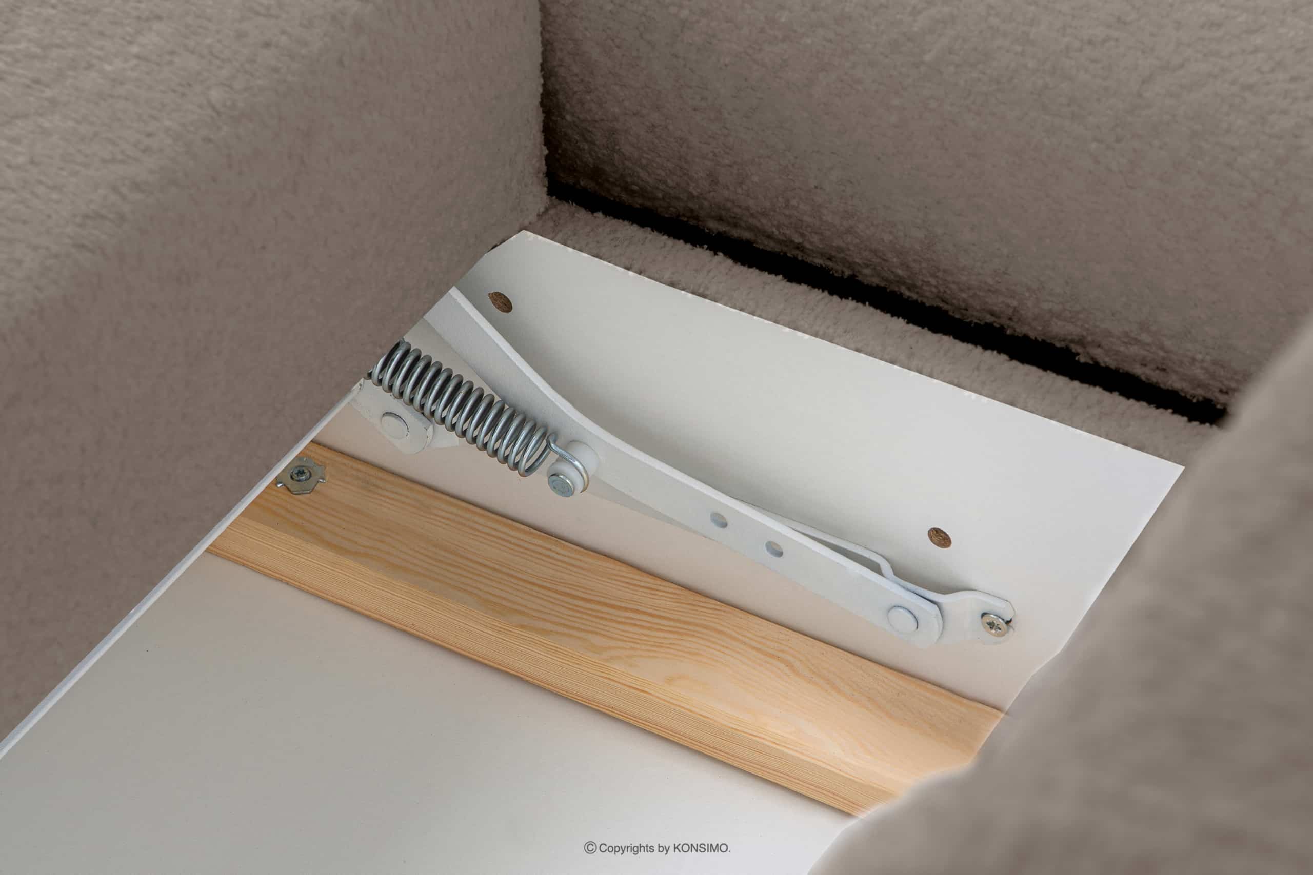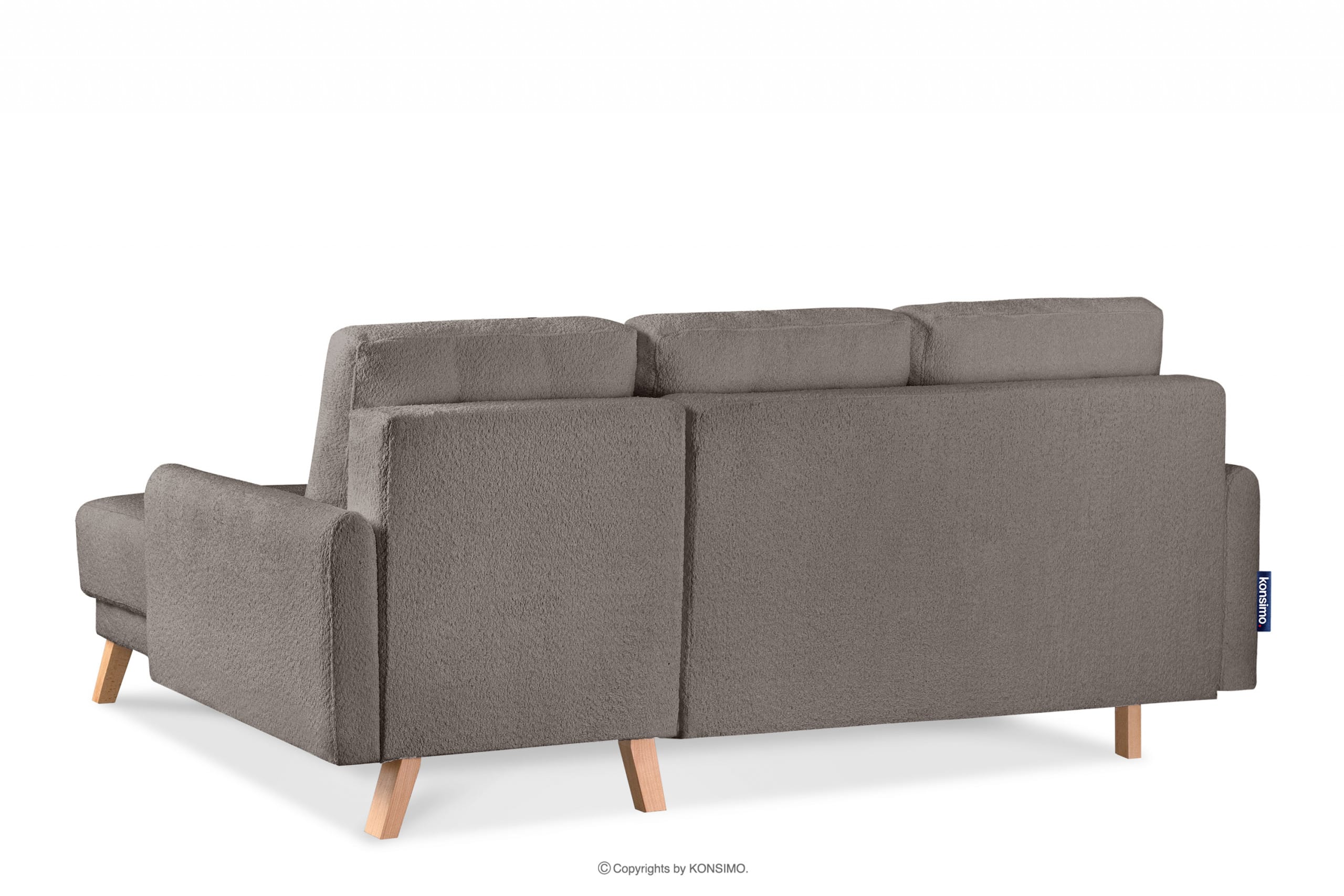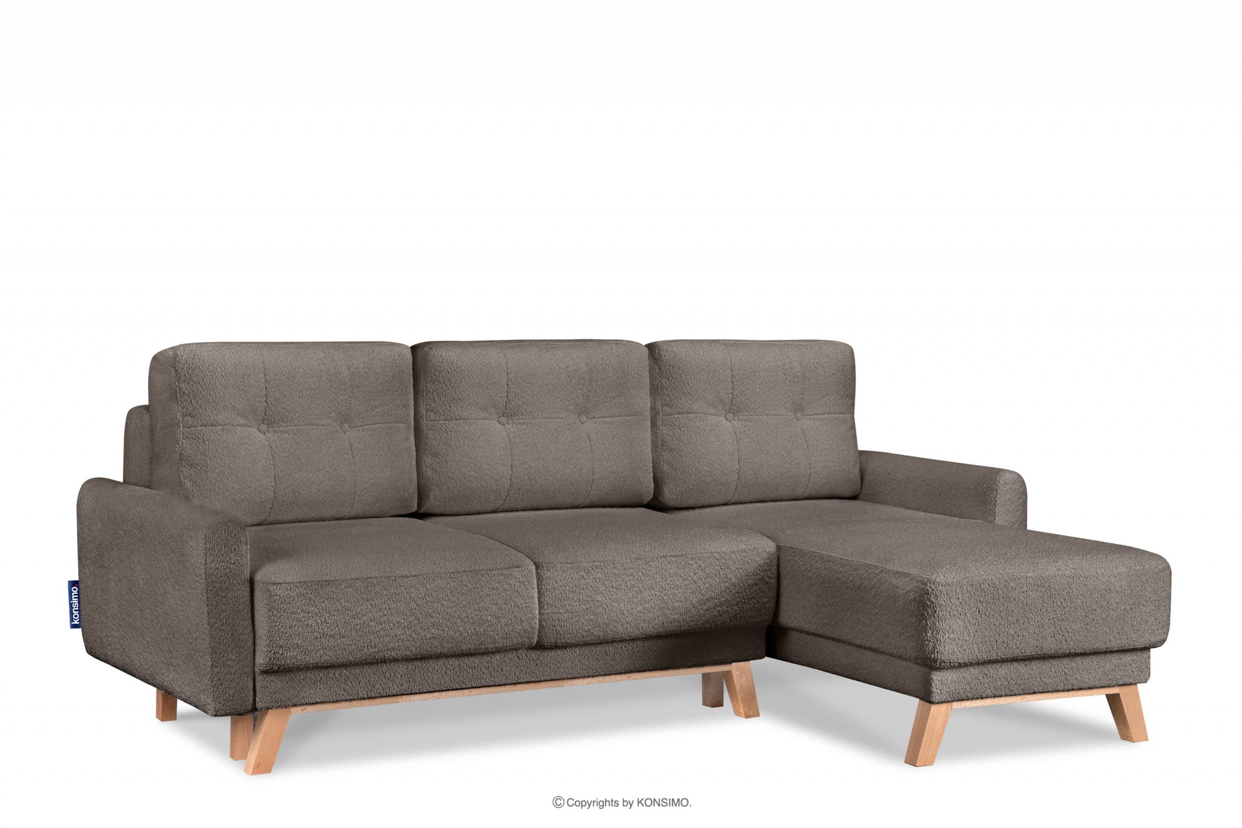 Braunes skandinavisches Ecksofa aus Boucléstoff rechts, gekennzeichnet durch helle Holzbeine und besondere Funktionalität. Außerdem passt seine Farbe perfekt zur nordischen Mode. Es verfügt über eine Schlaffunktion und einen Bettkasten, was besonders in kleinen Räumen praktisch ist. Es wurde das DL-System verwendet, das sehr einfach und schnell zu bedienen ist. Die Sitzfläche ist mit T30-Schaumstoff gefüllt und es wurden wellenförmige Federn vom Typ B verwendet, wodurch das Ecksofa nicht einsinkt und der Schaumstoff seine Form nicht verliert.