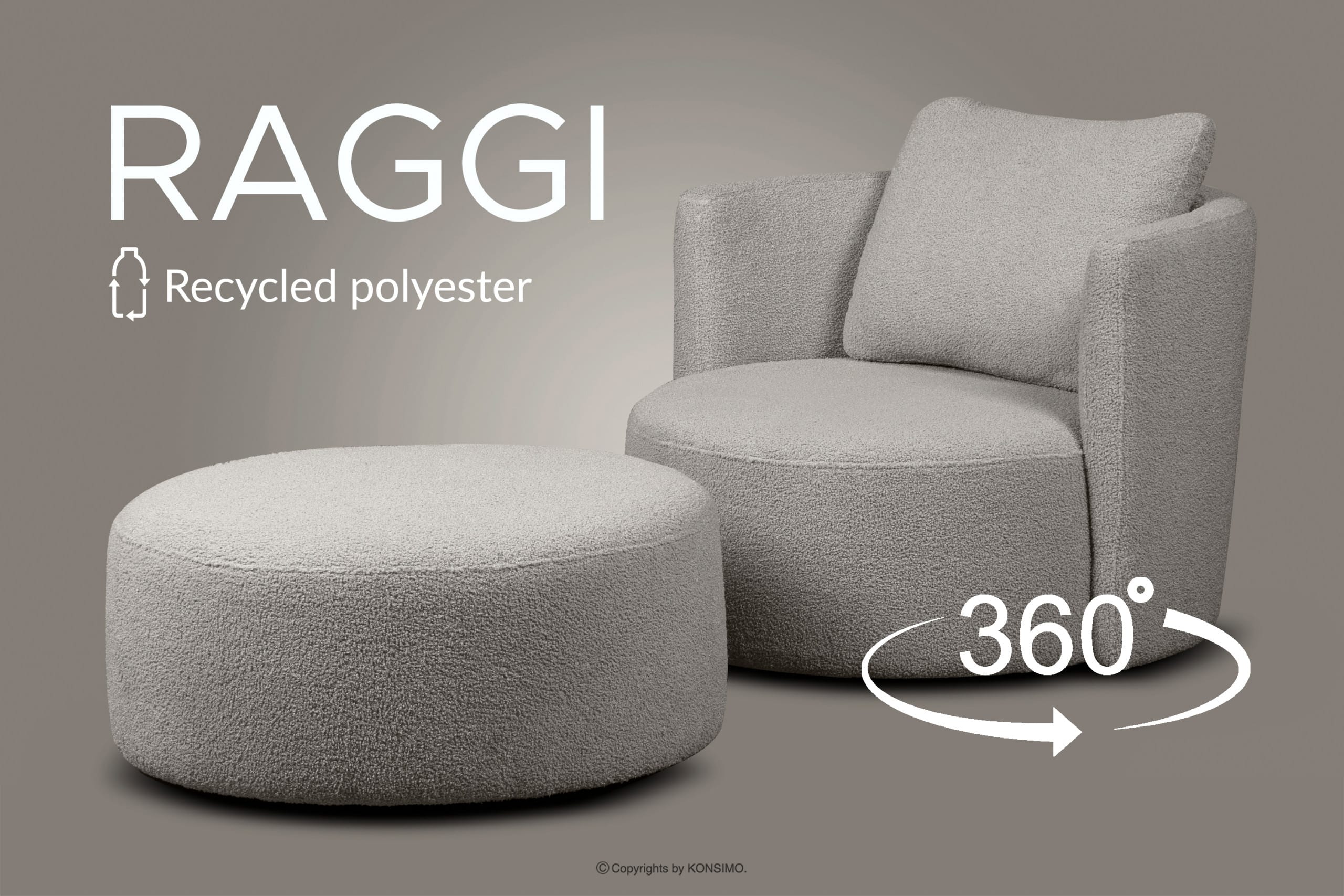 Der Bezug des Stuhls besteht aus einem sogenannten Bouclé, das sehr angenehm anzufassen ist. Ein weiteres Merkmal dieses Möbels ist das drehbare Gestell, das es ermöglicht, den Stuhl um 360 Grad zu drehen. Die Form des RAGGI-Hockers zieht Aufmerksamkeit auf sich und erhöht die Attraktivität des Innenraums.