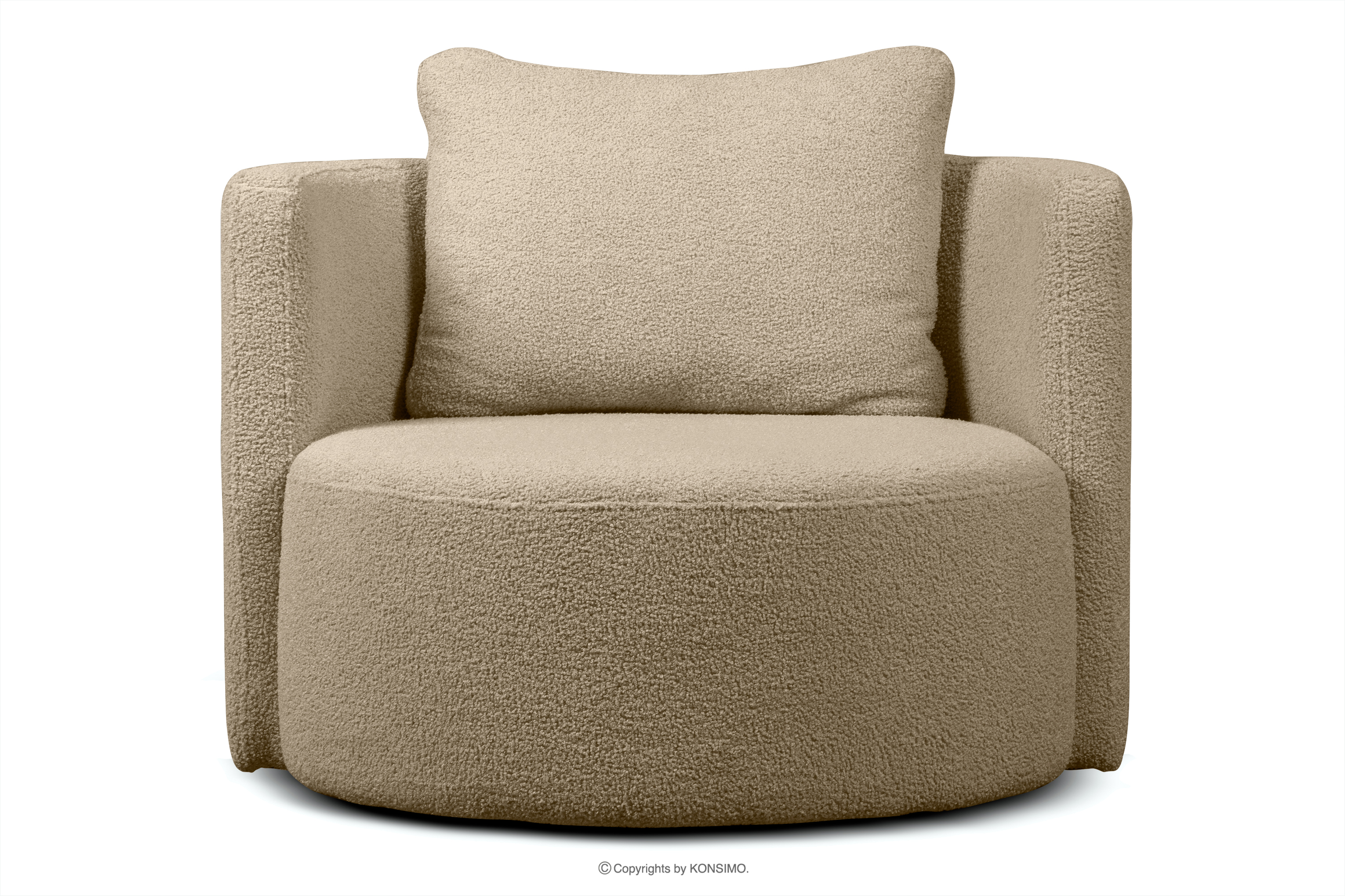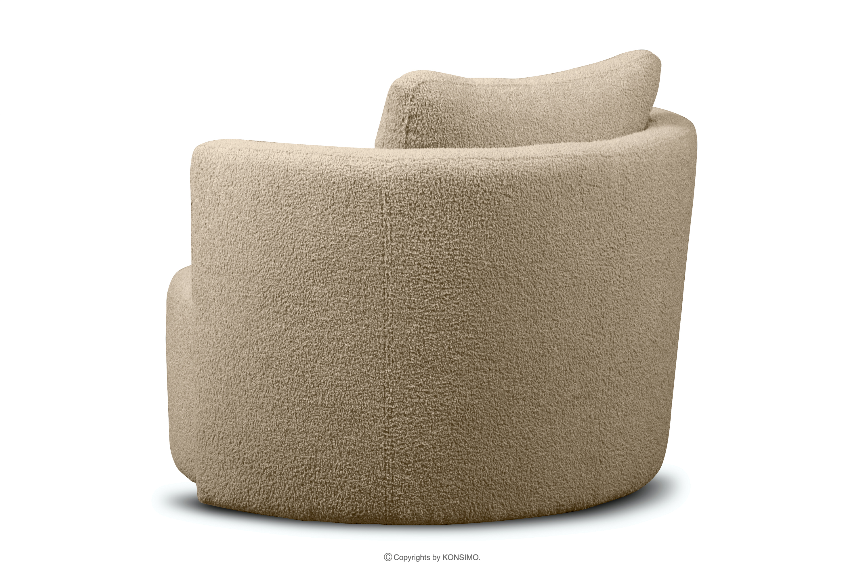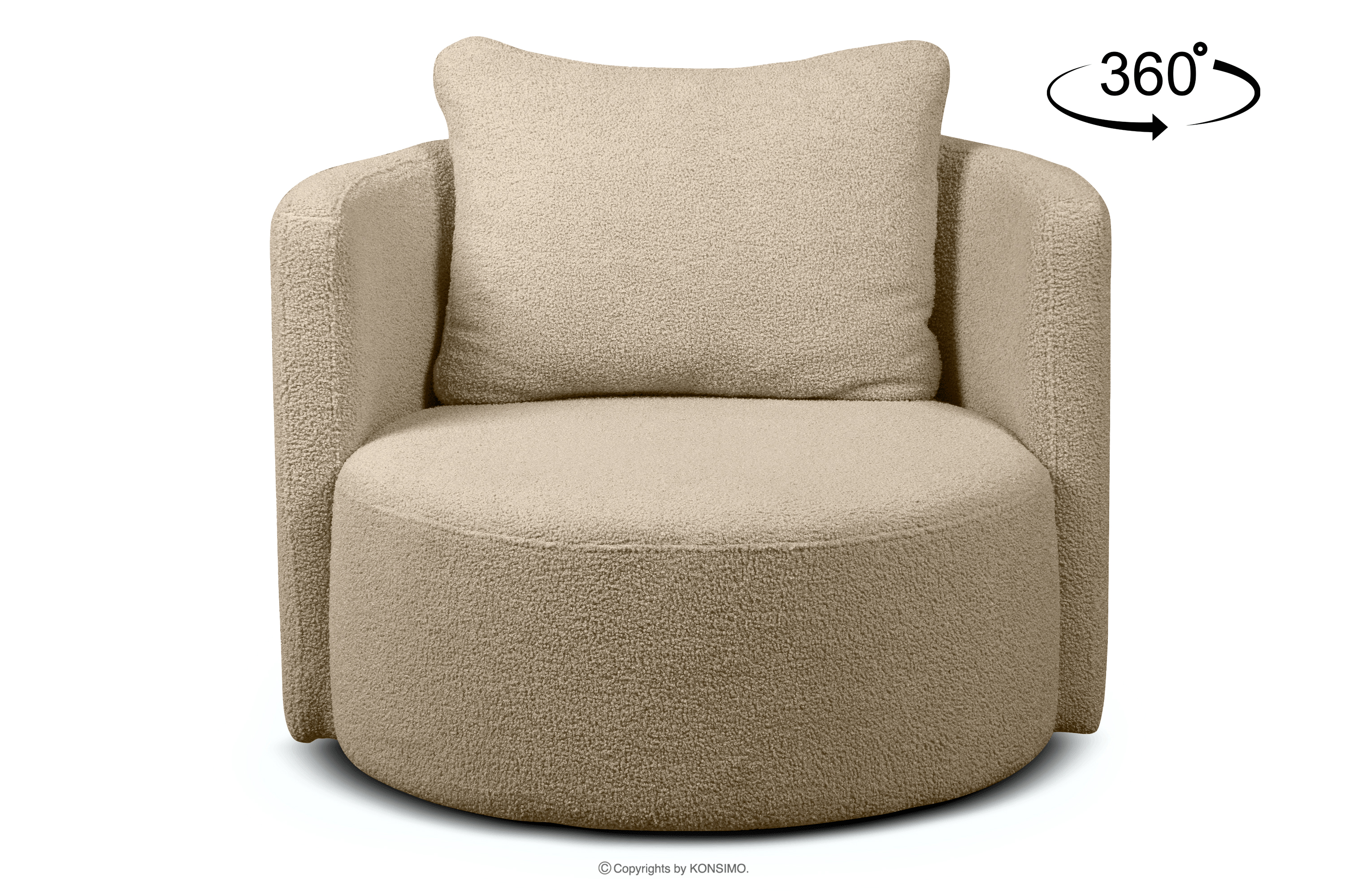 Der beigefarbene drehbare Boucle-Sessel und Hocker RAGGI sind Produkte, die mit ihrem außergewöhnlichen Aussehen jeden anziehen werden. Das Besondere an beiden Elementen ist, dass sie um 360 Grad drehbar sind! Sie sind im modernen Stil gefertigt, passen aber auch zu loftartigen oder sogar boho-Arrangements. Der Sessel ist mit einem sogenannten Bouclé bezogen, das sehr angenehm anzufassen ist.