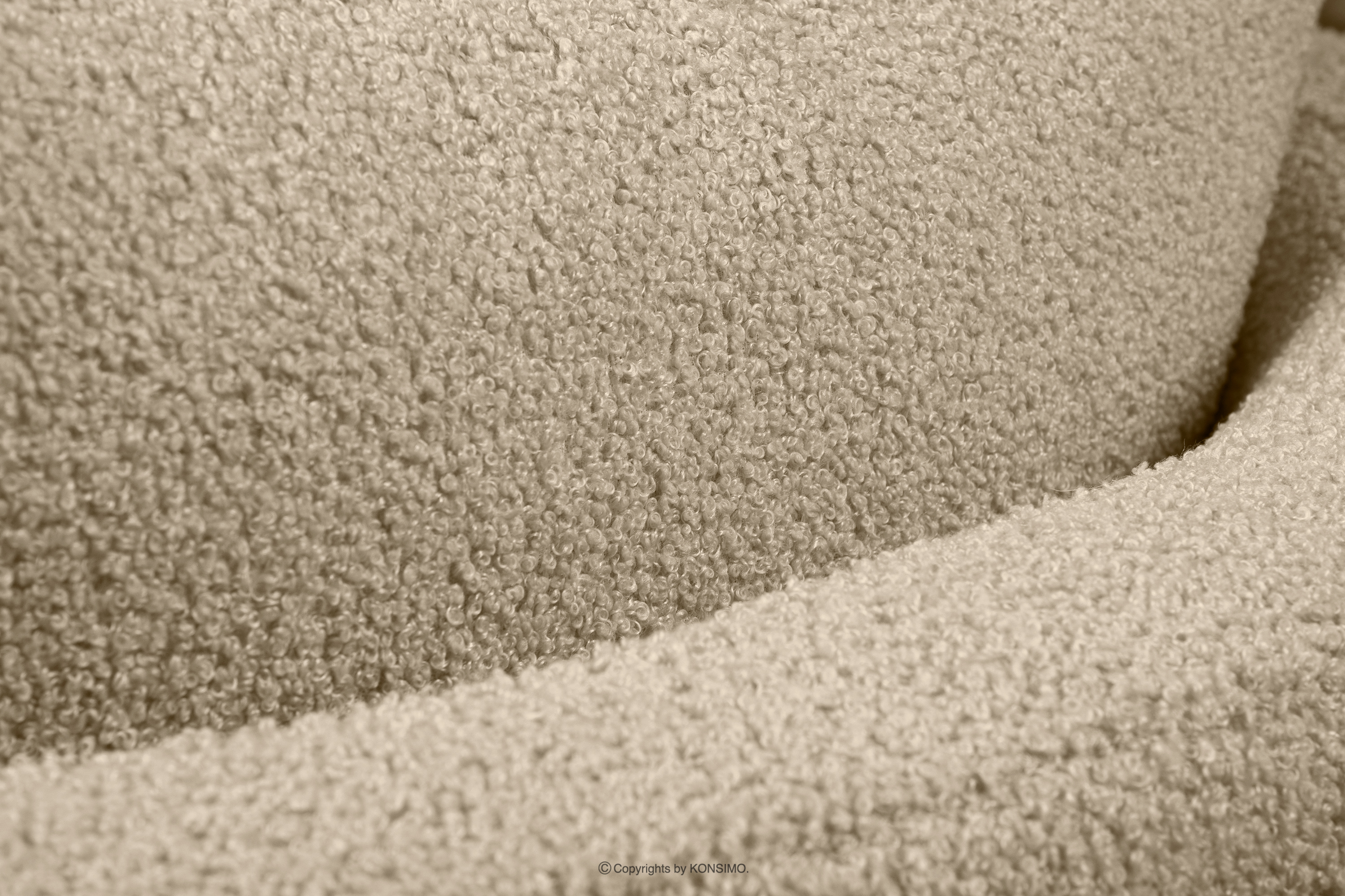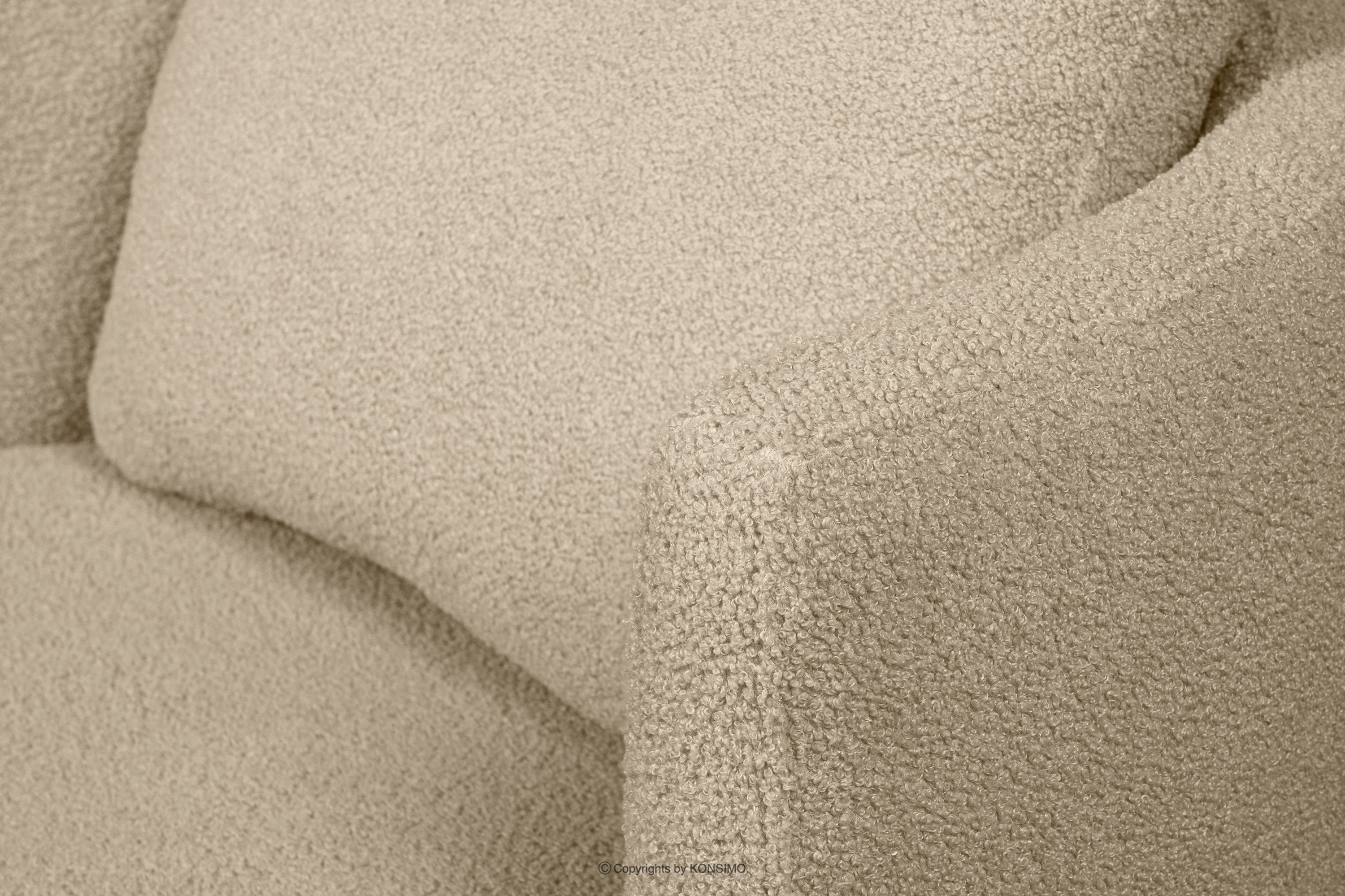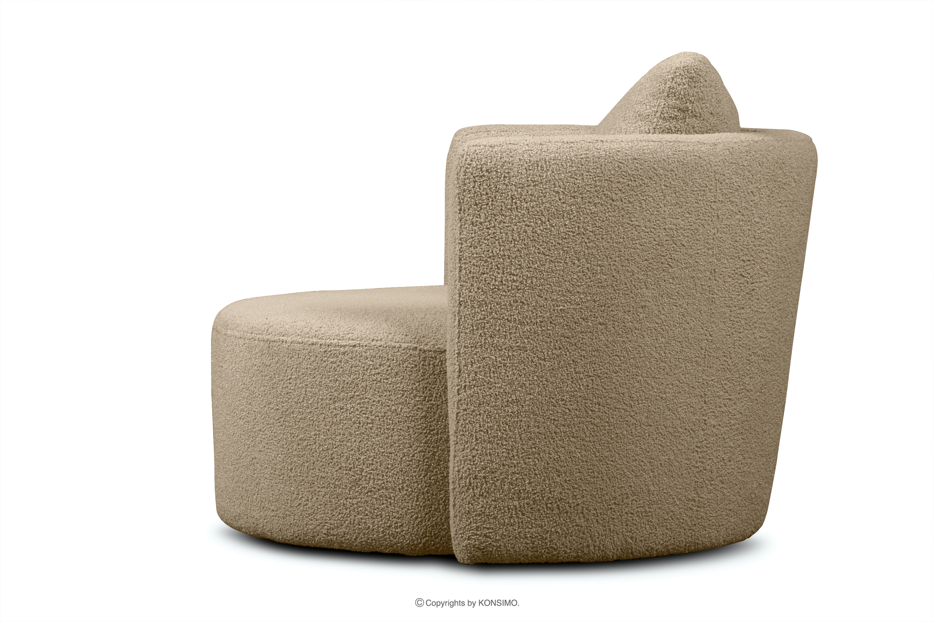 Der beigefarbene drehbare Boucle-Sessel und Hocker RAGGI sind Produkte, die mit ihrem außergewöhnlichen Aussehen jeden anziehen werden. Das Besondere an beiden Elementen ist, dass sie um 360 Grad drehbar sind! Sie sind im modernen Stil gefertigt, passen aber auch zu loftartigen oder sogar boho-Arrangements. Der Sessel ist mit einem sogenannten Bouclé bezogen, das sehr angenehm anzufassen ist.