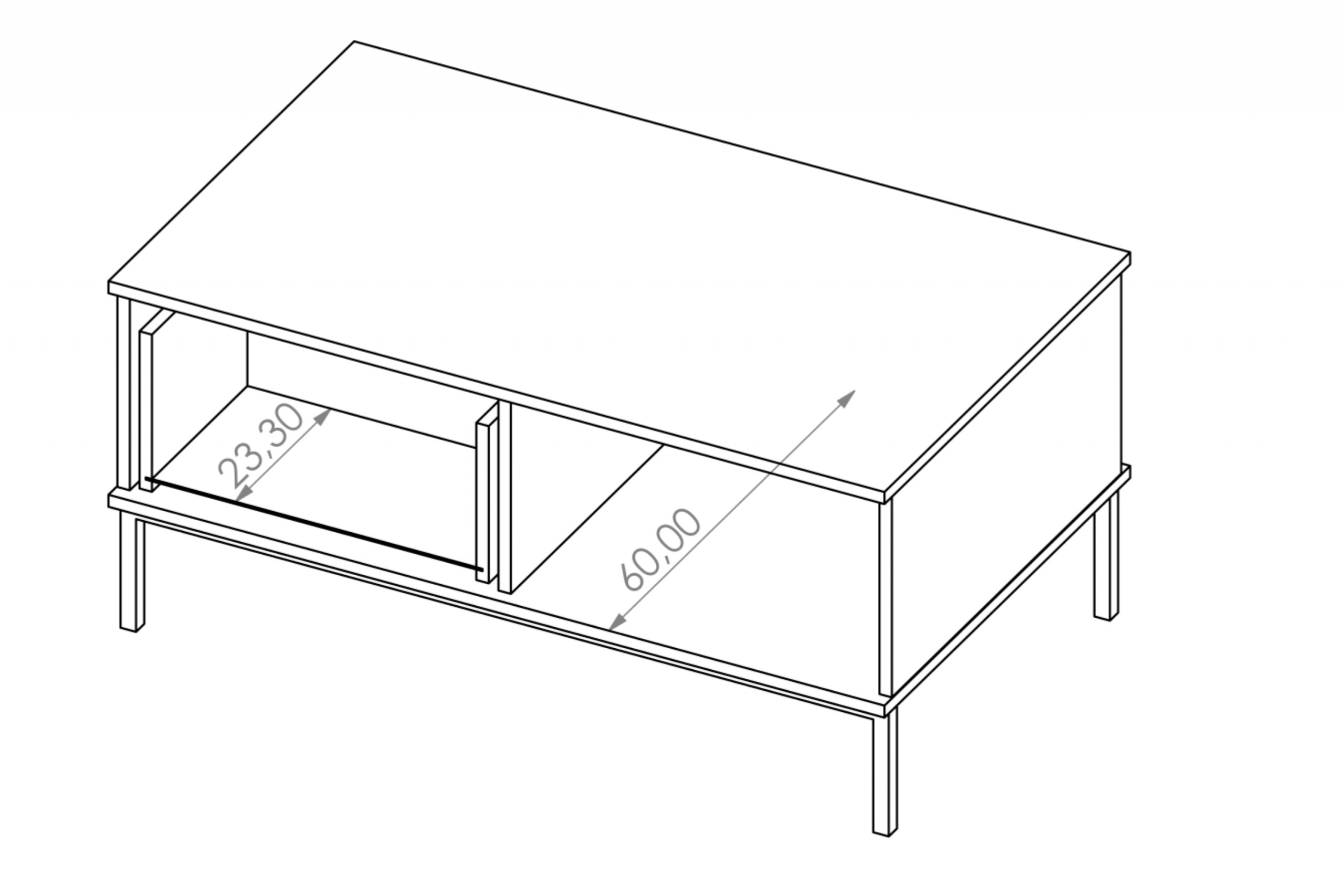 Ein großer Couchtisch auf kleinen Beinen in Schwarz ist ein sehr funktionaler Möbelstück. Eine glatte Tischplatte, keine Griffe, die Push-to-Open-Methode machen ihn für große und kleine Räume geeignet, die keine zusätzlichen Dekorationen benötigen. Es genügt, die entsprechende Stelle an der Vorderseite der Schublade zu drücken, um sie zu öffnen oder zu schließen.