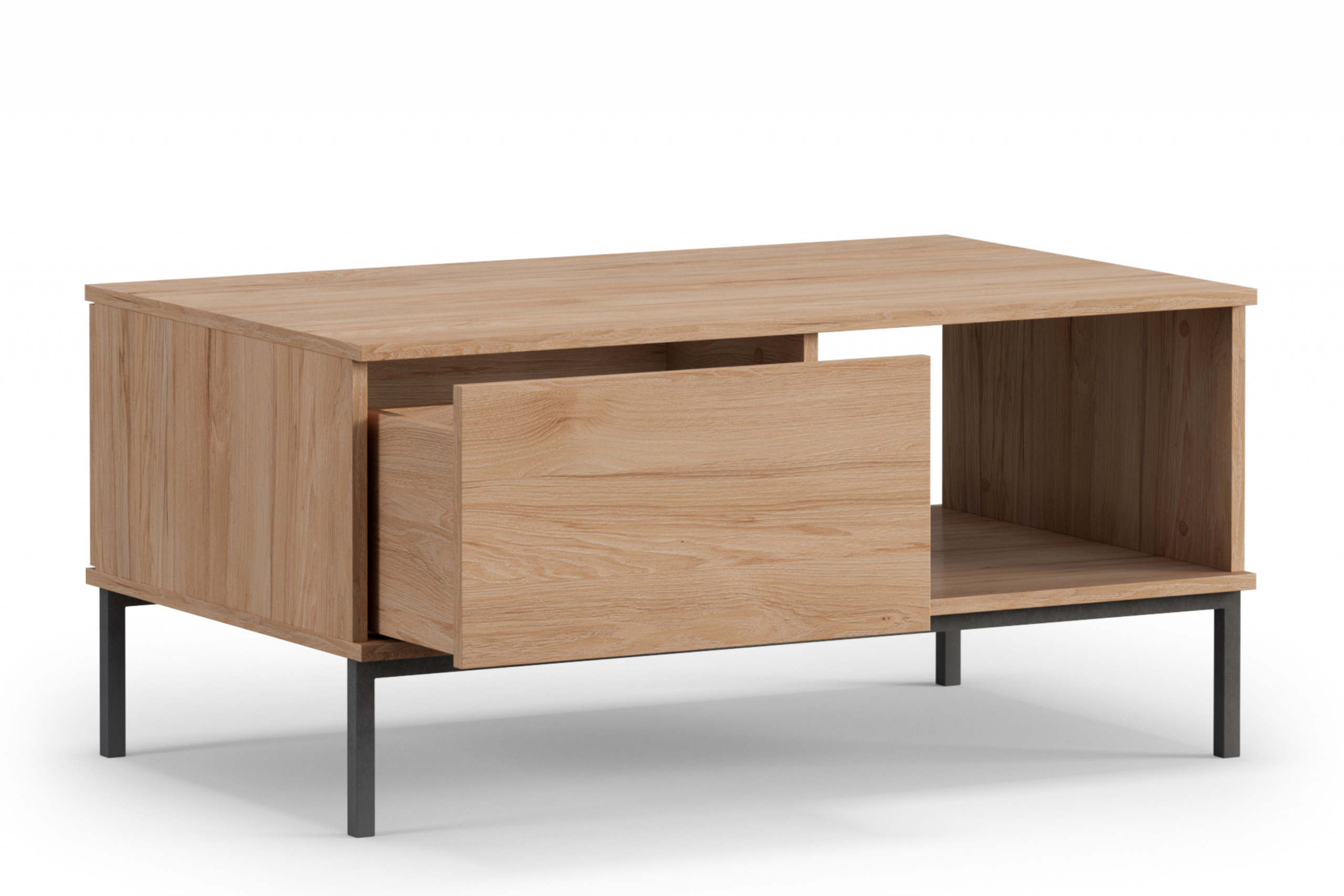 Der hickory Couchtisch auf Beinen für das Wohnzimmer ist ein sehr funktionales Möbelstück. Die glatte Tischplatte, das Fehlen von Griffen, die Push-to-Open-Methode machen ihn geeignet für große und kleine Räume, die keine zusätzliche Dekoration benötigen. Es reicht, den entsprechenden Bereich an der Vorderseite der Schublade zu drücken, um sie zu öffnen oder zu schließen.