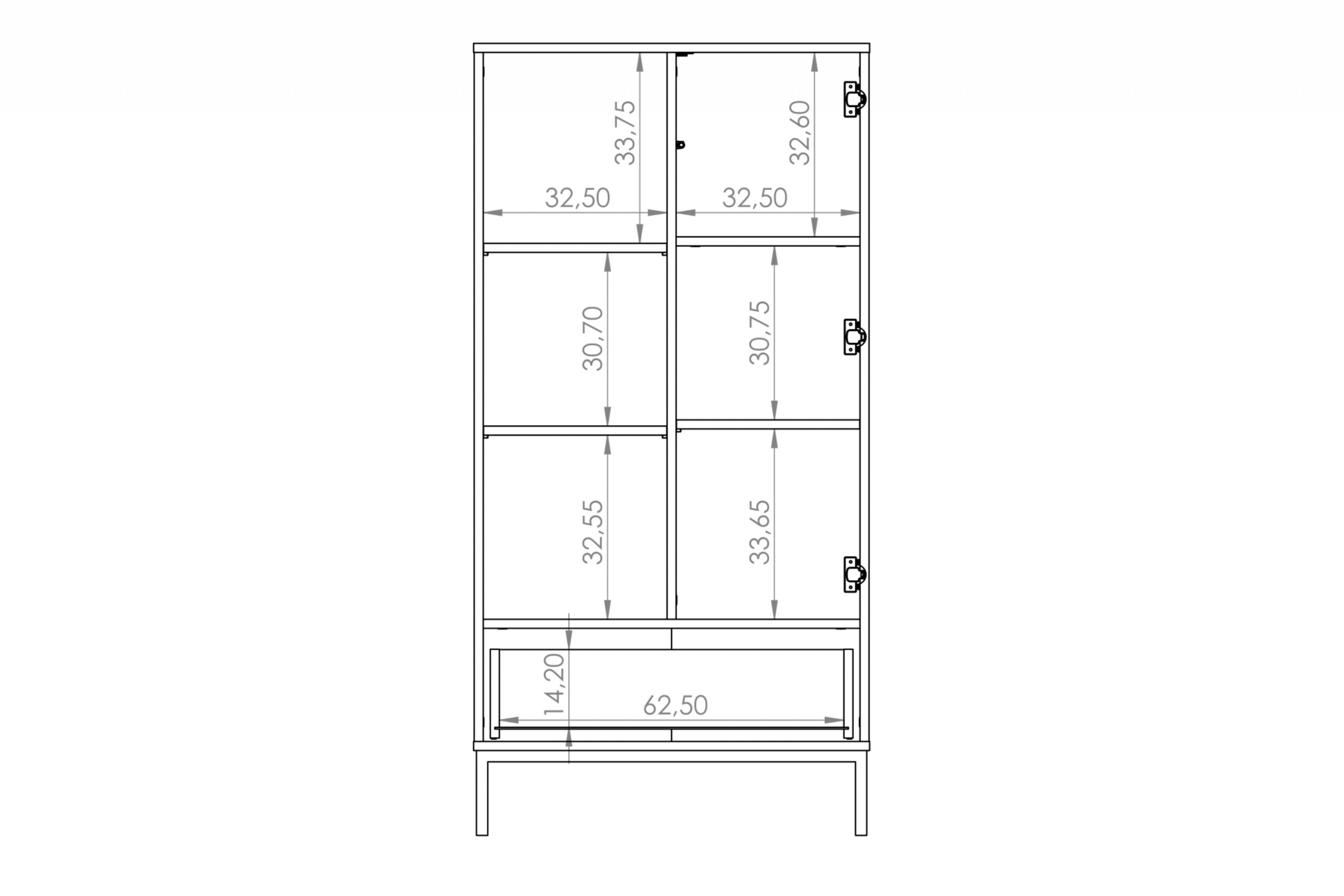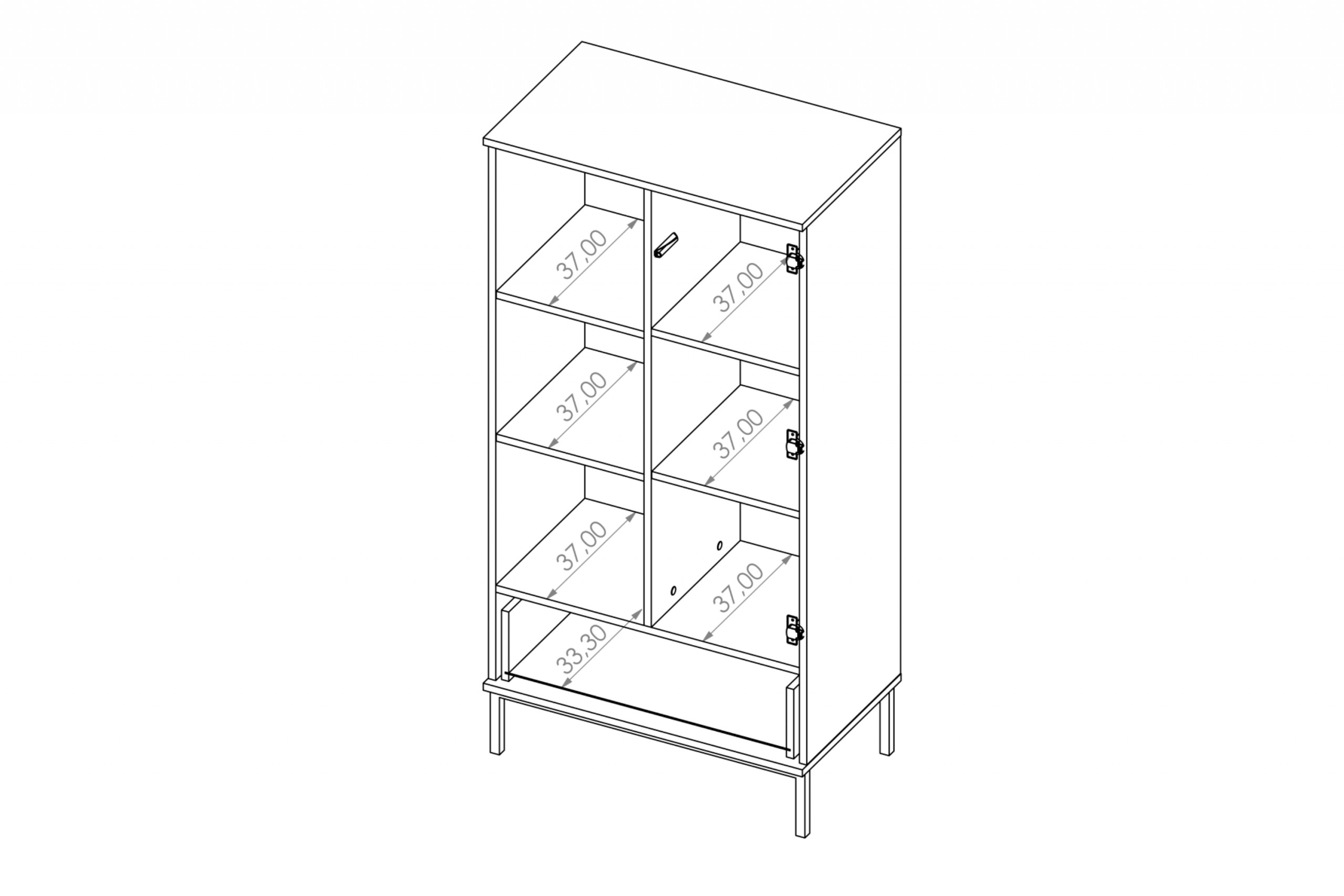 Schwarz klassischer teilweise geschlossener Regal auf Beinen ist ein sehr funktionales Möbelstück mit interessantem Design. Es hat keine unnötigen Verzierungen oder Griffe, die Türen werden mit der Push-to-Open-Methode geöffnet. Die Regalböden ermöglichen es, Dekorationen und Bilderrahmen auszustellen. Das Regal steht auf hohen metallischen Beinen. Dank ihnen ist es einfacher, Ordnung im Raum zu halten und problemlos passt ein Reinigungsroboter darunter.
