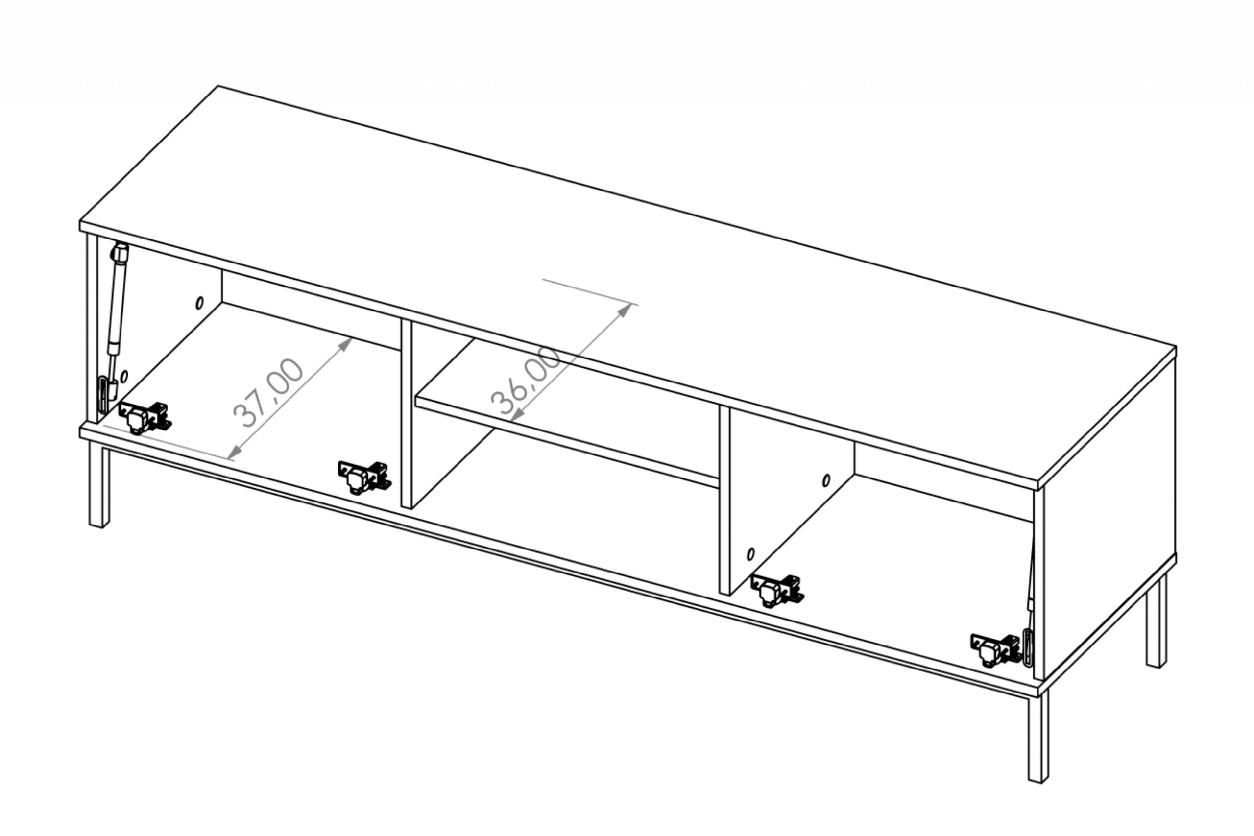 Schwarzer TV-Schrank mit kleinen Beinen und Regalen ist ein sehr funktionaler Möbelstück mit interessantem Design. Es hat keine unnötigen Verzierungen oder Griffe, die Türen werden mit der Push-to-Open-Methode geöffnet. Auf dem Regal können Sie einen Decoder, eine Konsole oder andere alltägliche Gegenstände stellen. Der TV-Schrank steht auf hohen Metallbeinen. Dank ihnen ist es einfacher, Ordnung im Raum zu halten, und der Reinigungsroboter passt problemlos unter das Möbelstück.