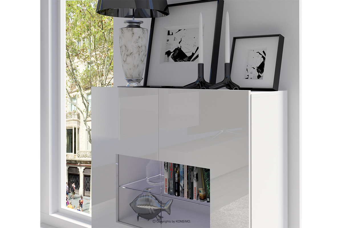 für das Produkt Moderner Schrank mit Vitrine beleuchtet weiß glänzend