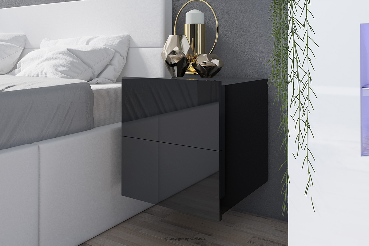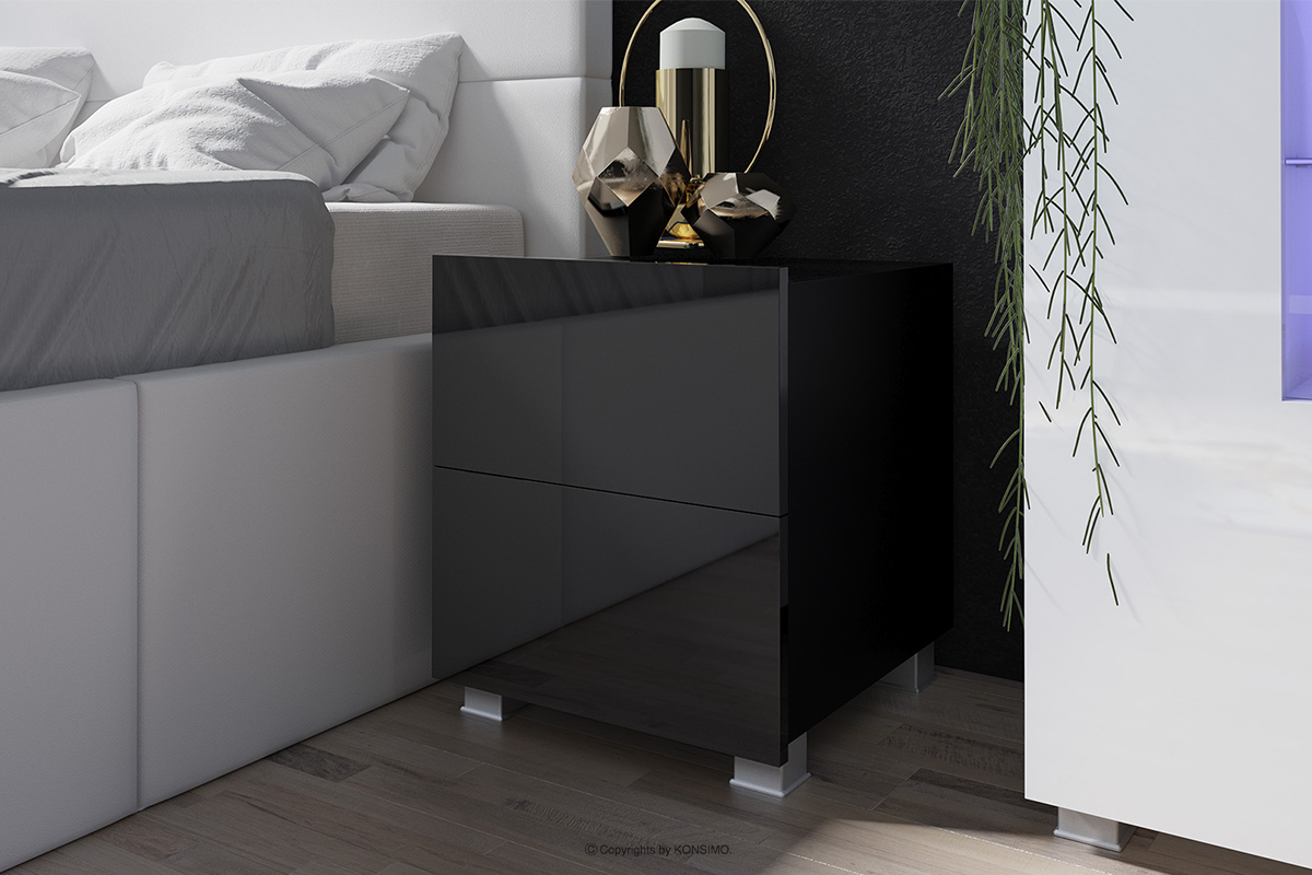 So sehen unsere Nachtkästchen in glänzendem Schwarz und mattem Schwarz aus. Eine sehr interessante Anordnung ermöglicht es Ihnen, dieses Schmuckstück an Ihr eigenes Schlafzimmer anzupassen.