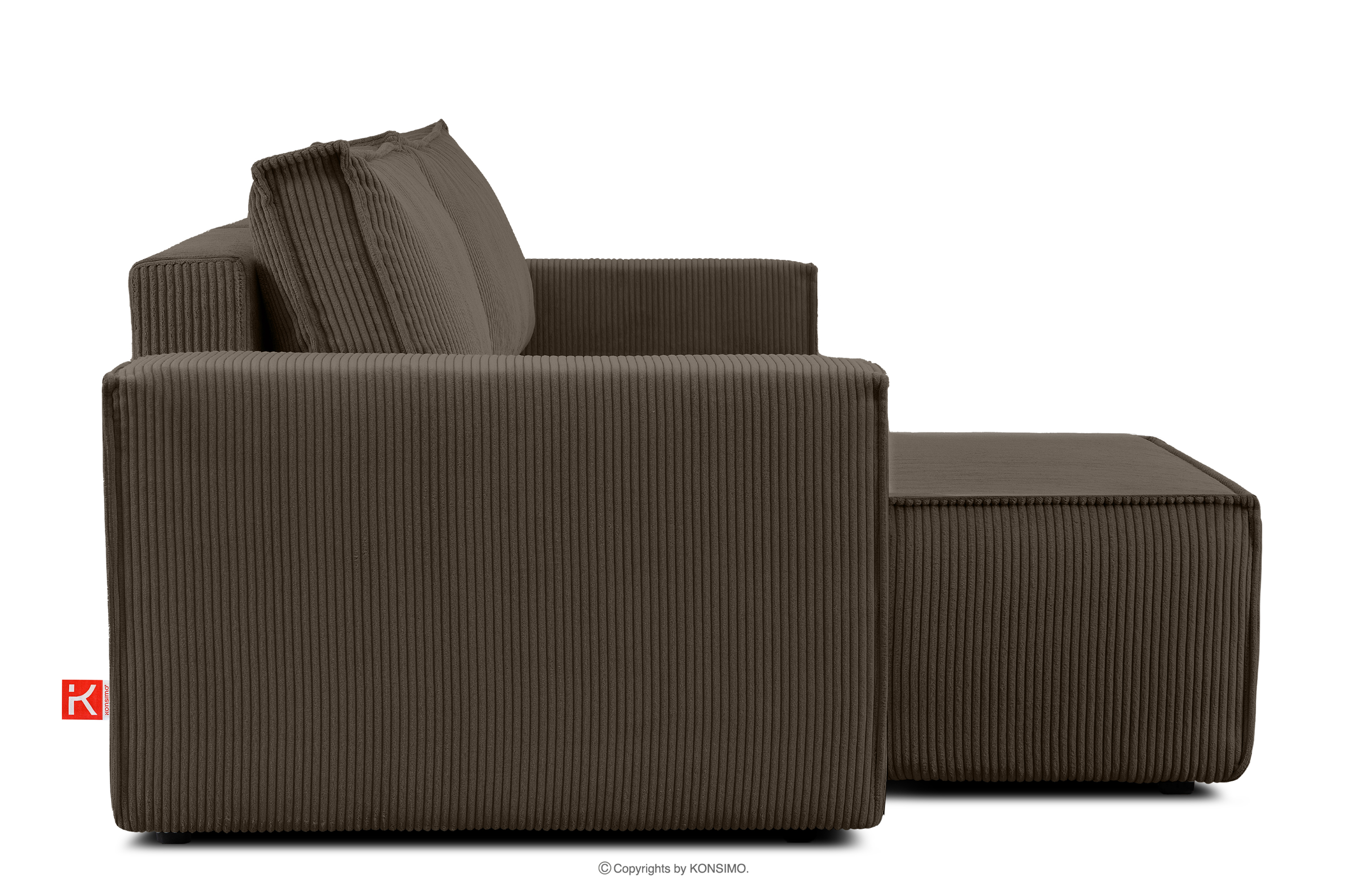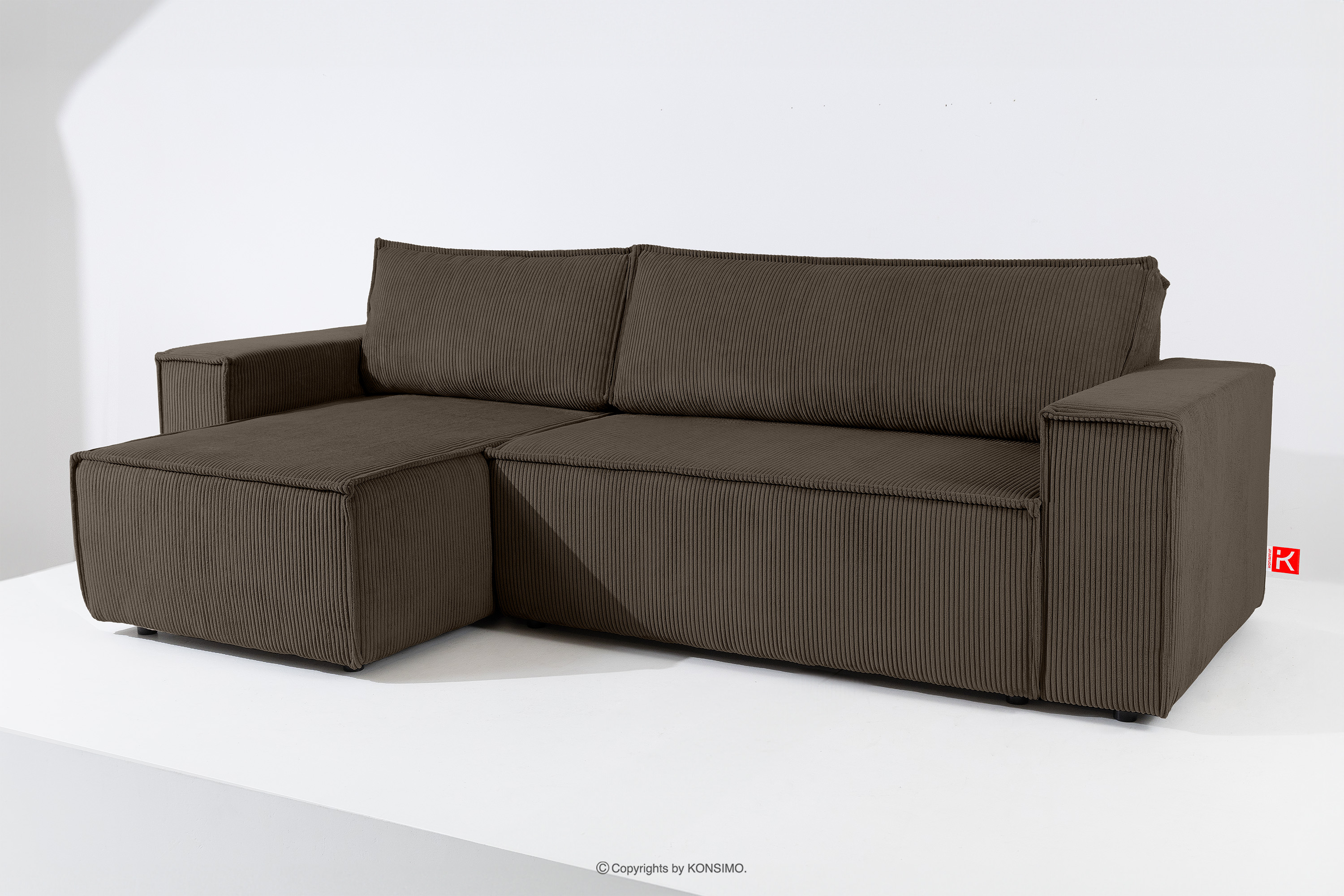 Das universelle Ecksofa mit Schlaffunktion braun rechts/links ist ein Möbelstück im modernistischen Stil. Mit seinen charakteristischen breiten Seiten hebt es sich von der Masse der Standardmöbel ab. Aber das ist nur der Anfang seiner außergewöhnlichen Möglichkeiten. Es ist ein universelles Ecksofa, das heißt, es hat die zusätzliche Eigenschaft, dass es selbst entscheiden kann, auf welcher Seite Sie die Liege haben möchten.