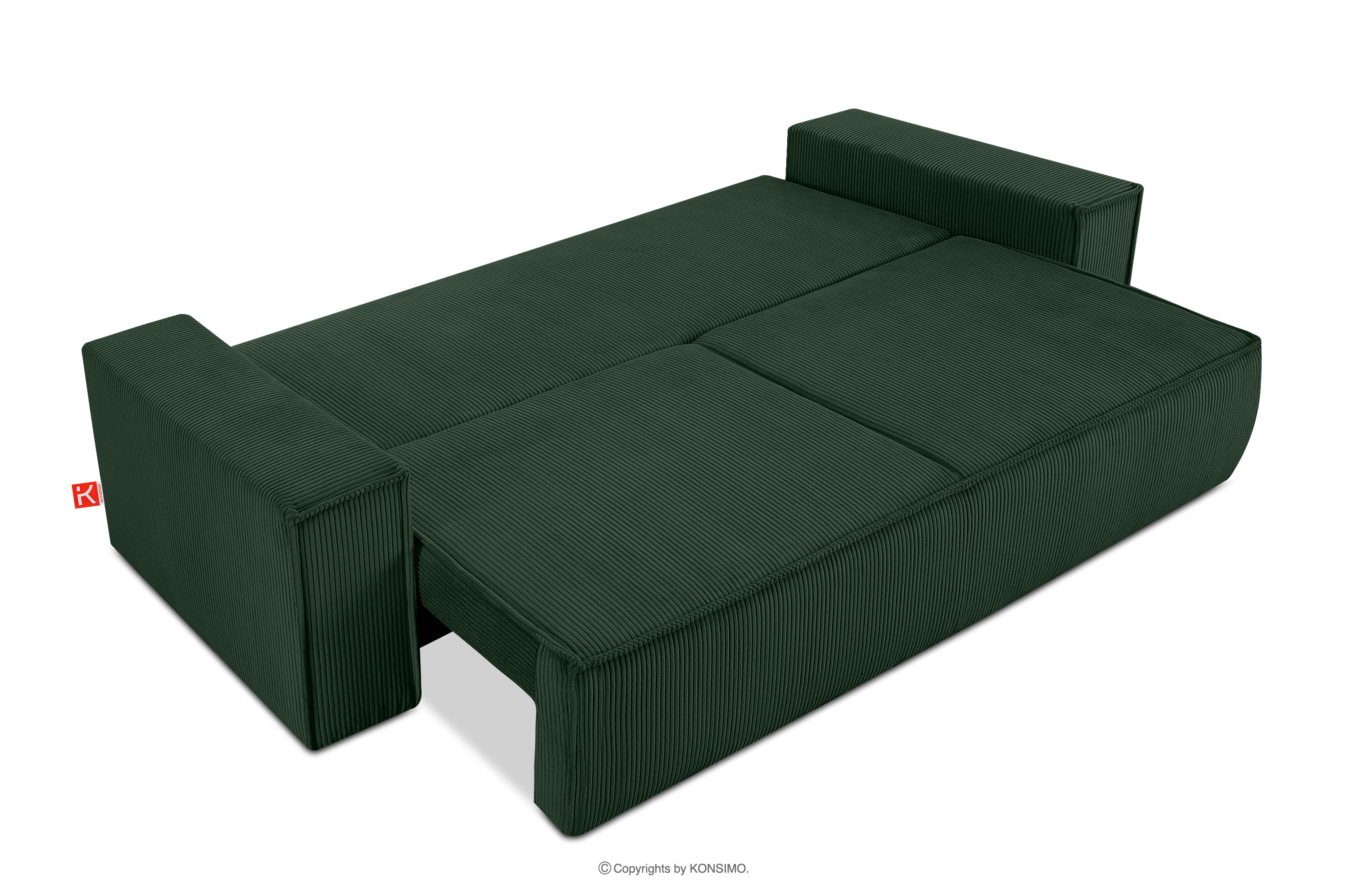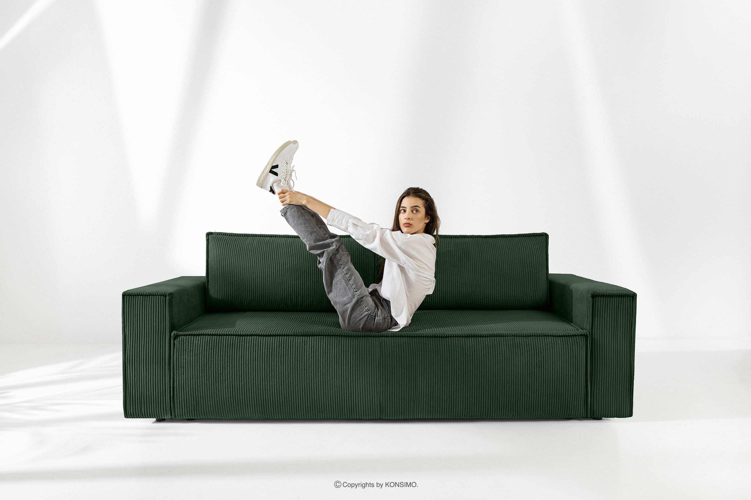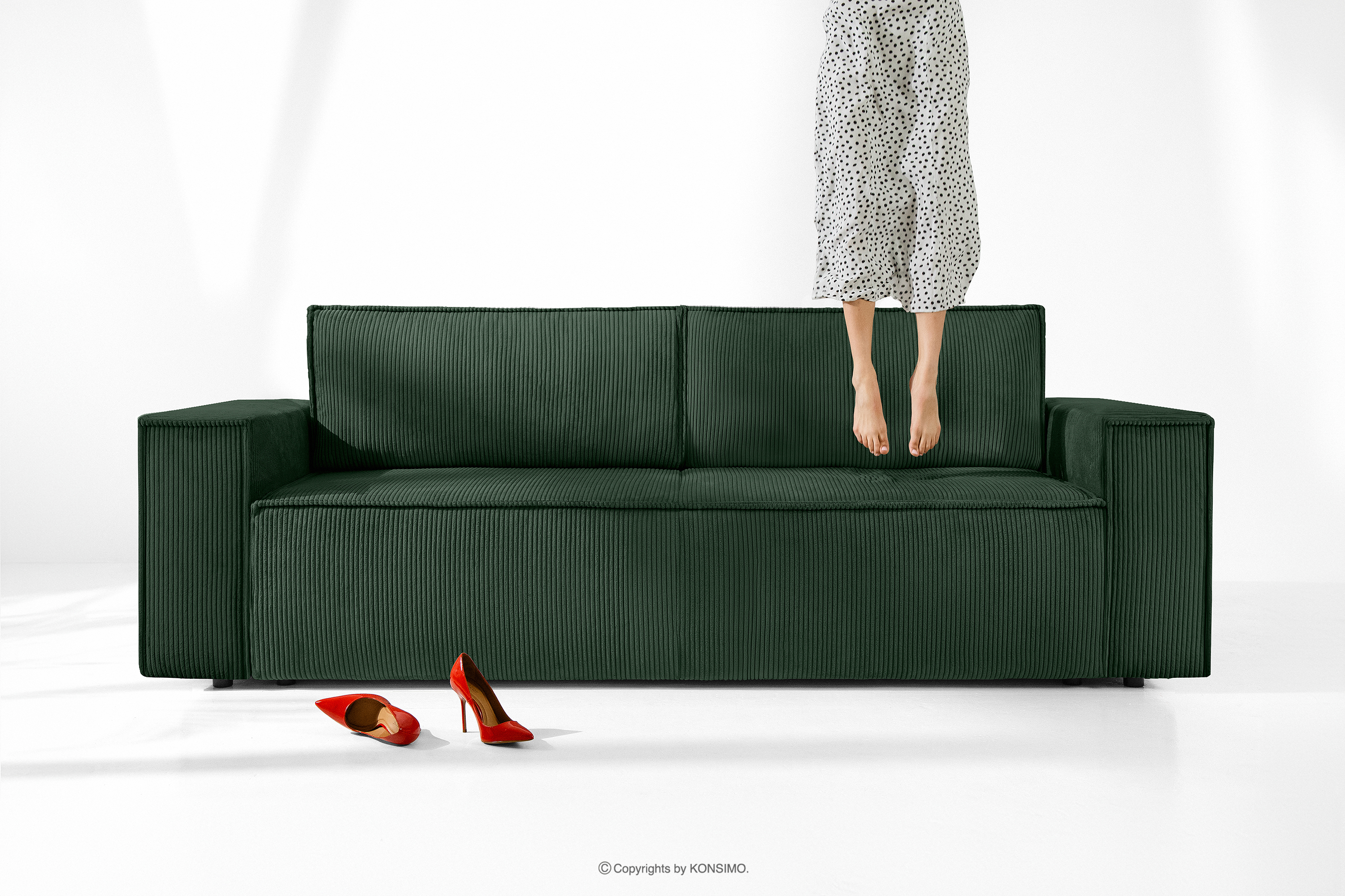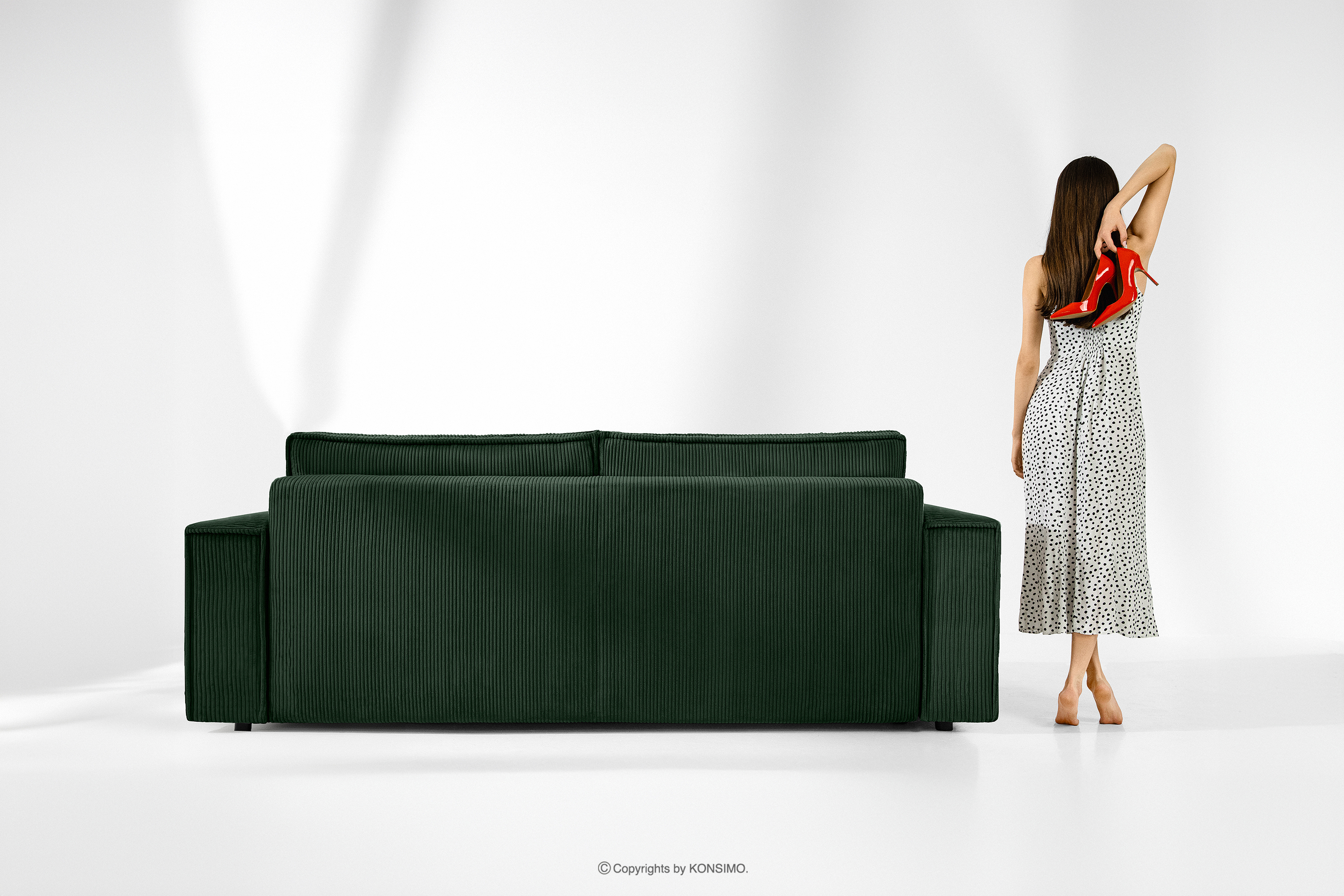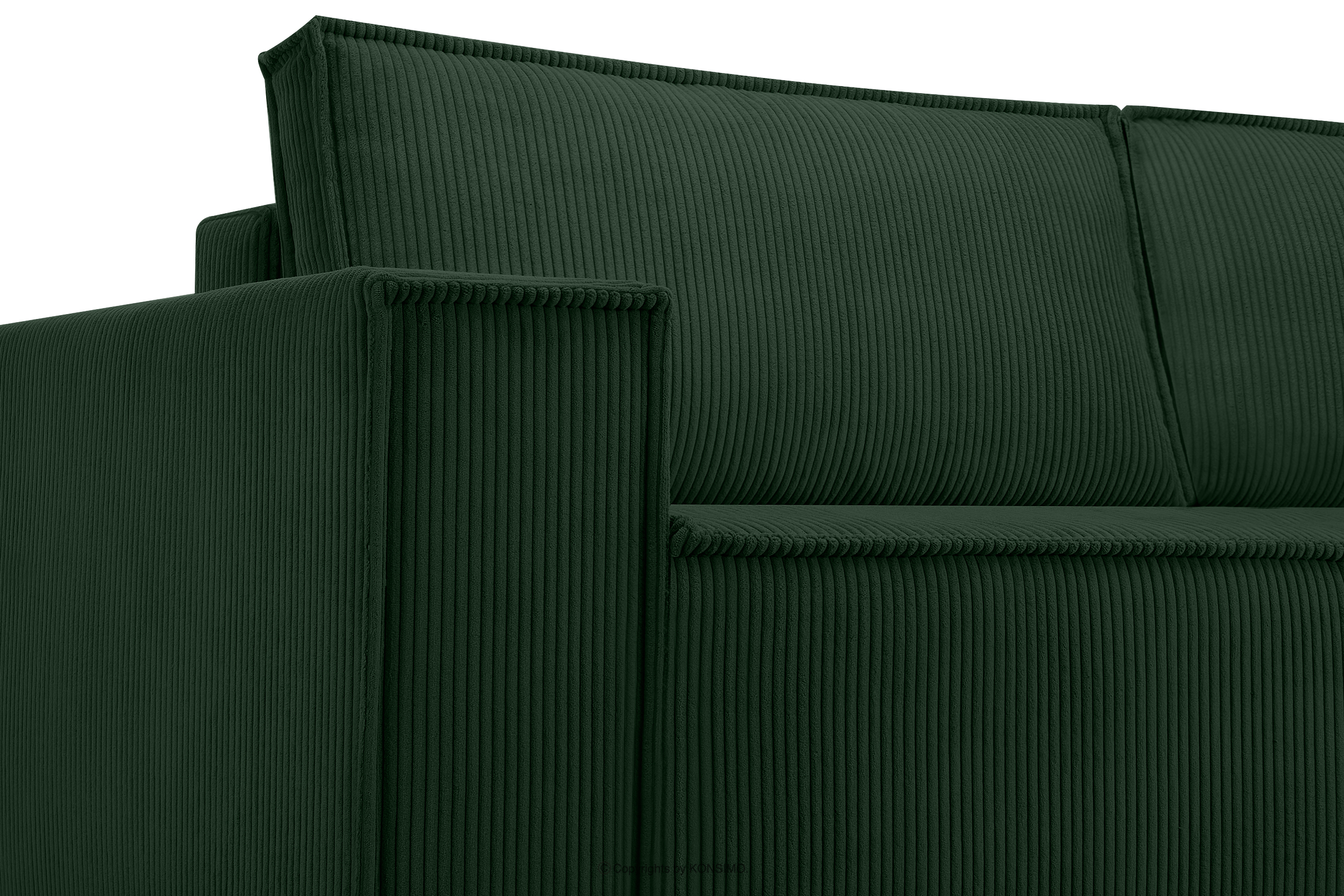 Das 3-Sitzer-Sofa mit Bettkasten in Dunkelgrün ist ein Möbelstück im modernistischen Stil. Mit seinen charakteristischen breiten Seiten hebt es sich von der Masse der Standardmöbel ab. Aber das ist nur der Anfang seiner außergewöhnlichen Möglichkeiten. Die Kissen der Rückenlehne sind die perfekte Stütze für Ihren Rücken und sehen dank ihrer Größe auch noch gut aus.
