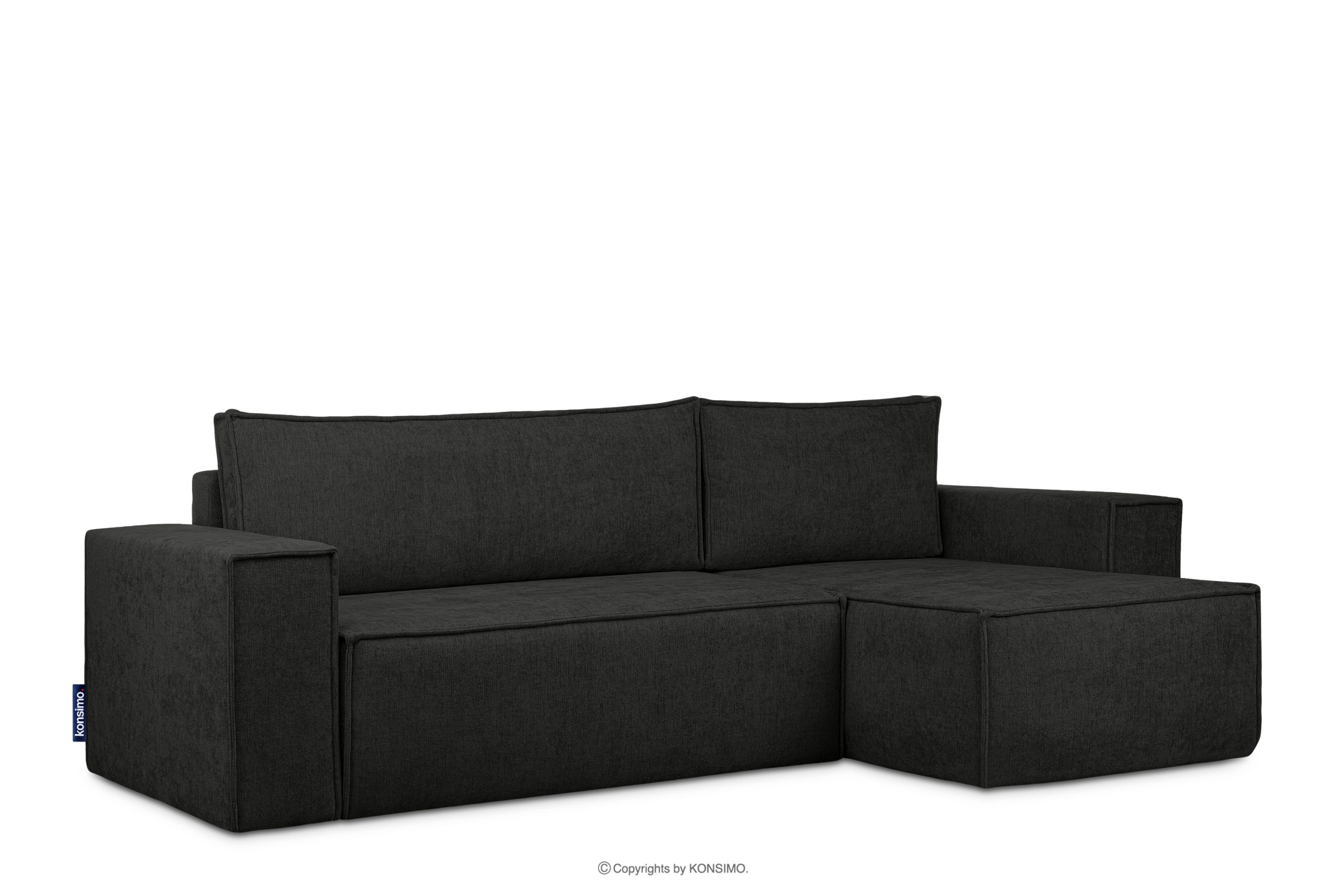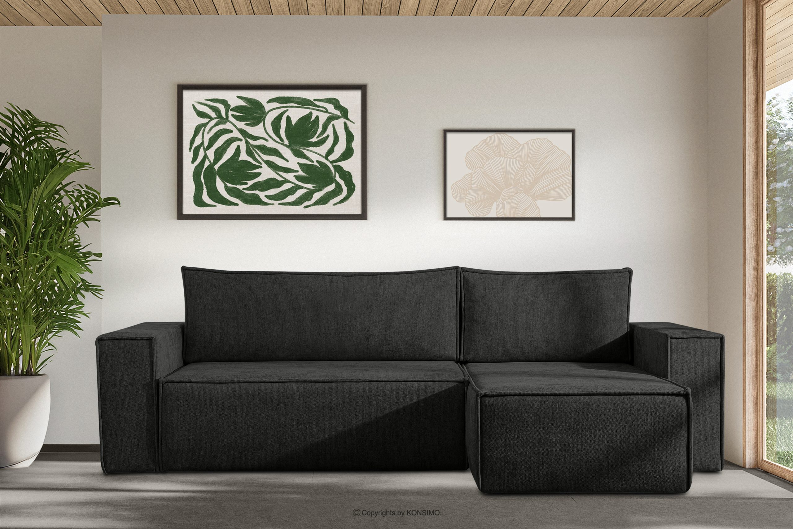 Das Ecksofa aus gewebtem Stoff mit Schlaffunktion anthrazit links/rechts ist ein Möbelstück im modernistischen Stil. Es hat breite Seiten des Typs HAWAI, wodurch es sich besser für größere Räume eignet. Da es sich um ein universelles Ecksofa handelt, hat es eine zusätzliche Funktion: Sie können selbst wählen, auf welcher Seite Sie das Sofa haben möchten.