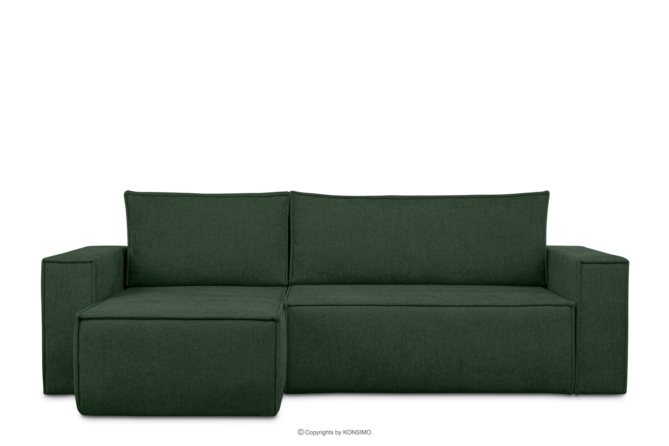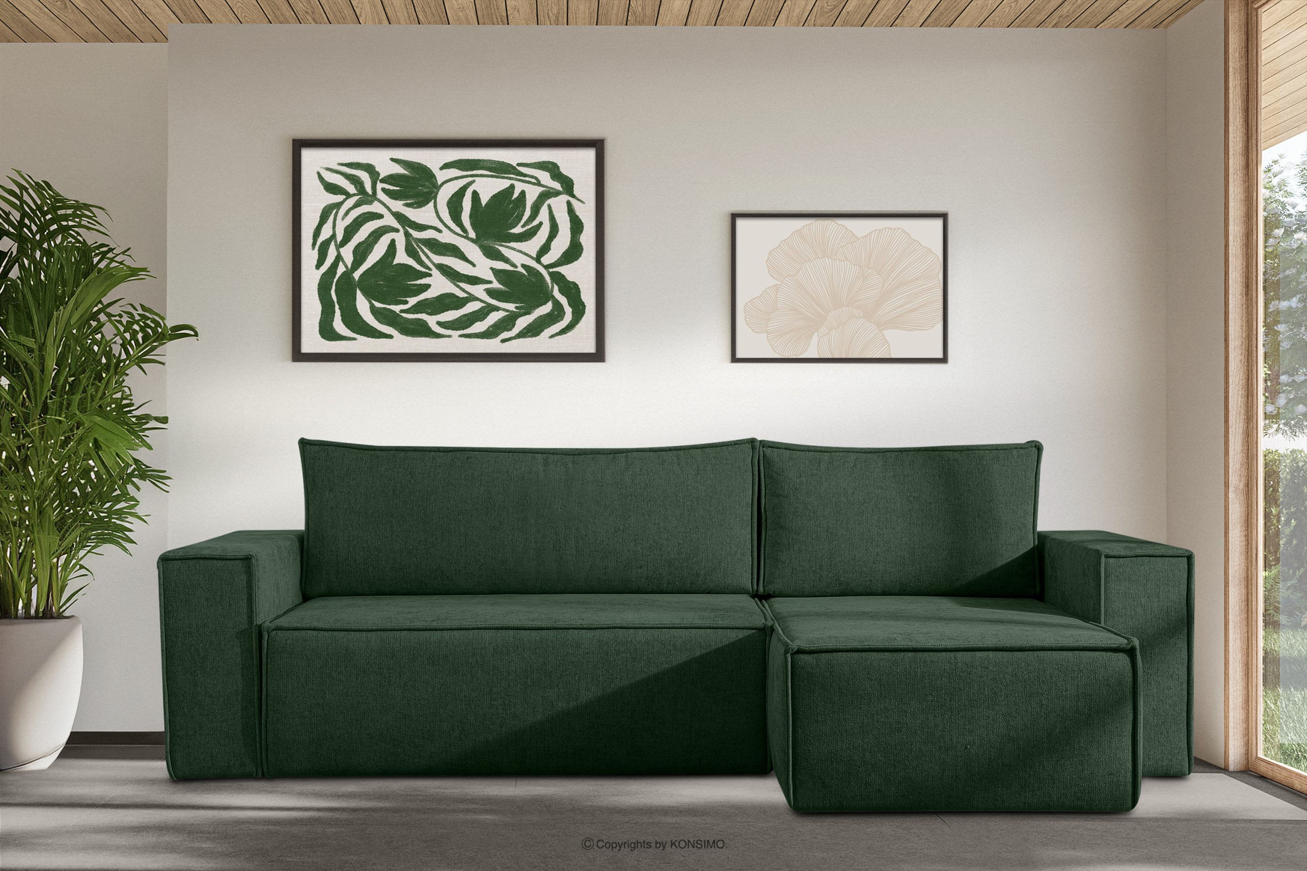 Das Ecksofa in geflochtenem Stoff mit Schlaffunktion grün links/rechts ist ein Möbelstück im modernistischen Stil. Es hat breite Seiten vom Typ HAWAI, wodurch es sich besser für größere Räume eignet. Es ist ein universelles Ecksofa, d.h. es hat eine zusätzliche Funktion, nämlich die, dass Sie selbst wählen können, auf welcher Seite Sie die Couch haben möchten.